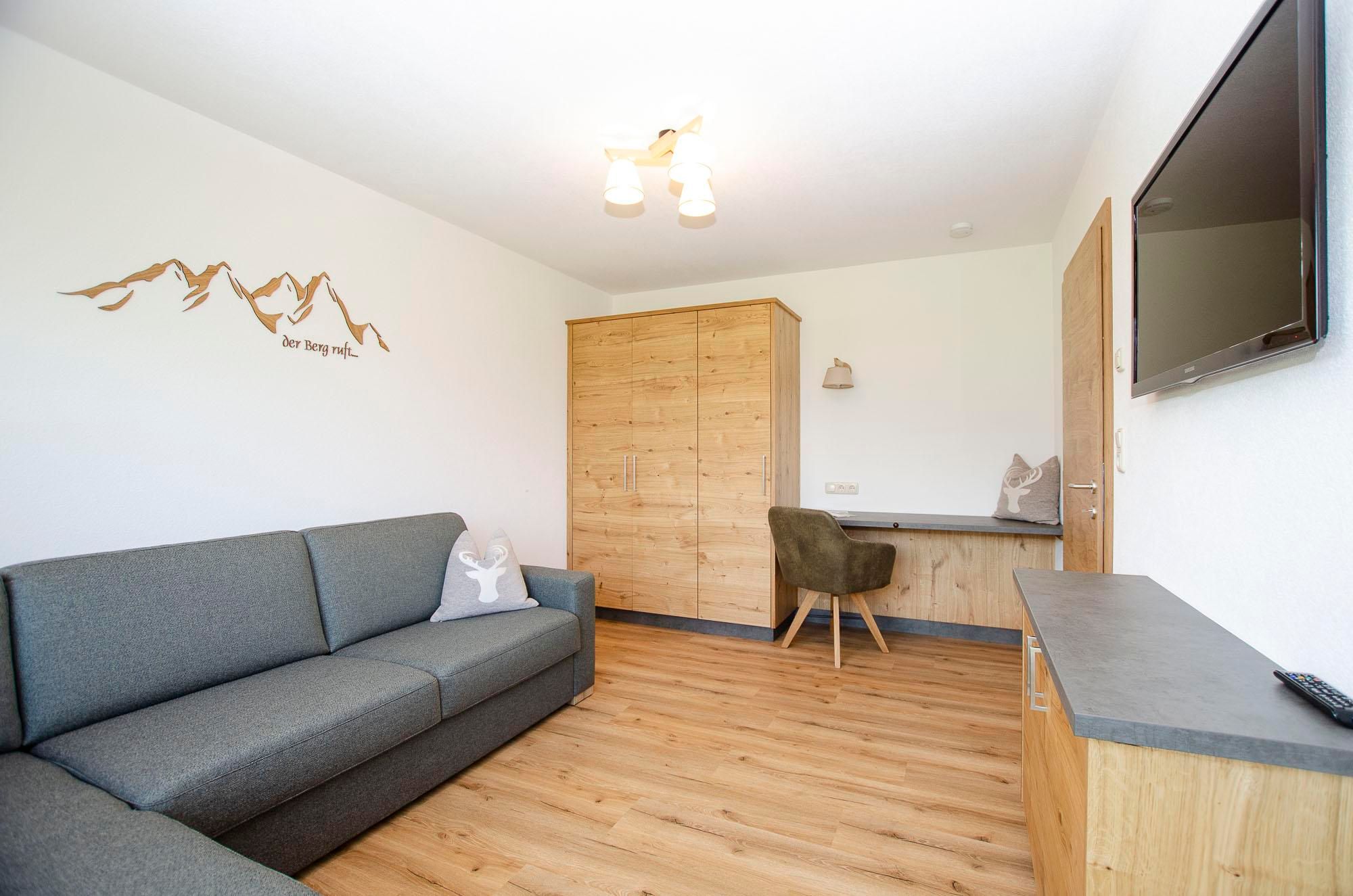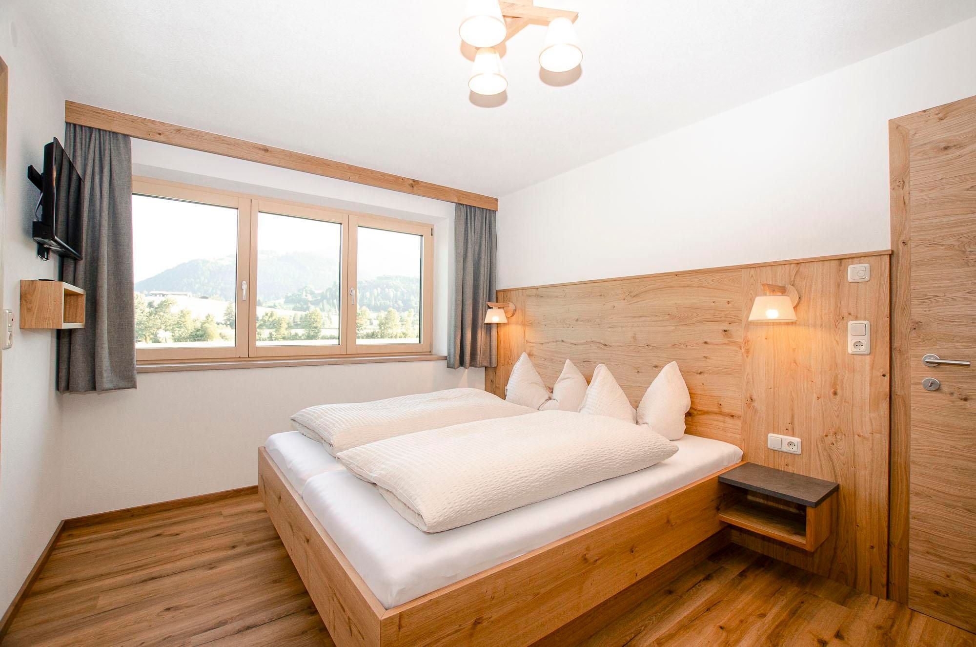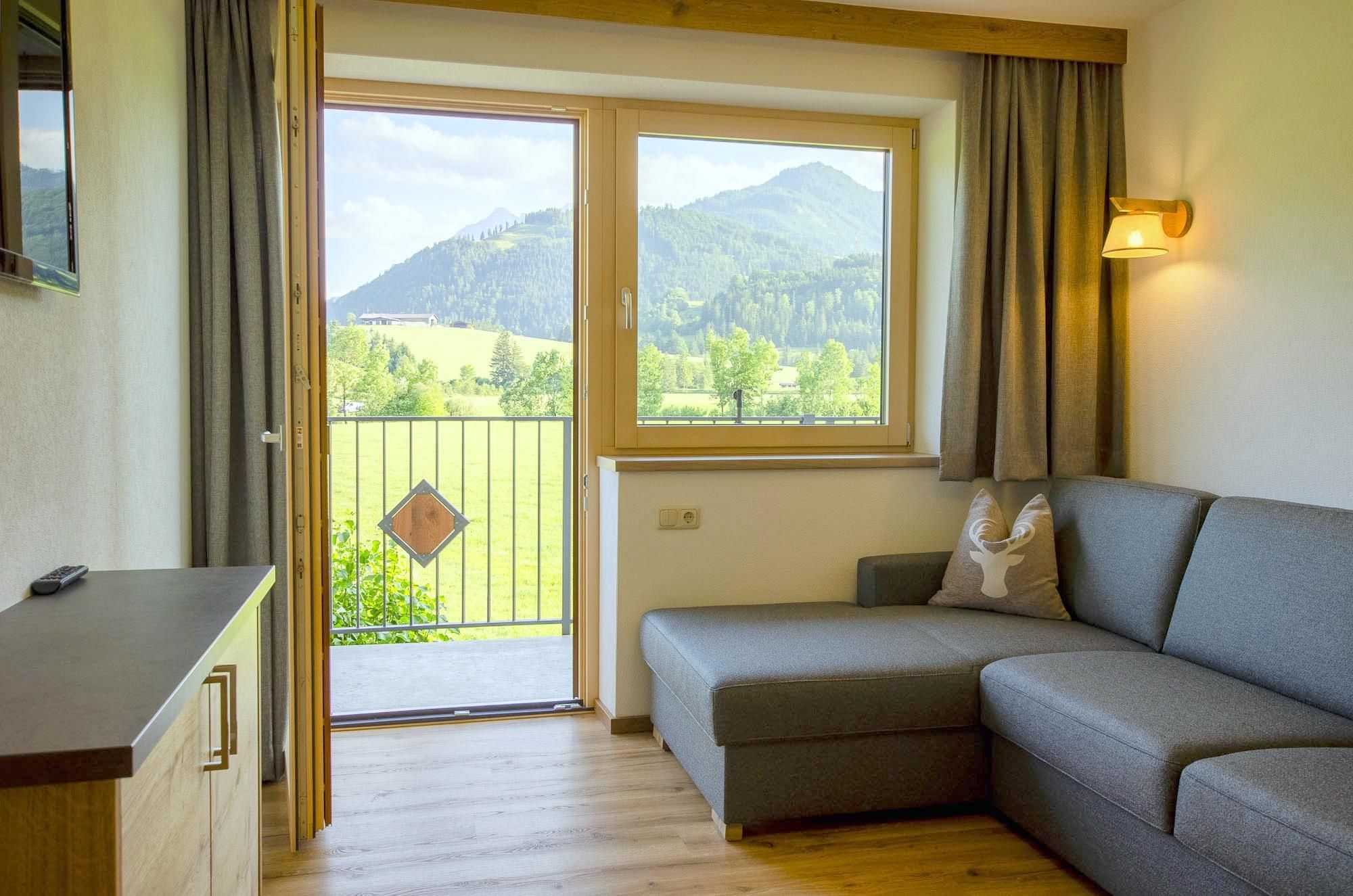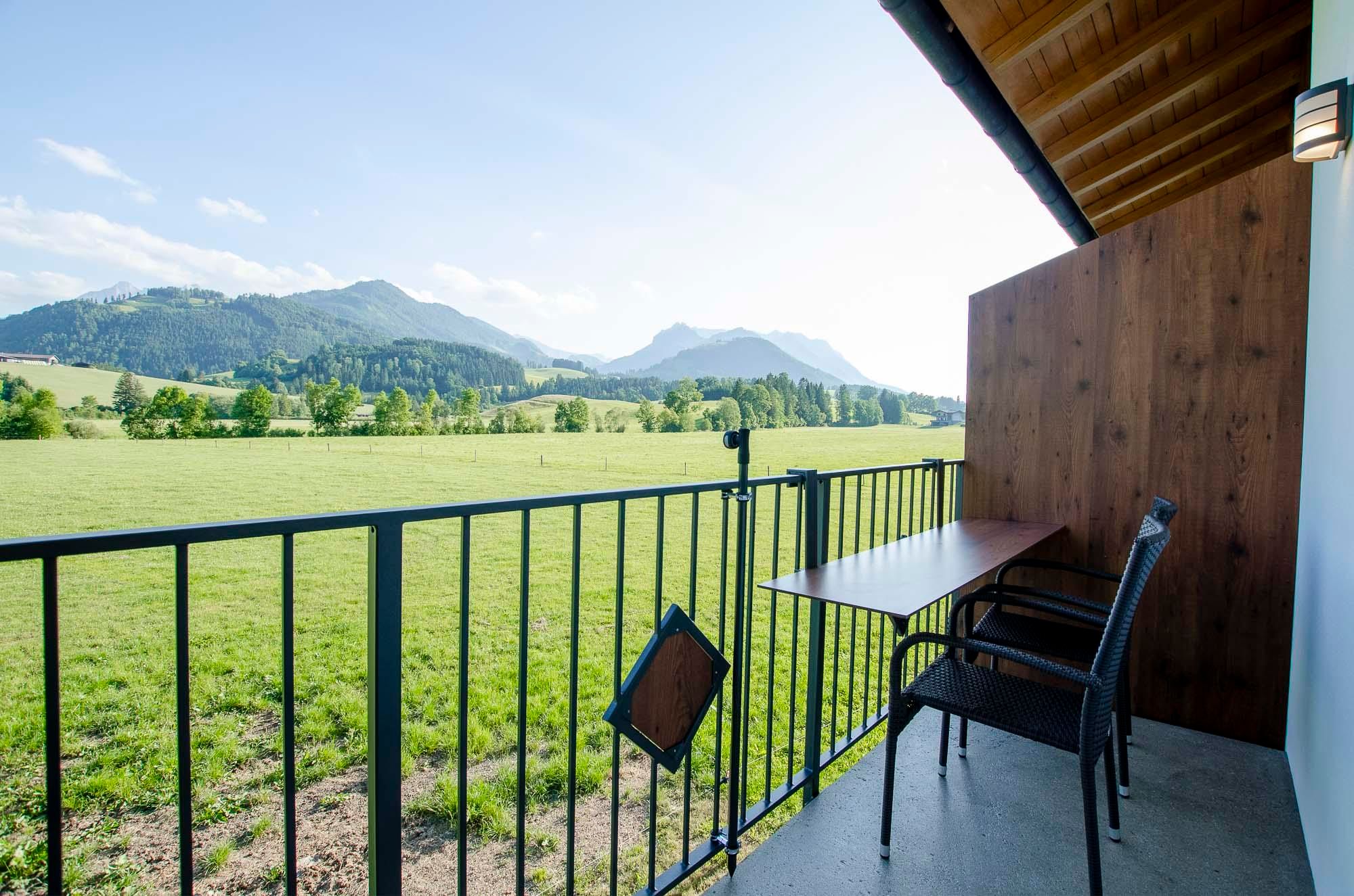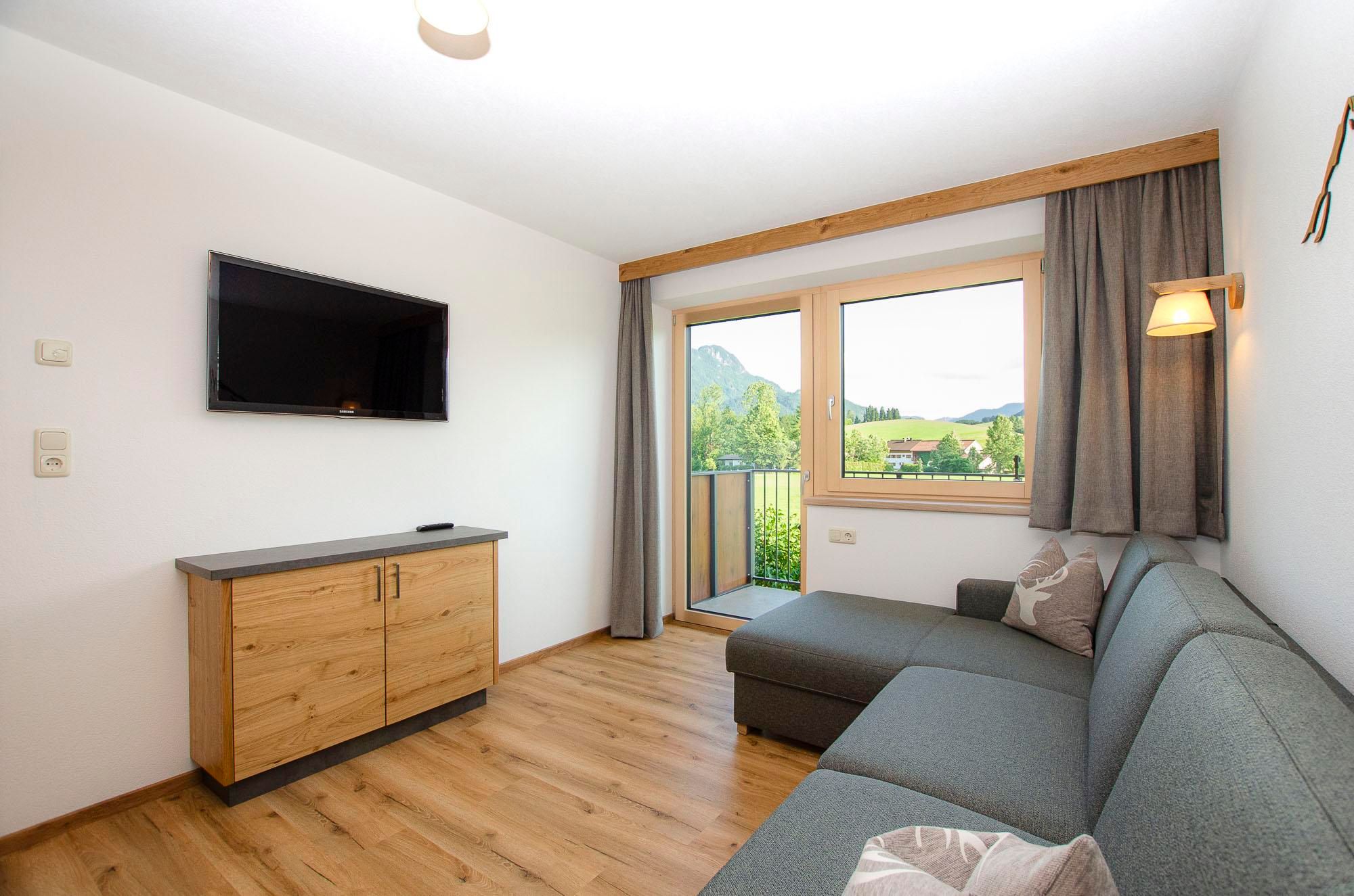 Verbringen Sie Ihren Urlaub in einer unserer komplett neuen Ferienwohnungen mit Balkon, Geschirrspüler und TV oder in unserem komfortablen Erkerzimmer mit Kachelofen und genießen Sie von allen Wohnungen aus einen schönen Ausblick auf das herrliche Bergpanorama und den Zahmen Kaiser.
