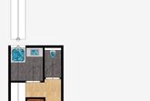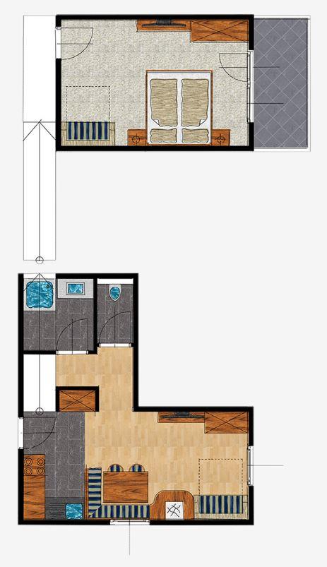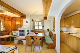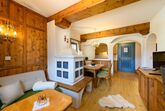 Die Wohnküche mit Sitzecke und gemütlicher Couch liegt im Erdgeschoß. Das Schlafzimmer mit Doppelbett und Doppel-Schlafcouch ist über eine Treppe erreichbar und verfügt über einen Zugang zum Balkon.