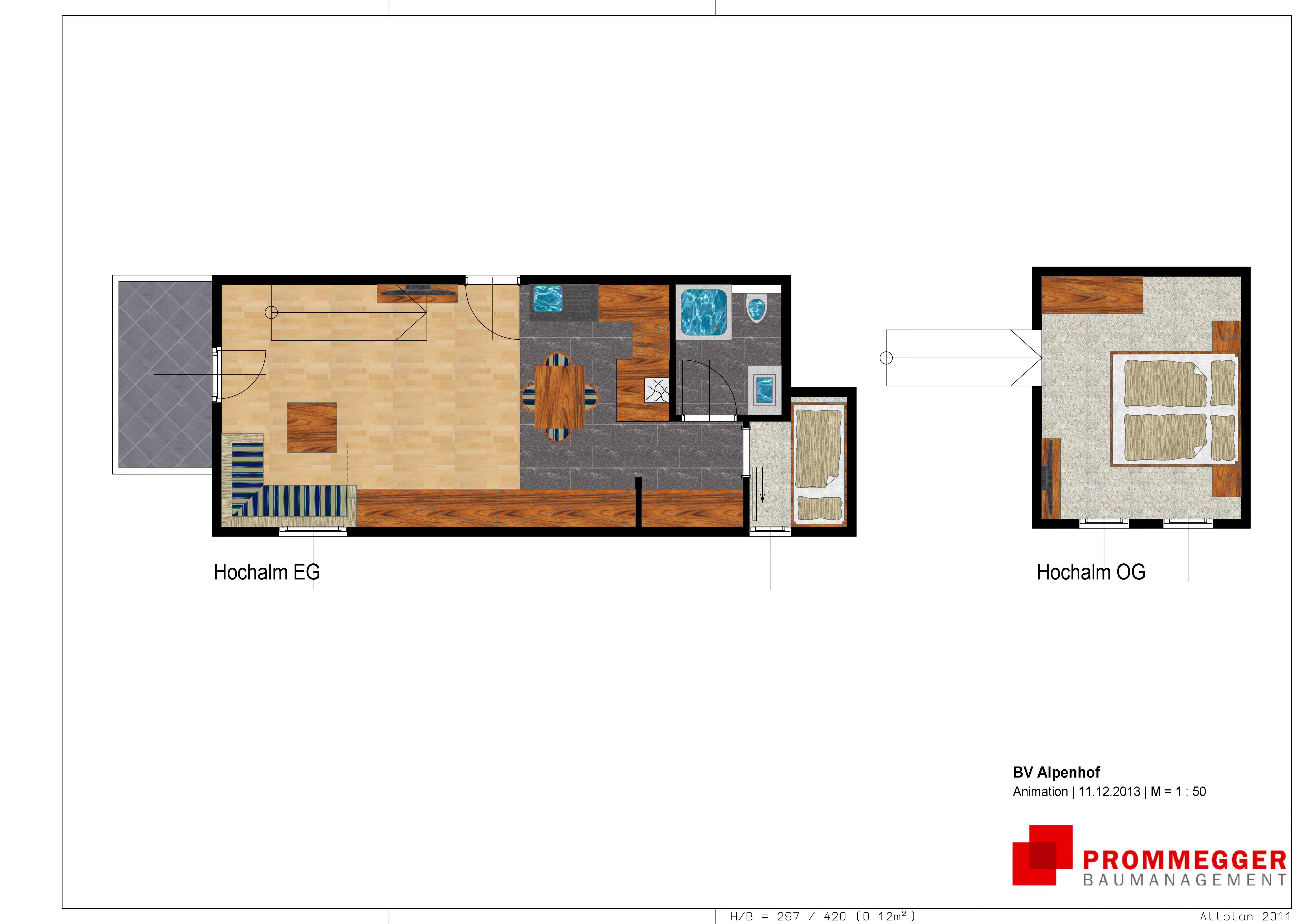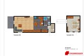 Die im 1.Stock liegende Ferienwohnung verfügt über eine große Wohnküche mit Zugang zum Balkon. Das Kinderzimmer mit einem Stockbett liegt mit der ausziehbaren Couch auf einer Ebene. Das Schlafzimmer mit Doppelbett ist über eine Treppe erreichbar.