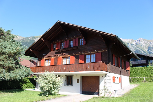 Grosses, von einem Park umgebenes, ruhig gelegenes Chalet. Wunderschöne Aussicht auf die Berge. Balkon und Terrasse mit Süd-Ausrichtung.