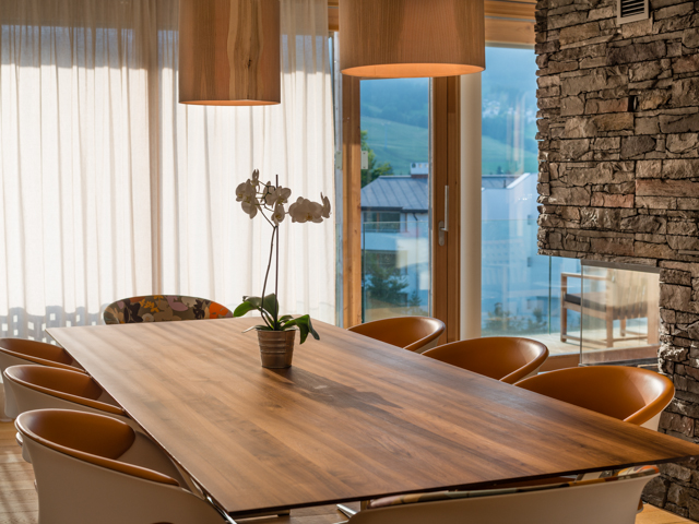 Luxuriöse 4.5 Zimmerwohnung 3 Schlafzimmer mit TV und jeweils eigenem Badezimmer mit Badewanne (teilweise freistehend im Zimmer) oder Dusche, 240m2 Wohnfläche mit Fussbodenheizung in der Luxus-Ferienwohnungresidenz The Mountain Suites. Nur 10 Gehminuten von der Talstation Flims entfernt. Verfügbar für max. 6 Erwachsene und 2 Kinder. Die Wohnung befindet sich im Hauptteil und liegt im 4. Obergeschoss mit Blickrichtung Nordost und bietet fantastische Aussicht auf die umliegende Bergwelt (Crap Sogn Gion, Tschingelhörner und Flimserstein). Der Wohn- & Kochbereich verfügt über ein Cheminée, grossen Esstisch und gemütliche Couchgarnitur. Die Küche ist hochwertig ausgestattet mit Kühlschrank inkl. Gefrierfach, Weinkühlschrank, Induktionskochfeld, Backofen, Geschirrspüler, Nespresso-Kaffeemaschine (Kapseln können beim Concierge gekauft werden) mit Milchschäumer, Ipod-Dockingstation, Handschuhtrockner und vielem mehr.