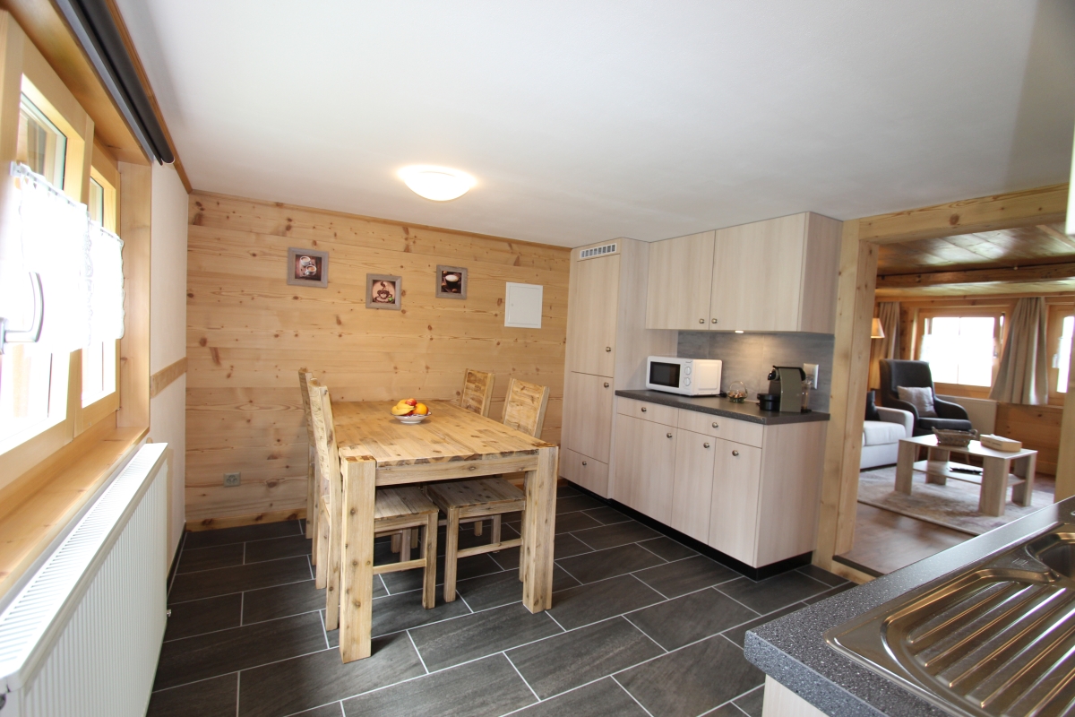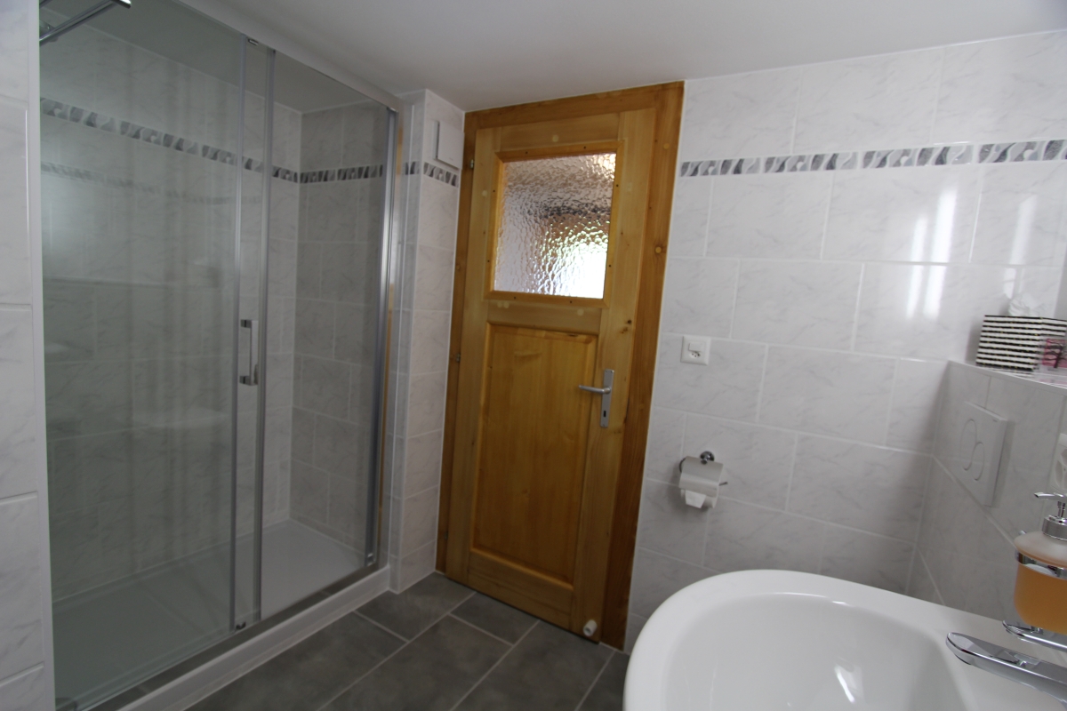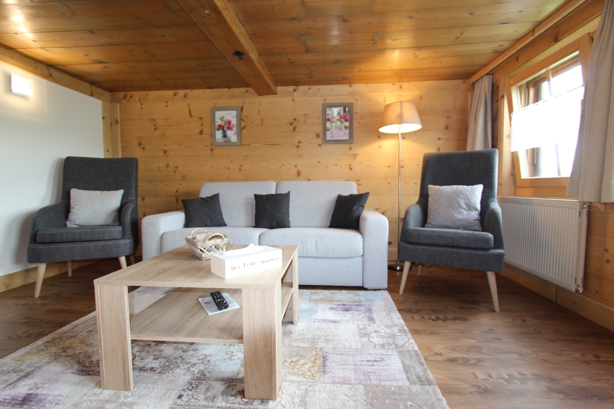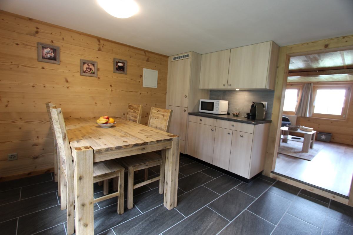 Erdgeschoss : grosses Wohnzimmer, separate Küche (Backofen, Kühlschrank, Tiefkühler, Geschirrspüler, Mikrowellen-Ofen, Kaffeemaschine, Wasserkocher, Toaster, Fondue-Set, Raclette-Set), 1 Doppelzimmer, 1 Schlafcouch im Wohnzimmer, 1 Bad mit Waschbecken, WC und grosser Dusche. Eingangsdiele. Im Aussenbereich gemeinsamer Abstellraum. Aussenbereich : 1 kleine Terrasse mit Esstisch und Gartenmöbeln, Garten. 1 nichtüberdachter reservierter Parkplatz.