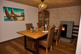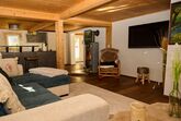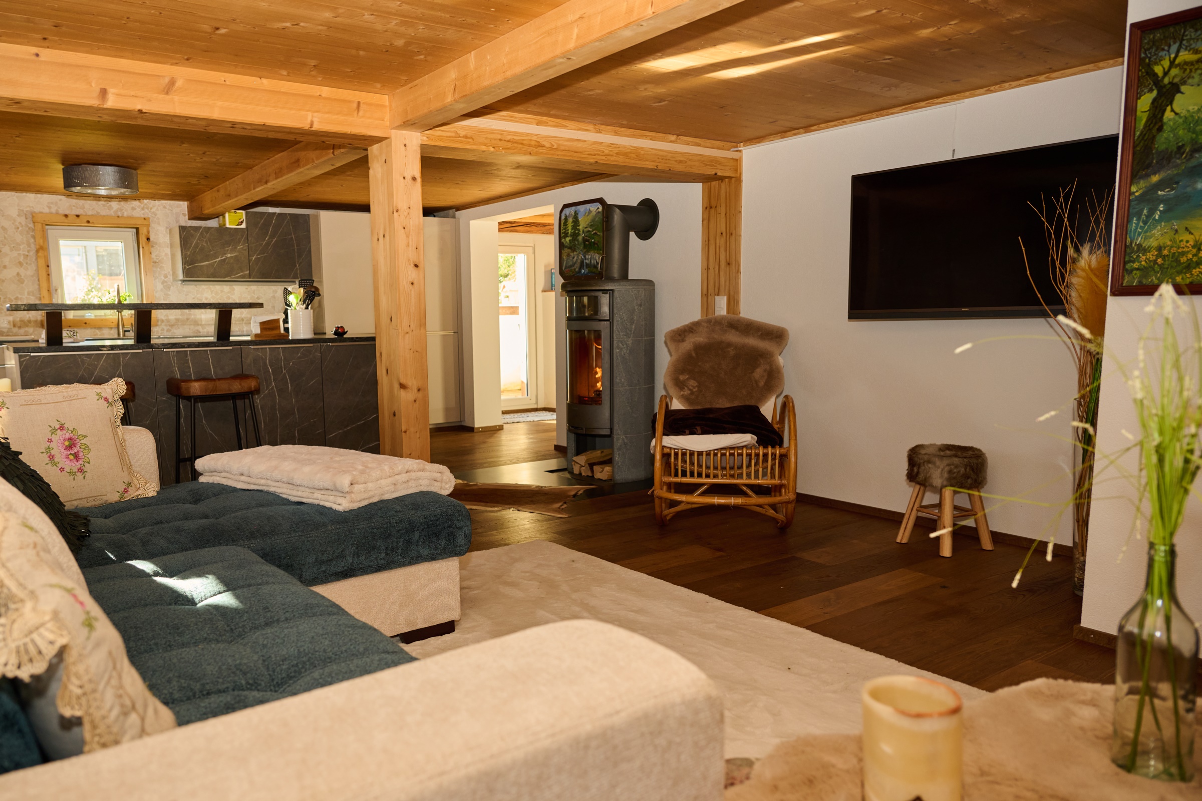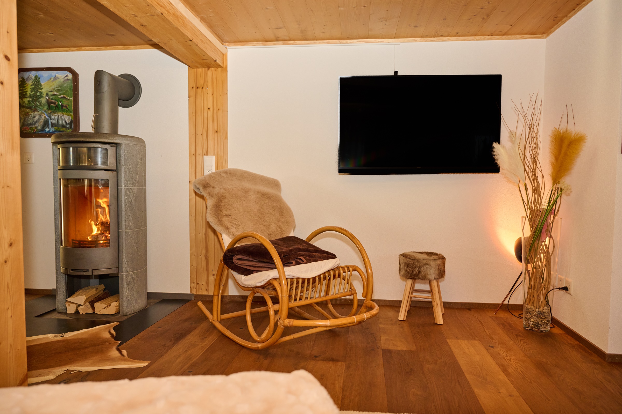 Neben dem Essbereich ist der gemütliche Wohnbereich mit einem grossen Sofa sowie einem Schwedenofen ausgestattet.
