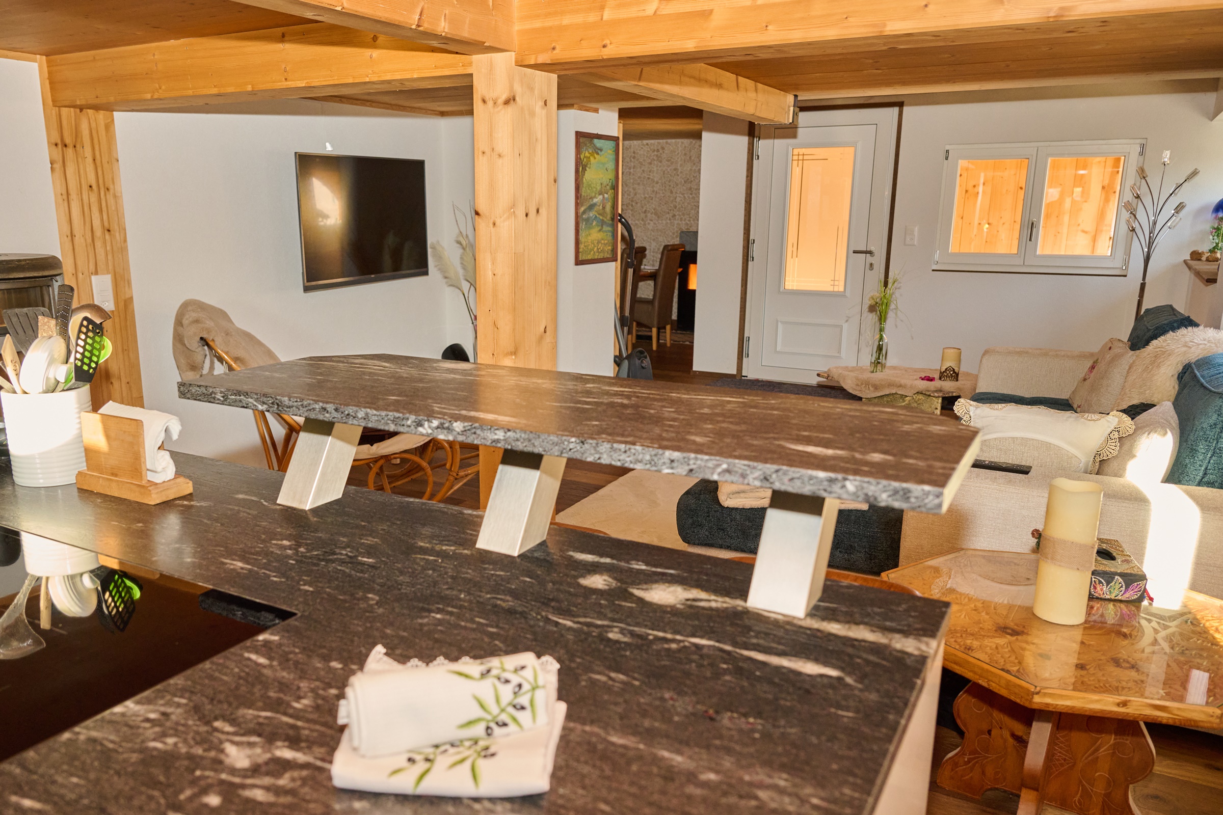 Die Wohnung ist hell, im Erdgeschoss ist ein grosser Raum mit einer schönen, komplett eingerichteten Küche sowie ein bequemes Bettsofa und ein grosser Esstisch.