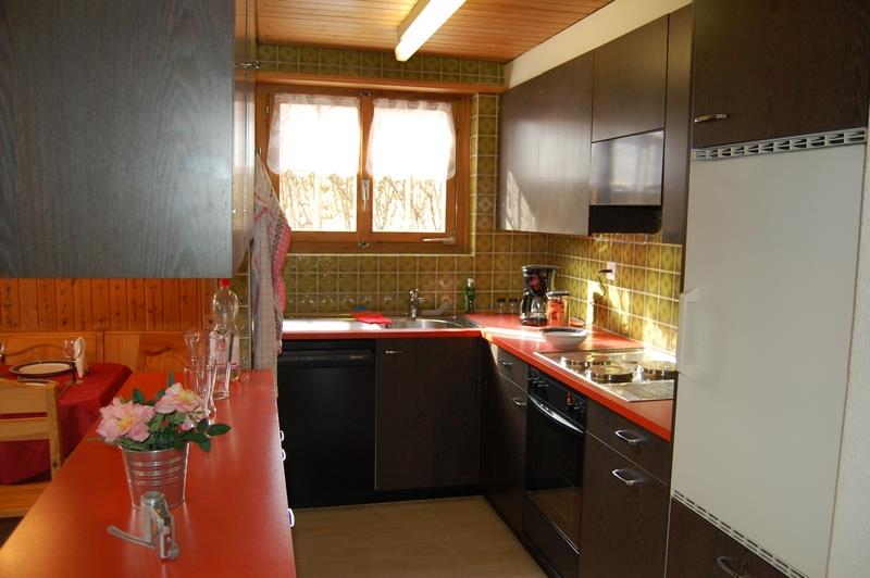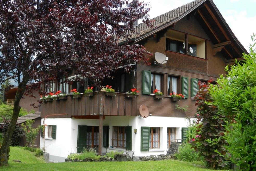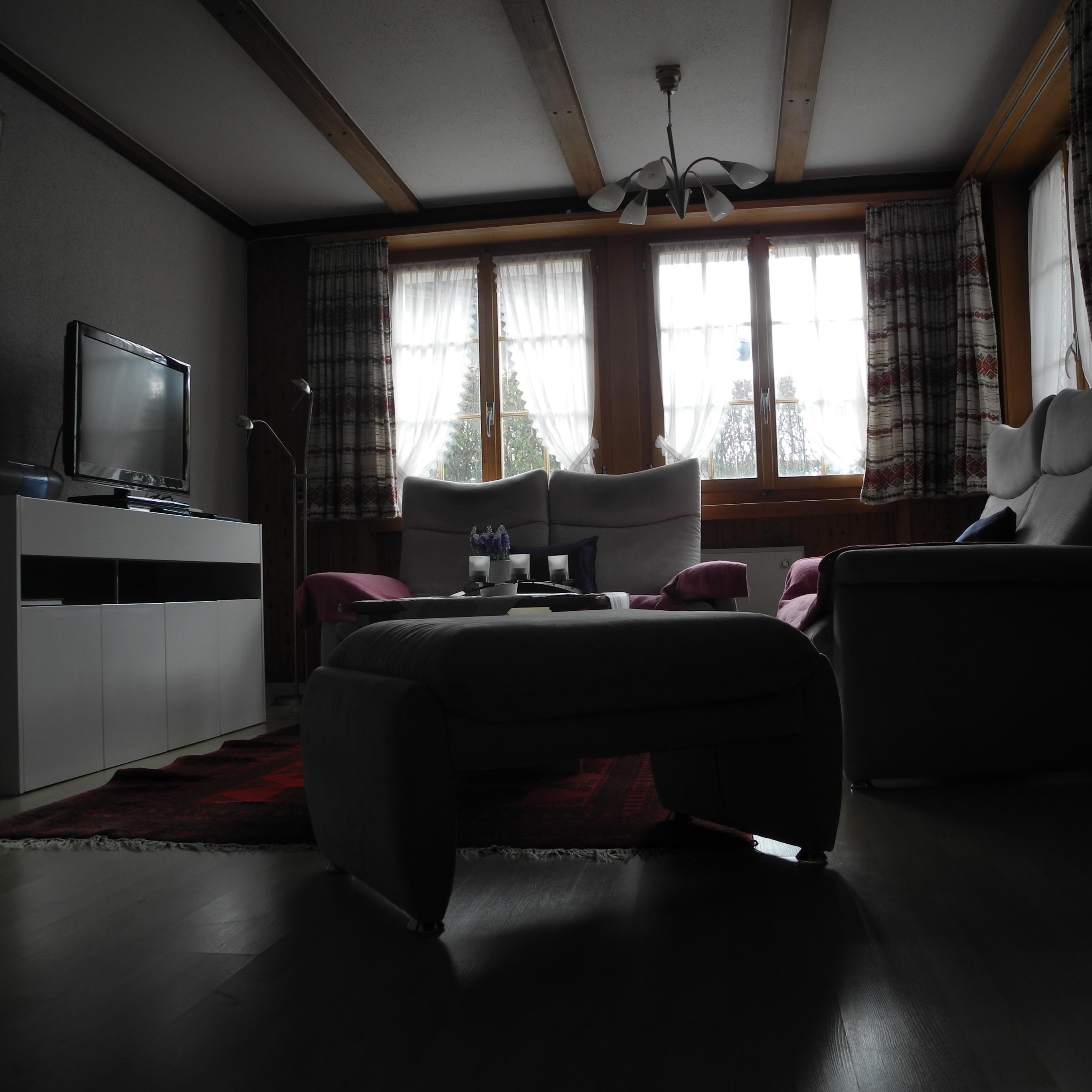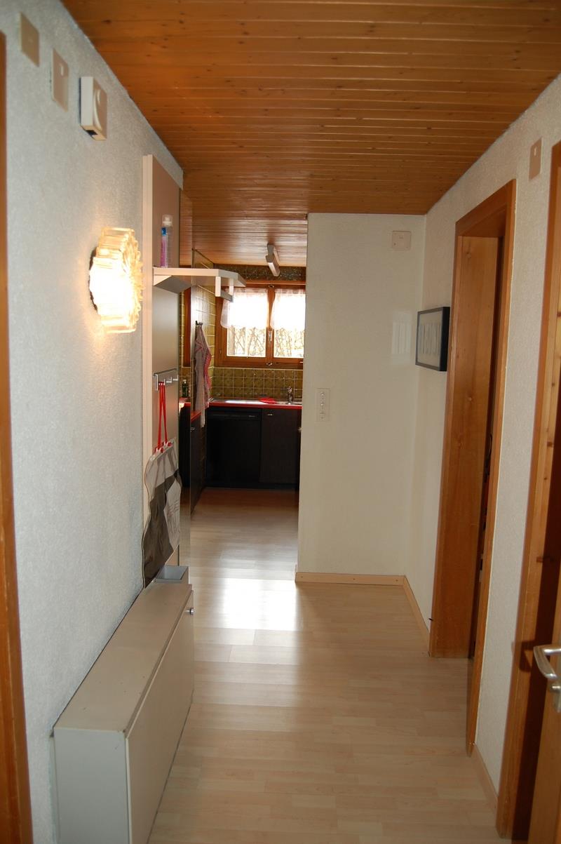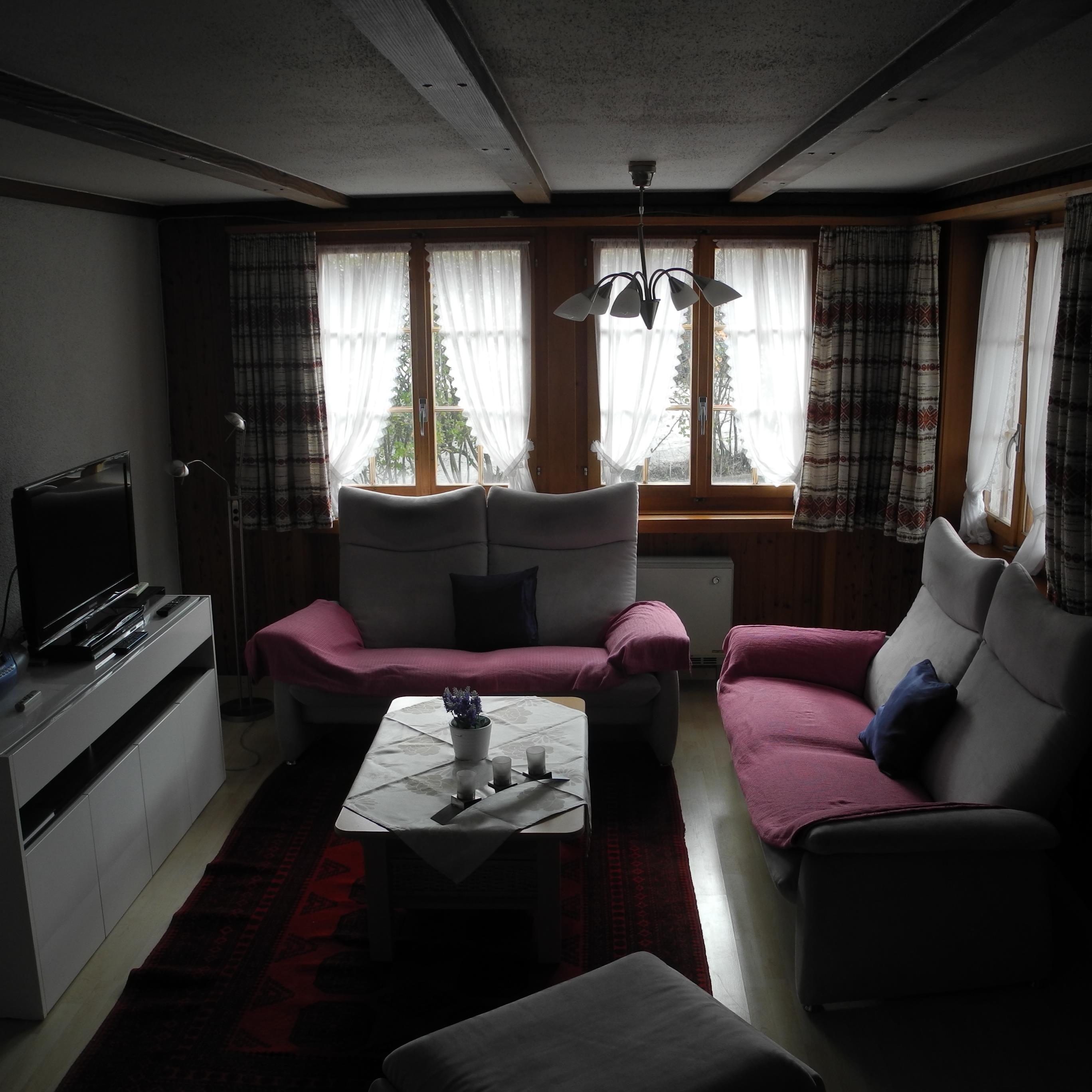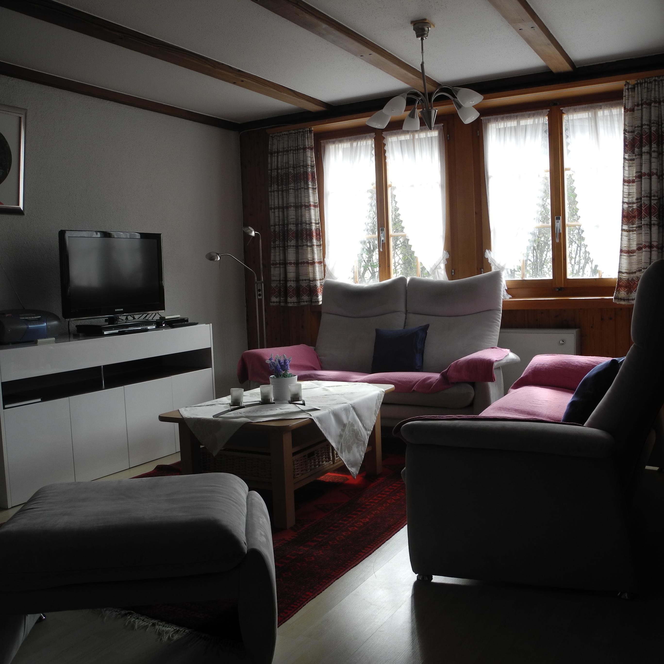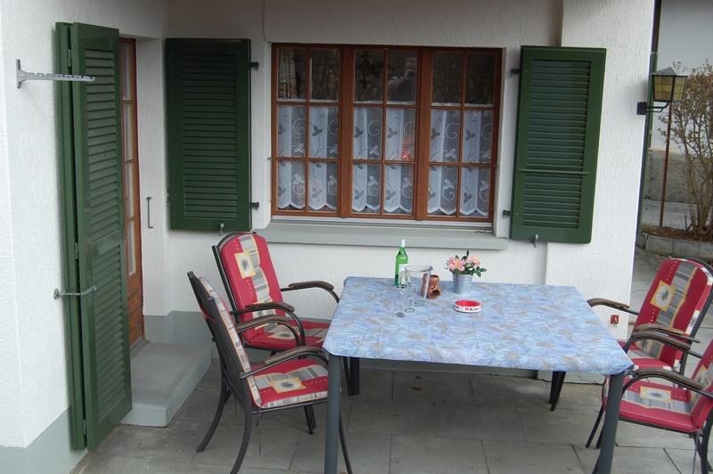 3-Zimmerwohnung im Parterre (62 m2) eines Zweifamilienhauses. Am Dorfrand, nähe Bahnstation, am Fluss und am Wanderweg gelegen. 2 Schlafzimmer. Bad/WC. Helles Wohnzimmer mit Chemineeofen und Essecke offen. Moderene Küche mit Backofen, Geschirrspüler, Kühlschrank und Gefrierfach, Raclette- und Fondueset, Filter 1/4 Kaffeemaschine. Wasserkocheer, TV/Radio/DVD, CD-Player, Waschmaschinen Mitbenützung, Wäschetrockner, Schwedenofen, Heizung, Terrasse, Gartenmöbel und Grill. WLAN vorhanden. 2 Parkplätze beim Haus. Haustiere nach Absprache willkommen. Nichtraucherwohnung.