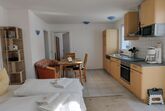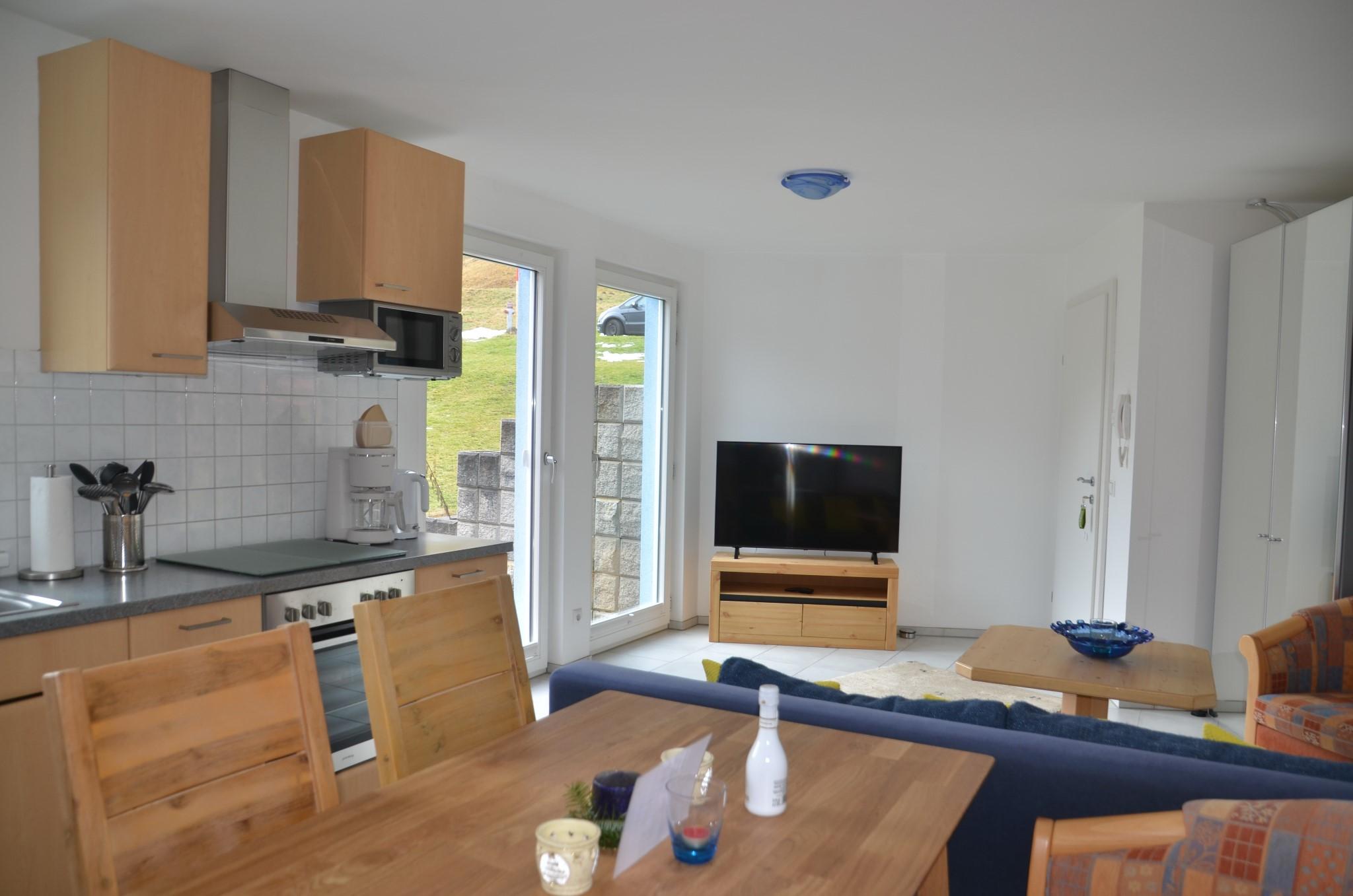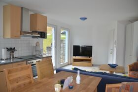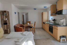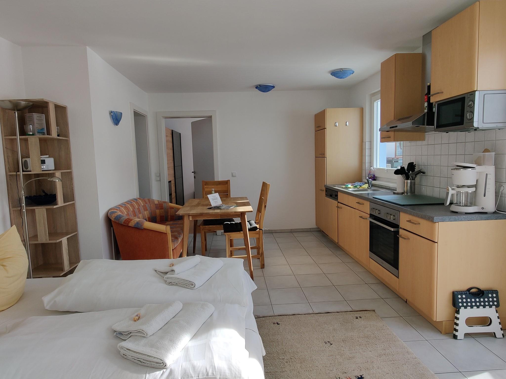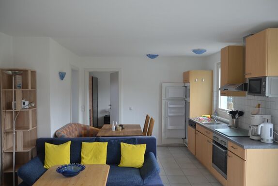 Unsere gemütlich eingerichtete Ferienwohnung erreichen Sie über eine Treppe. Ausgestattet mit einem Schlafzimmer mit Doppelbett (180 x 200 ), Küche inkl. 4-Platten Herd, Backofen, Kühlschrank mit Gefrierfach, Spülmaschine, Filterkaffeemaschine, Toaster und Wasserkocher.