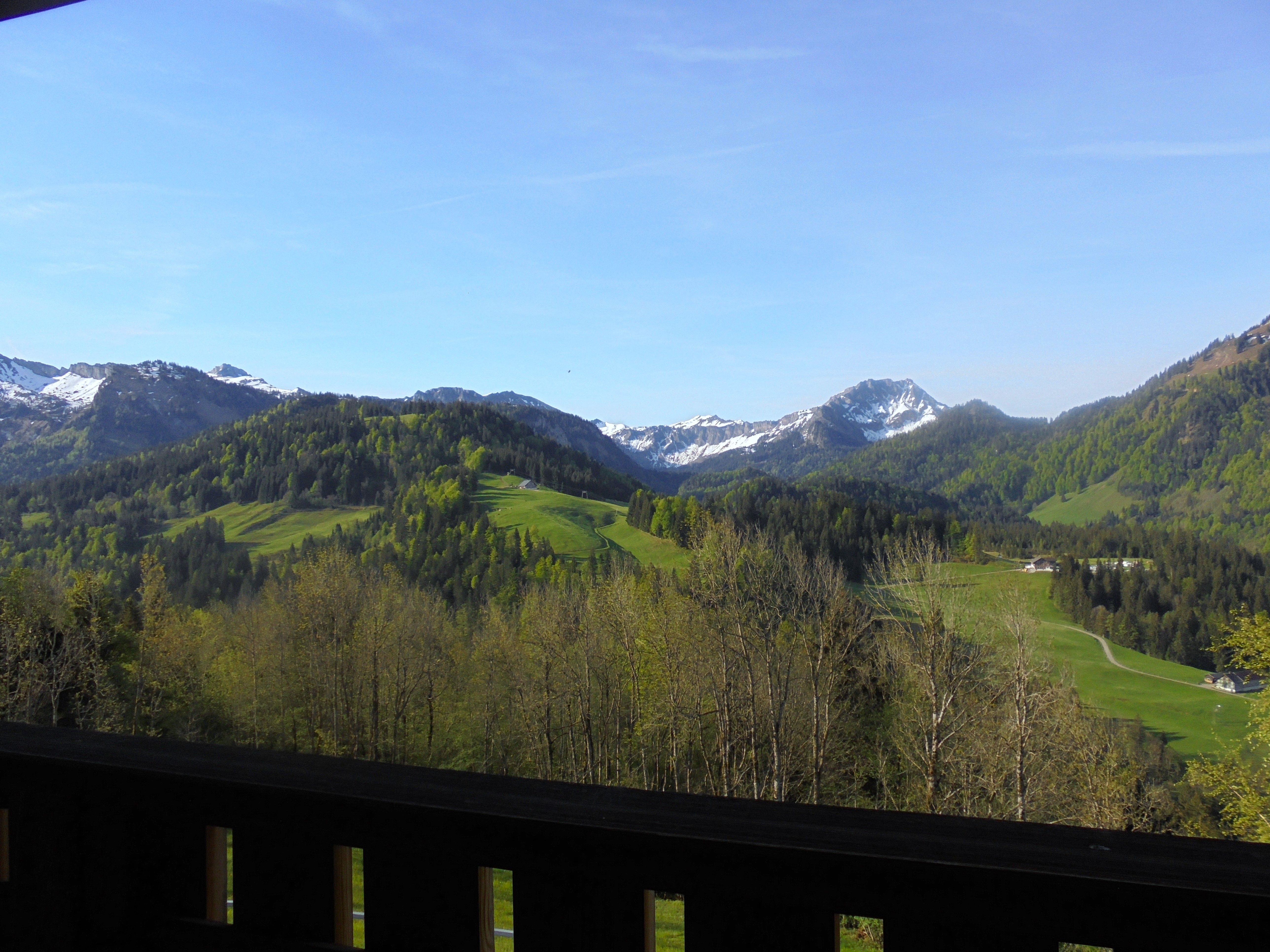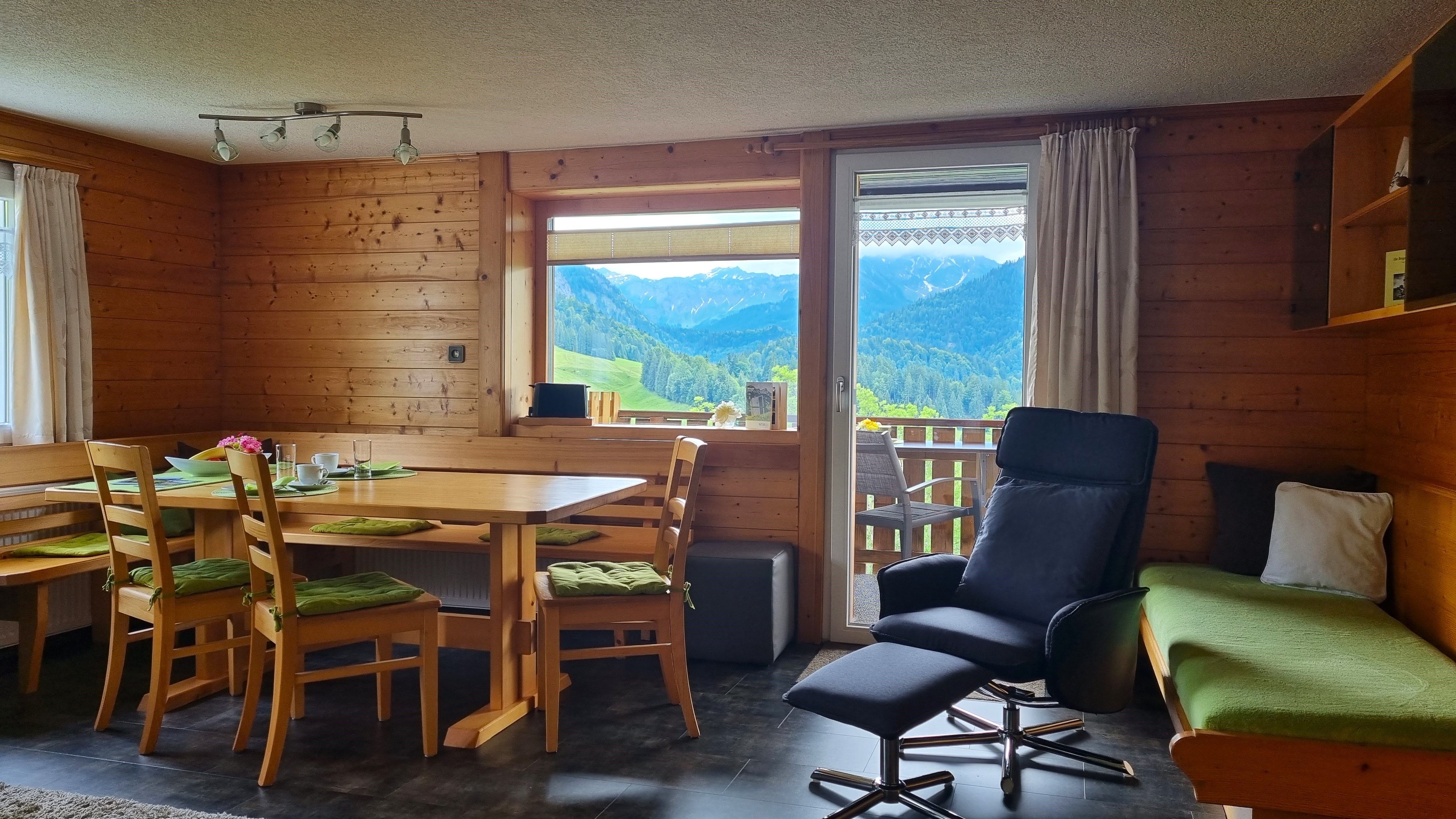 Ferienwohnung Panoramablick mit Blick auf die Bergkulisse und in den Garten.