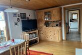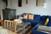 Separates Wohnzimmer mit Polstergruppe für 6 Personen, ein Esstisch mit 4-5 Stühlen. Satelit TV und Stereoanlage. Specksteinofen.
