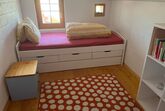 1 Badezimmer mit Badewanne und Dusche, Lavabo und WC. Ein separates WC im Parterre. Waschmaschine und Tumbler im Untergeschoss in der Waschküche zur Mitbenützung gegen Gebühr (CHF 3.50 pro Waschgang).