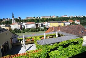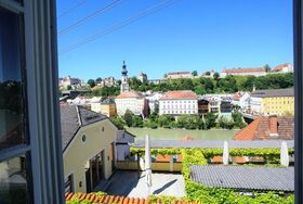 Wunderschöne Aussicht vom Gästehaus Burgblick im Weinhaus Pachler. Lassen Sie sich von der Traumkulisse aus der längsten Burg der Welt, den malerischen Altstadtfassaden und des ruhig gleitenden Flusses verzaubern.