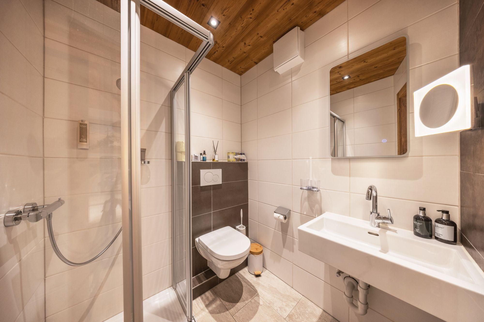 2 gemütlichen Schlafzimmern mit luxeriösen Boxspringbetten, beide Zimmer jeweils mit TV Flatscreen und eigenen modernen Badezimmern en suite mit Dusche, Toilette,Natursteinwaschbecken, Schminkspiegel mit Licht und Vergrößerung, Luis Trenker Pflegeprodukten und Haarföhn.