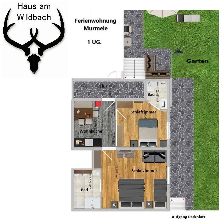 Aufteilung der Ferienwohnung: Im Tiefparterre, mit eigenem Hauseingang und direktem Zugang zum weitläufigen, eingezäunten Gemeinschaftsgarten bzw. der Langlaufloipe.