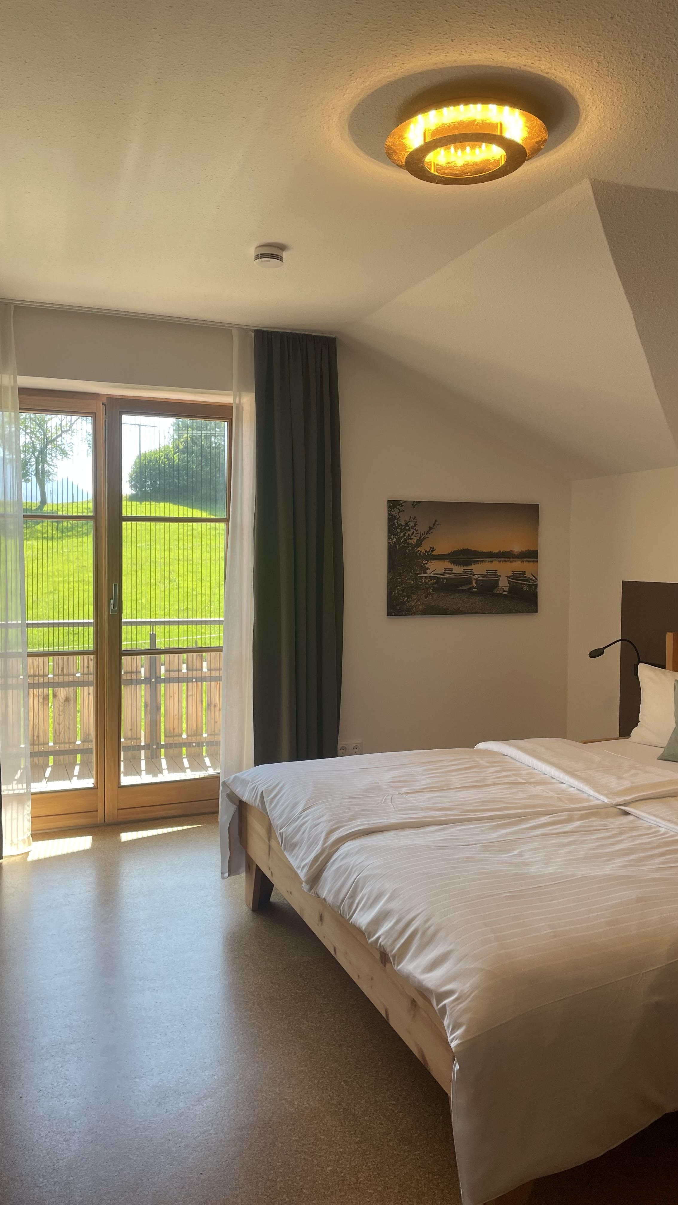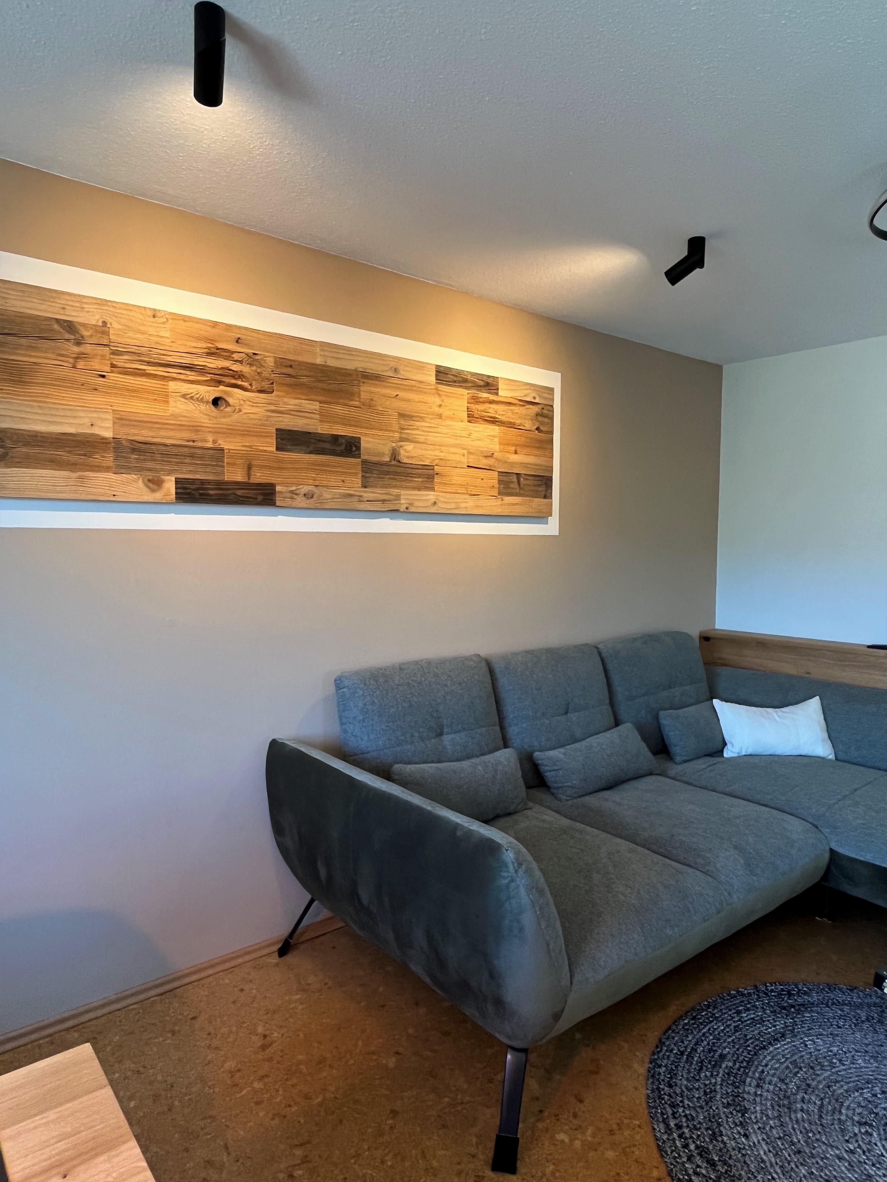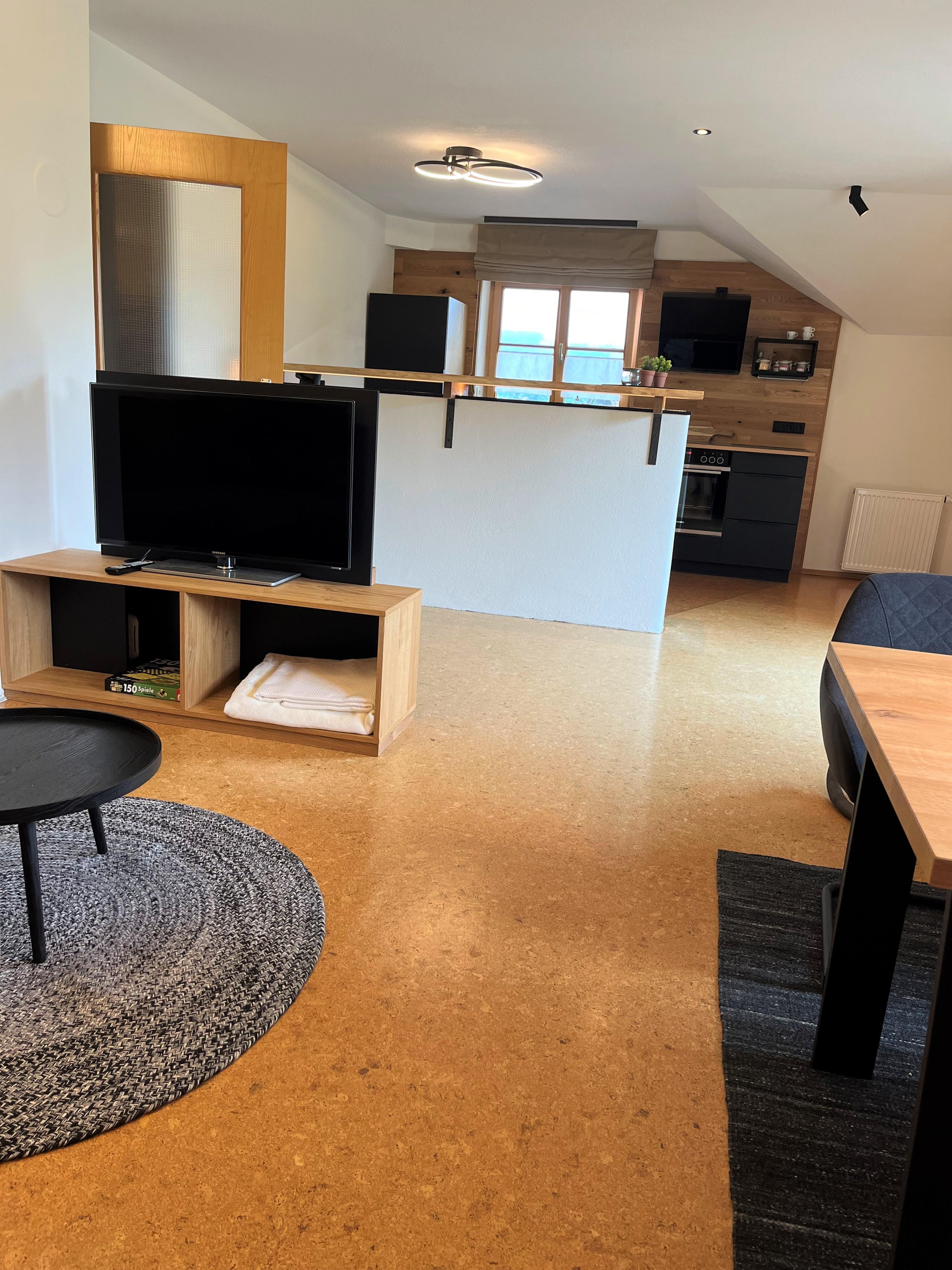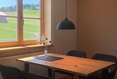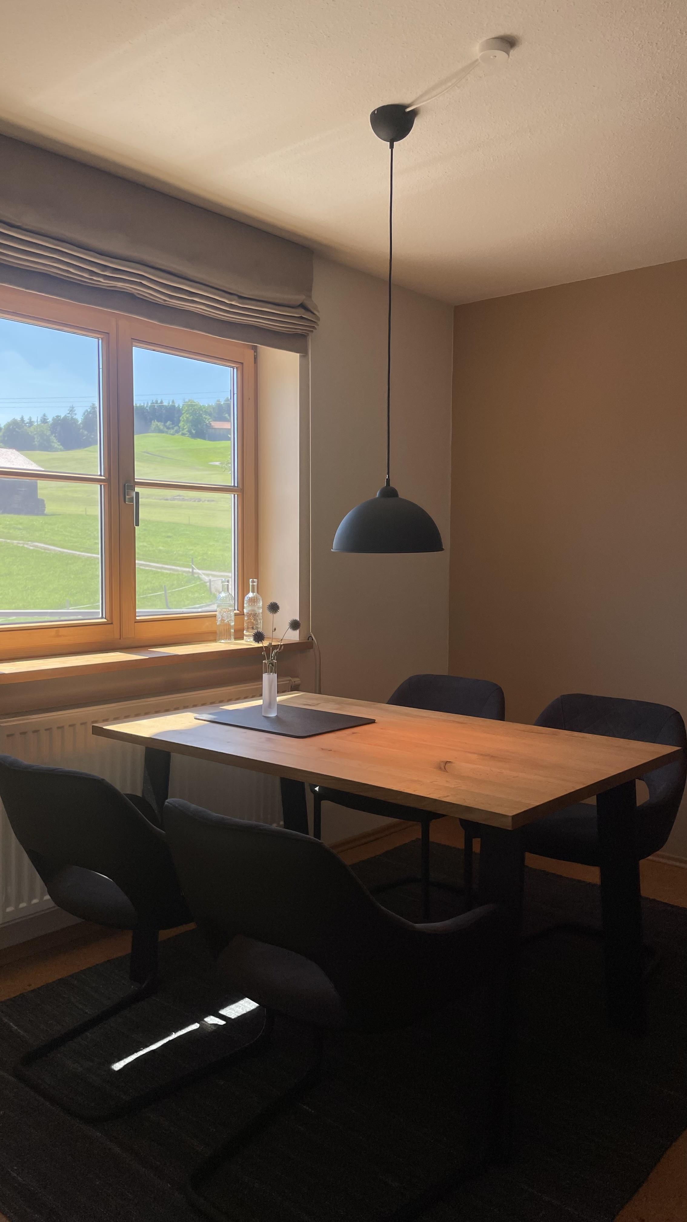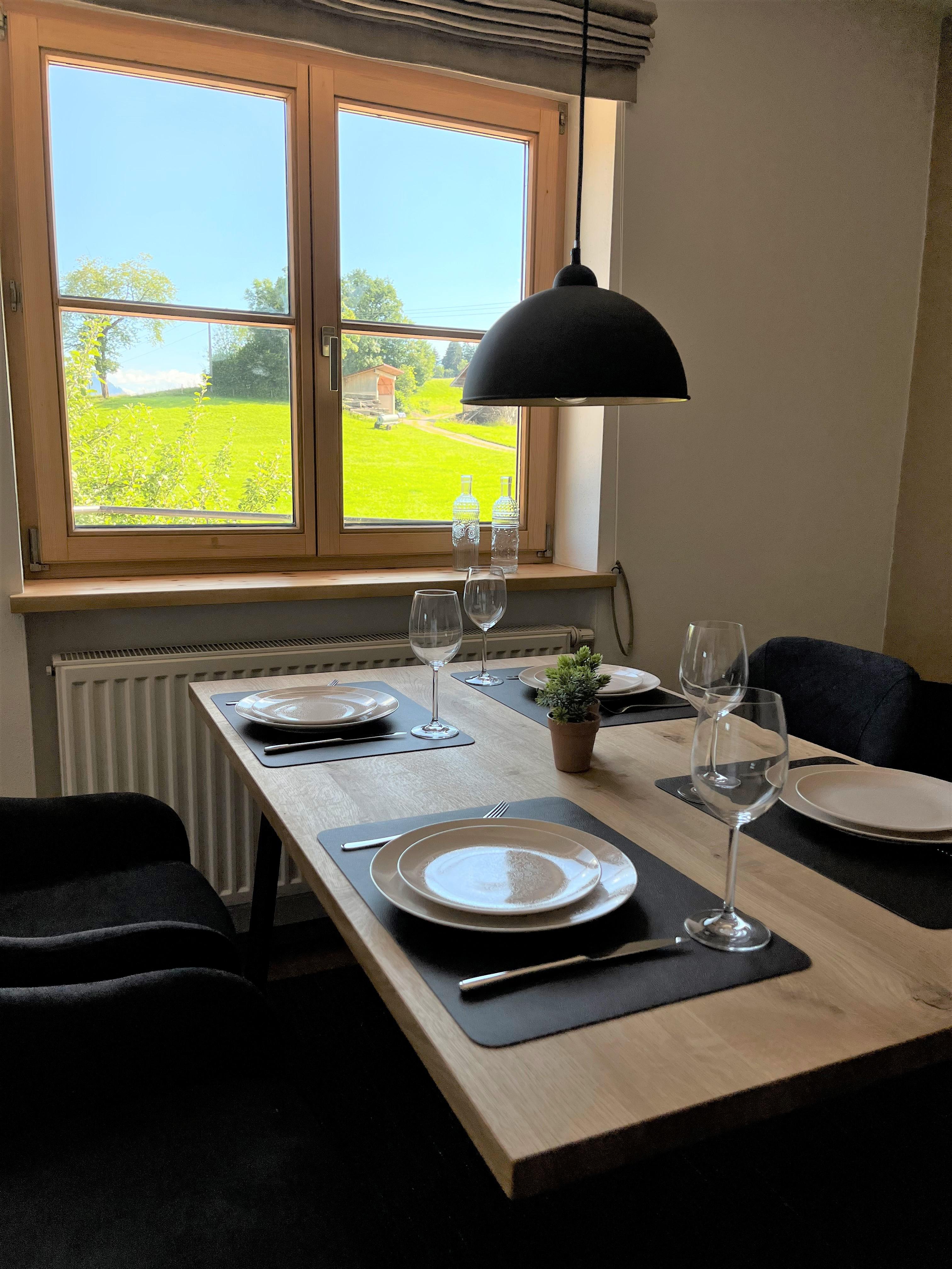 Dieser beinhaltet eine voll ausgestattete Küche, ein großes Sofa und einen Esstisch direkt mit Blick auf den Grünten. Die Ferienwohnung hat zwei Schlafzimmer. Ein Schlafzimmer mit Morgensonne in massiver Fichte und das zweite Schlafzimmer mit Blick auf den Grünten in massiver Zirbe. Beide Schlafzimmer sind voll verdunkelbar. Ein Badezimmer mit Regendusche und Aussenfenster und einer Physiotherm- Zirben-Infrarotkabine.