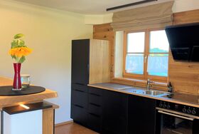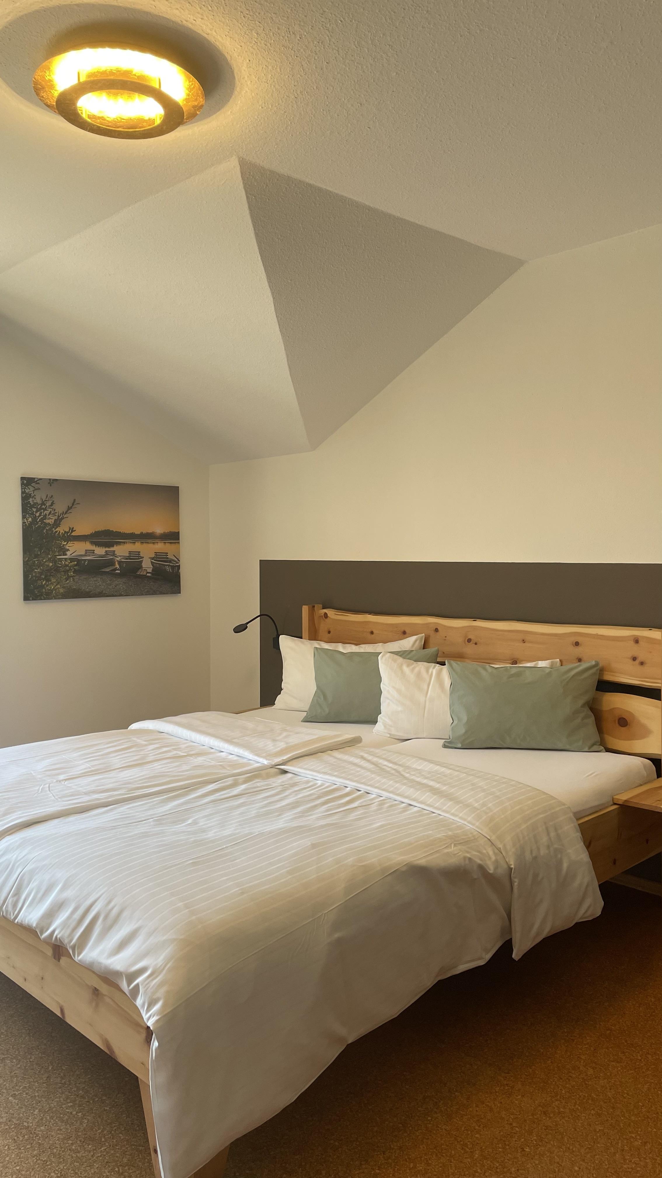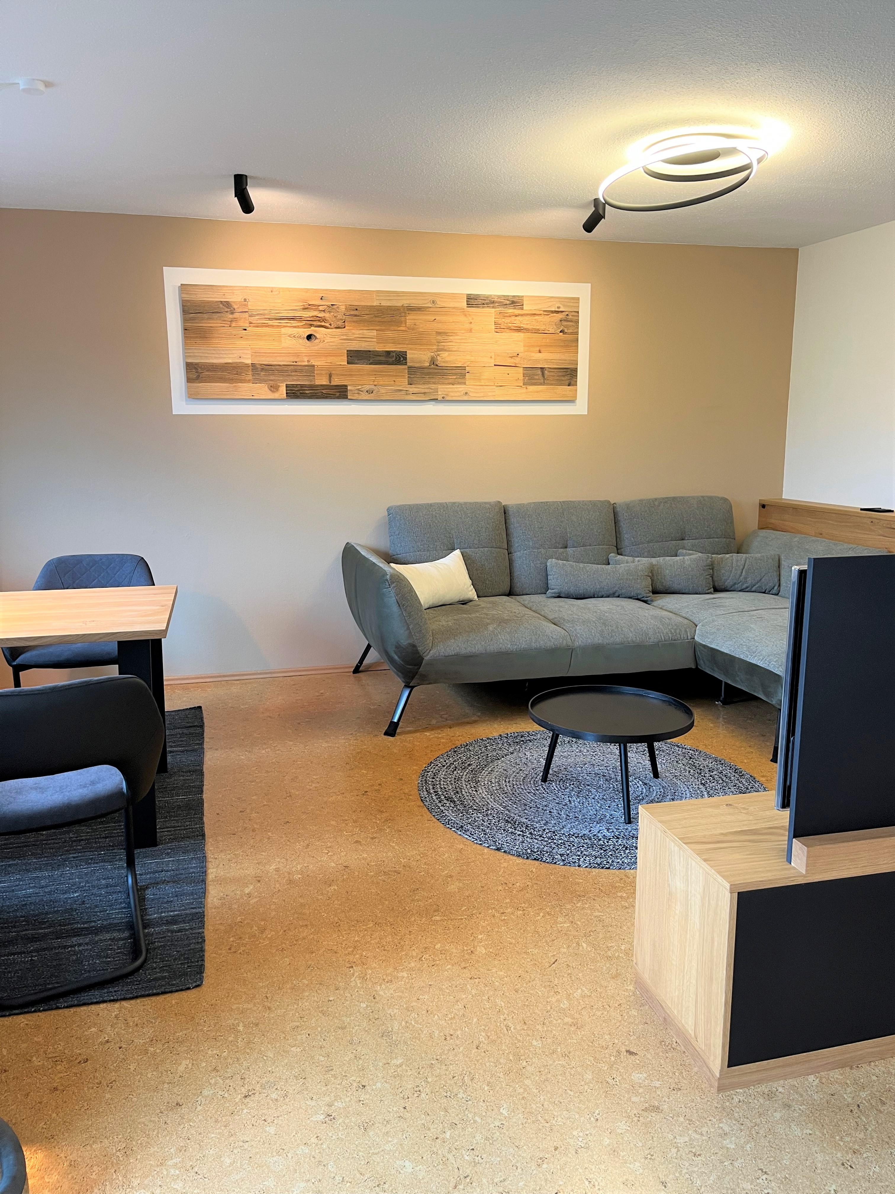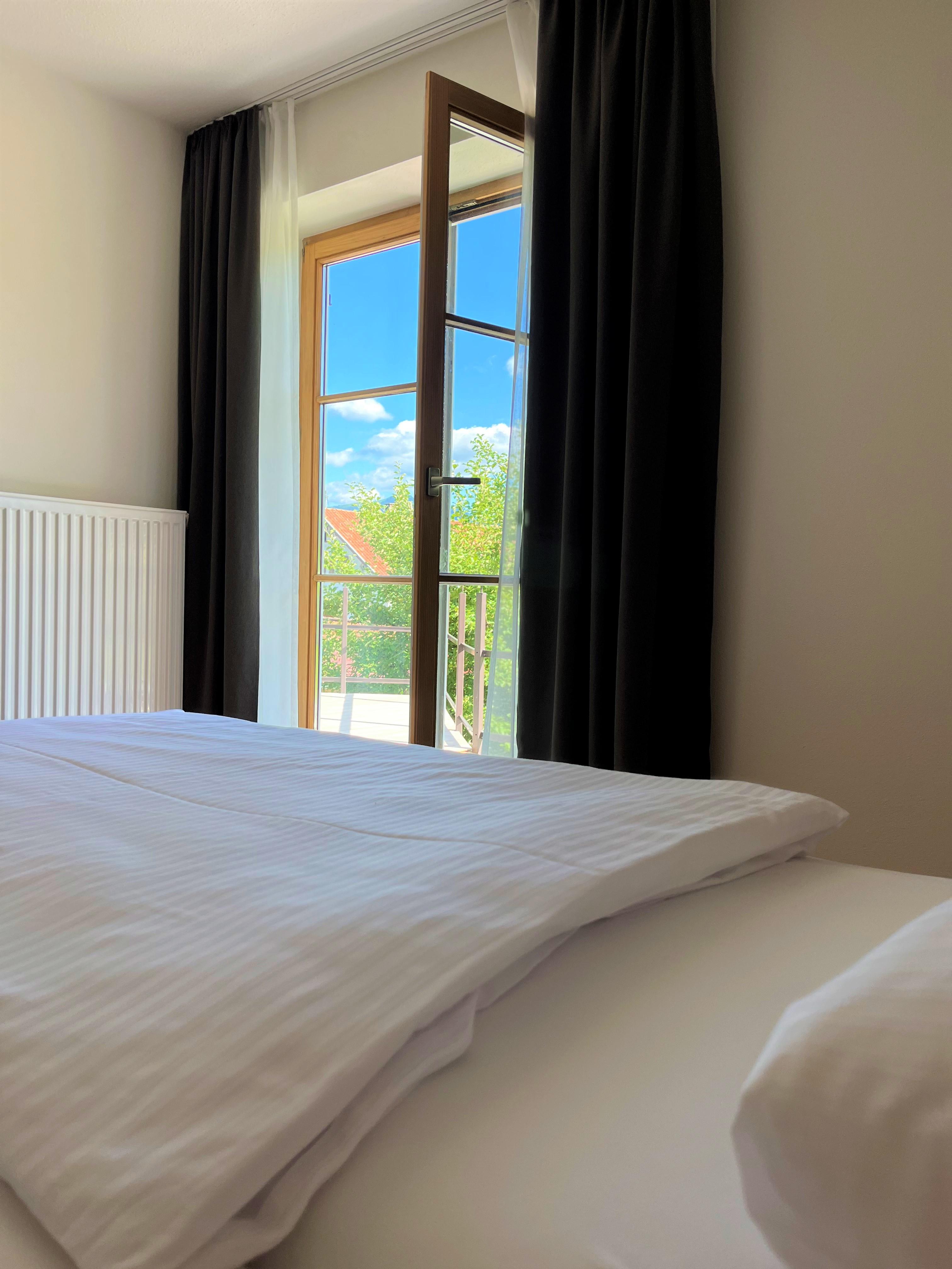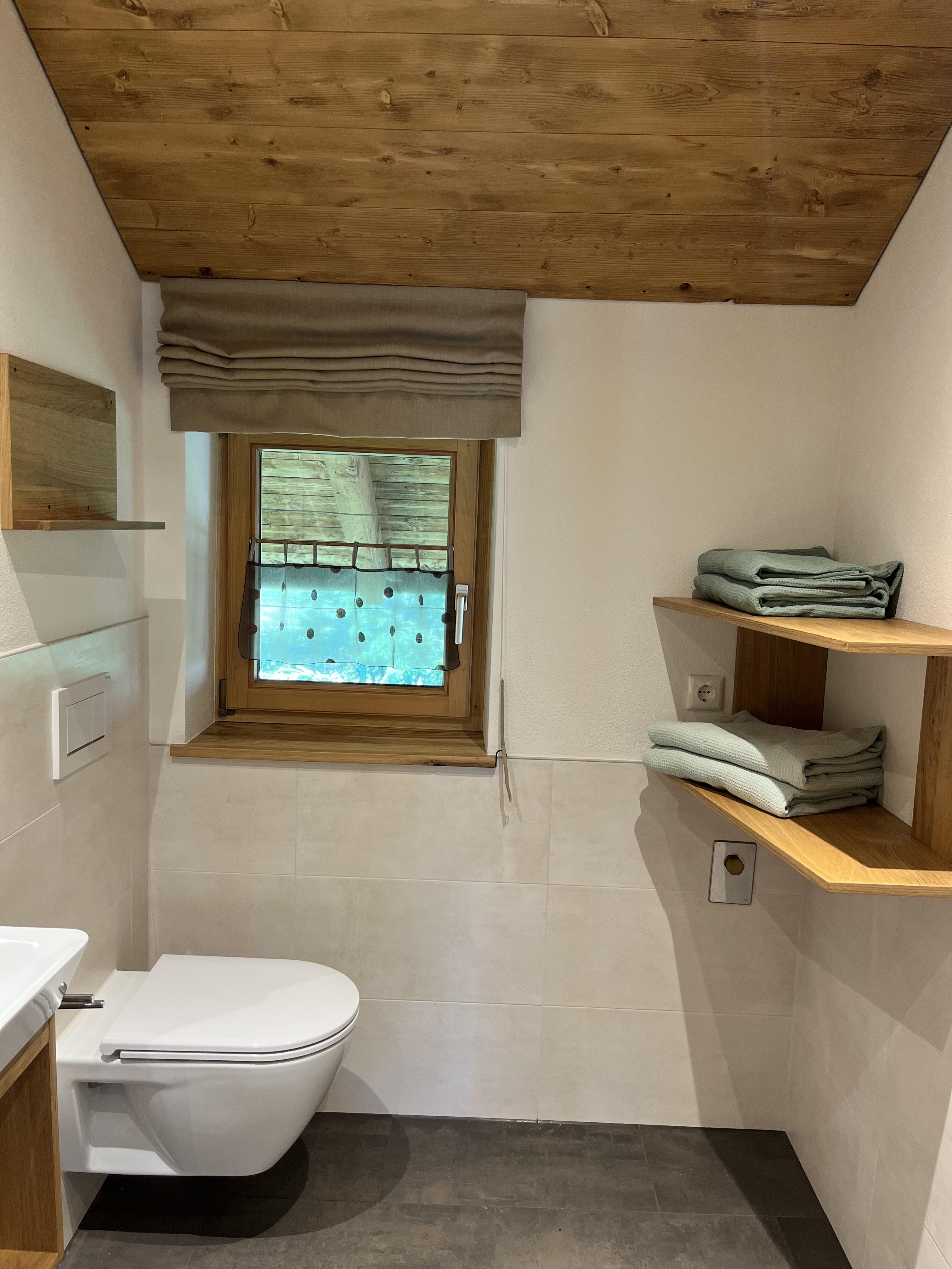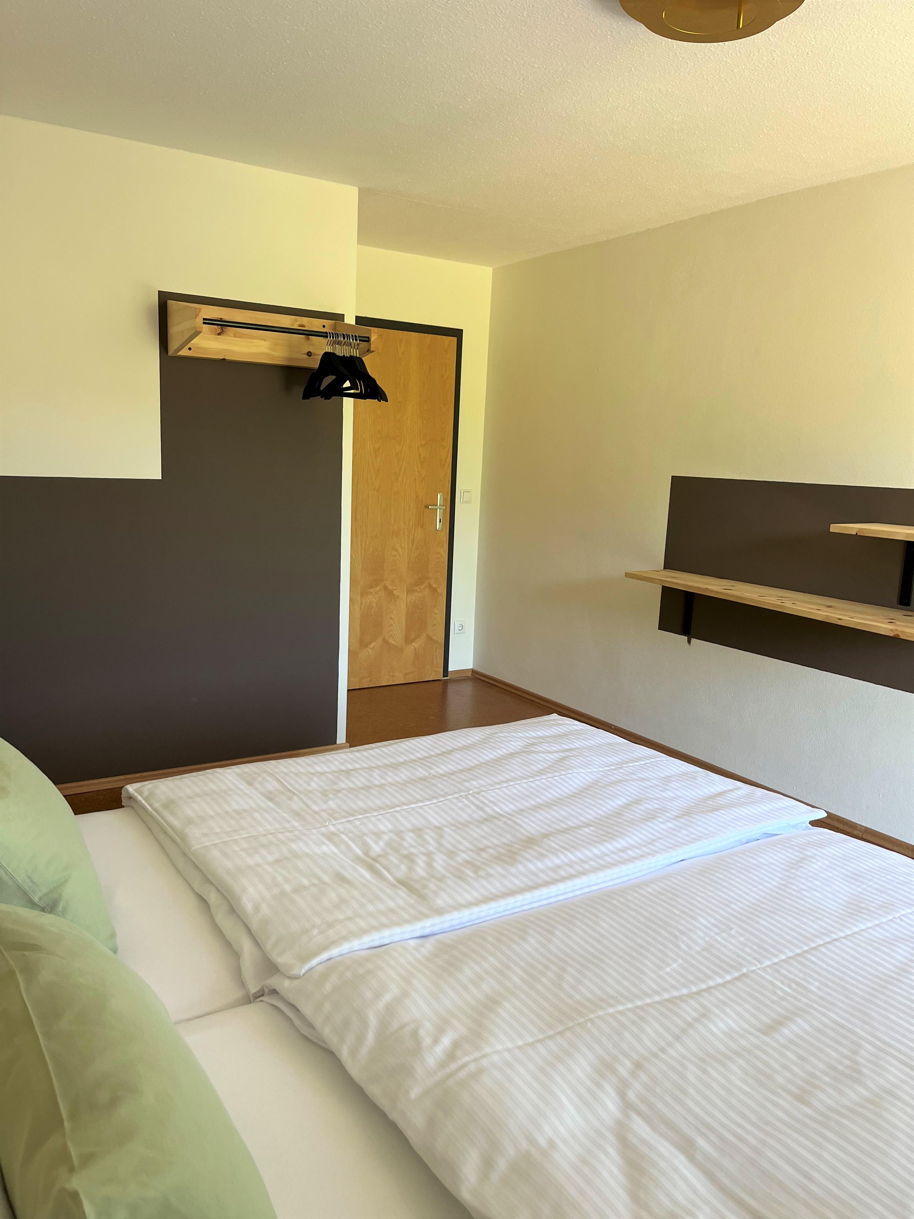Dieser beinhaltet eine voll ausgestattete Küche, ein großes Sofa und einen Esstisch direkt mit Blick auf den Grünten. Die Ferienwohnung hat zwei Schlafzimmer. Ein Schlafzimmer mit Morgensonne in massiver Fichte und das zweite Schlafzimmer mit Blick auf den Grünten in massiver Zirbe. Beide Schlafzimmer sind voll verdunkelbar. Ein Badezimmer mit Regendusche und Aussenfenster und einer Physiotherm- Zirben-Infrarotkabine.