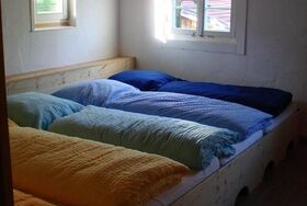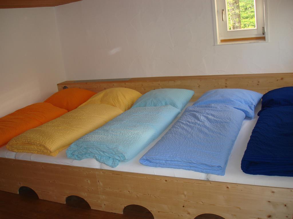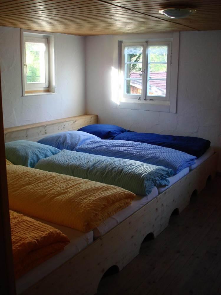 Unser Zi5 ist ein 4-Bett-Zimmer ostseitig mit schöner Morgensonne. Es hat ein eigenes Bad direkt neben dem Zimmer. Gemütliches Zimmer im Matratzenlagerstil.
