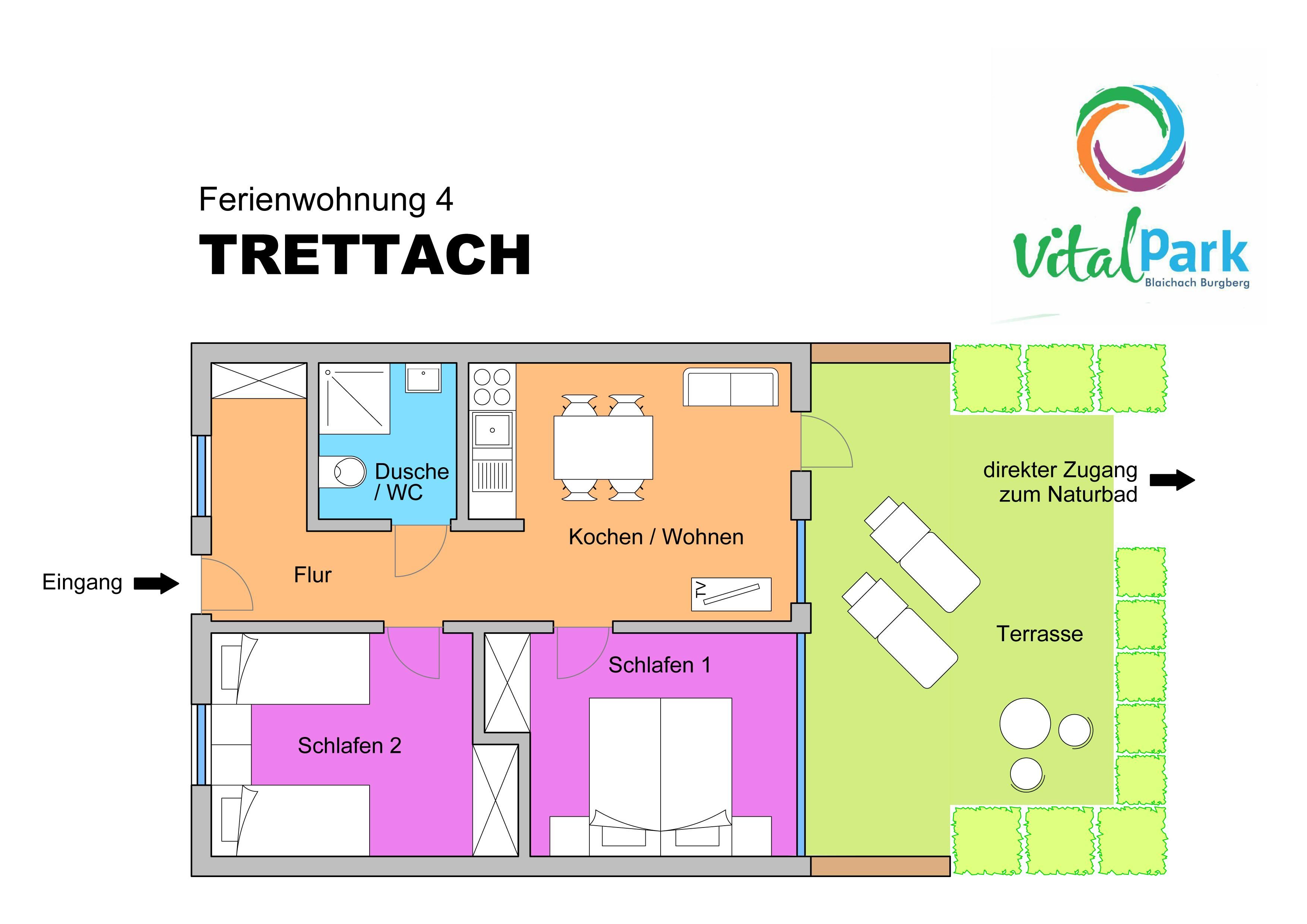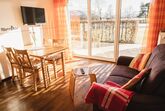 Die Wohnung hat zwei abgetrennte Schlafräume (Doppelbett 180*200 sowie 2 Einzelbetten 90*200) einen stilvoll eingerichteten Wohn- & Essbereich mit Küchenzeile sowie ein helles Bad mit Dusche und WC. Im Wohnraum befindet sich eine einladende Couch sowie Sat-TV. Zusätzlich eine große Terrasse mit Zugang zum Vitalpark.