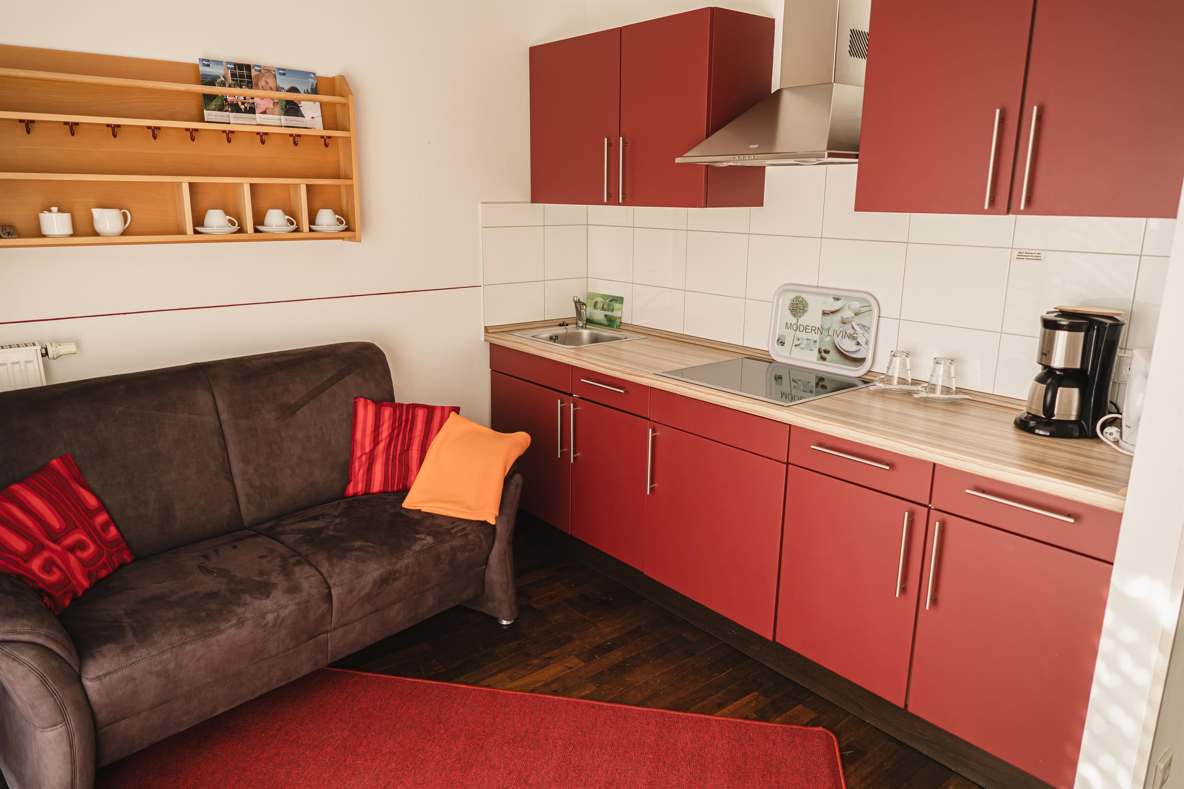 Die Küche ist mit allem ausgestattet was man benötigt: u.a. Cerankochfeld, Kühlschrank, Wasserkocher, Kaffeemaschine, Besteck und Reinigungszubehör.