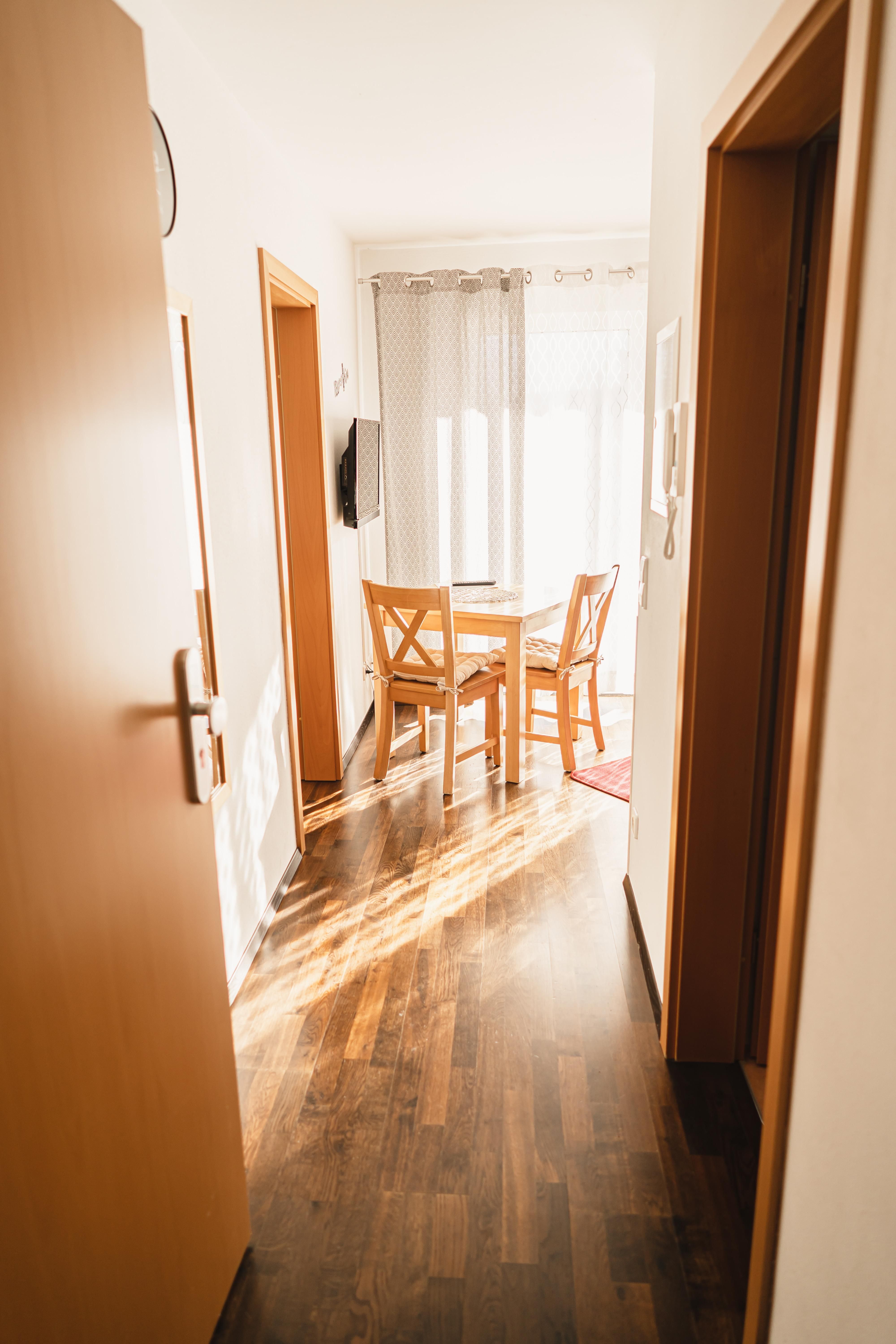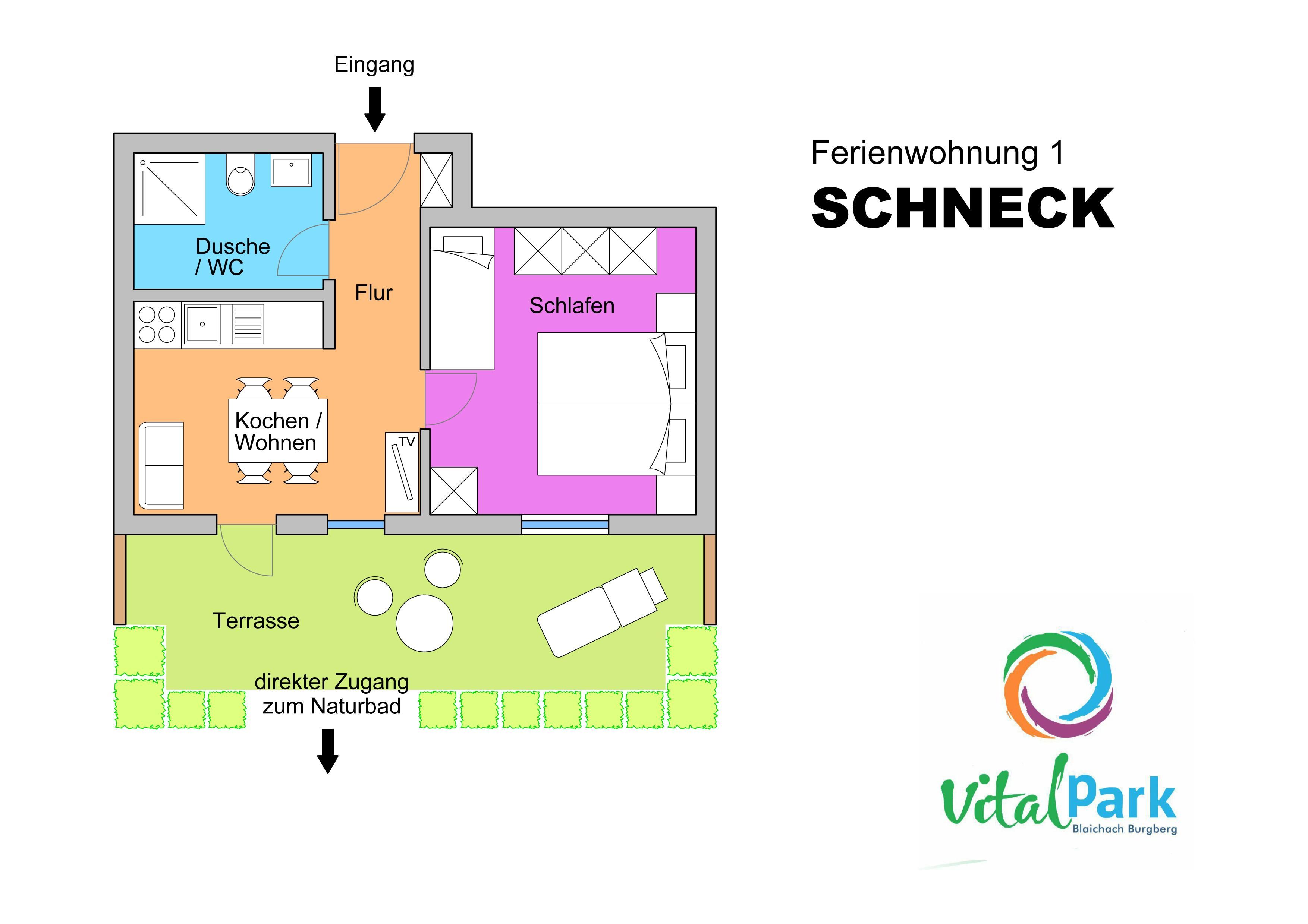 Die Wohnung hat ein abgetrenntes Schlafzimmer, einen stilvoll eingerichteten Wohn- & Essbereich mit Küchenzeile sowie ein helles Bad mit Dusche und WC. Im Wohnraum befindet sich eine einladende Couch sowie Sat-TV. Zusätzlich eine große Terrasse mit Zugang zum Vital-Park.