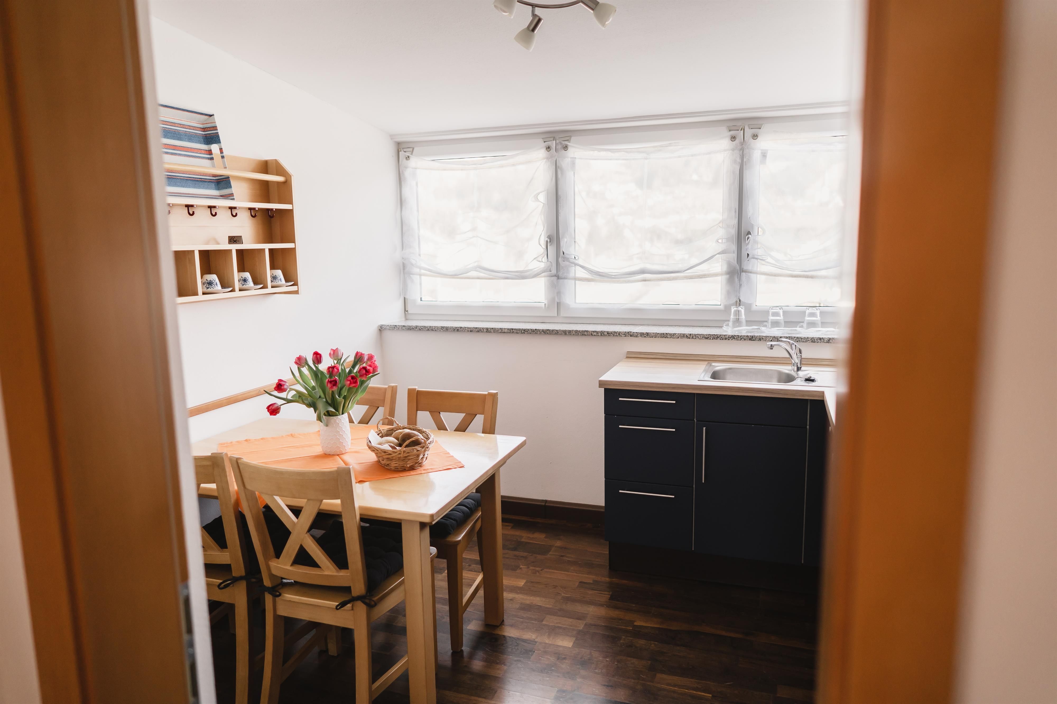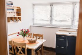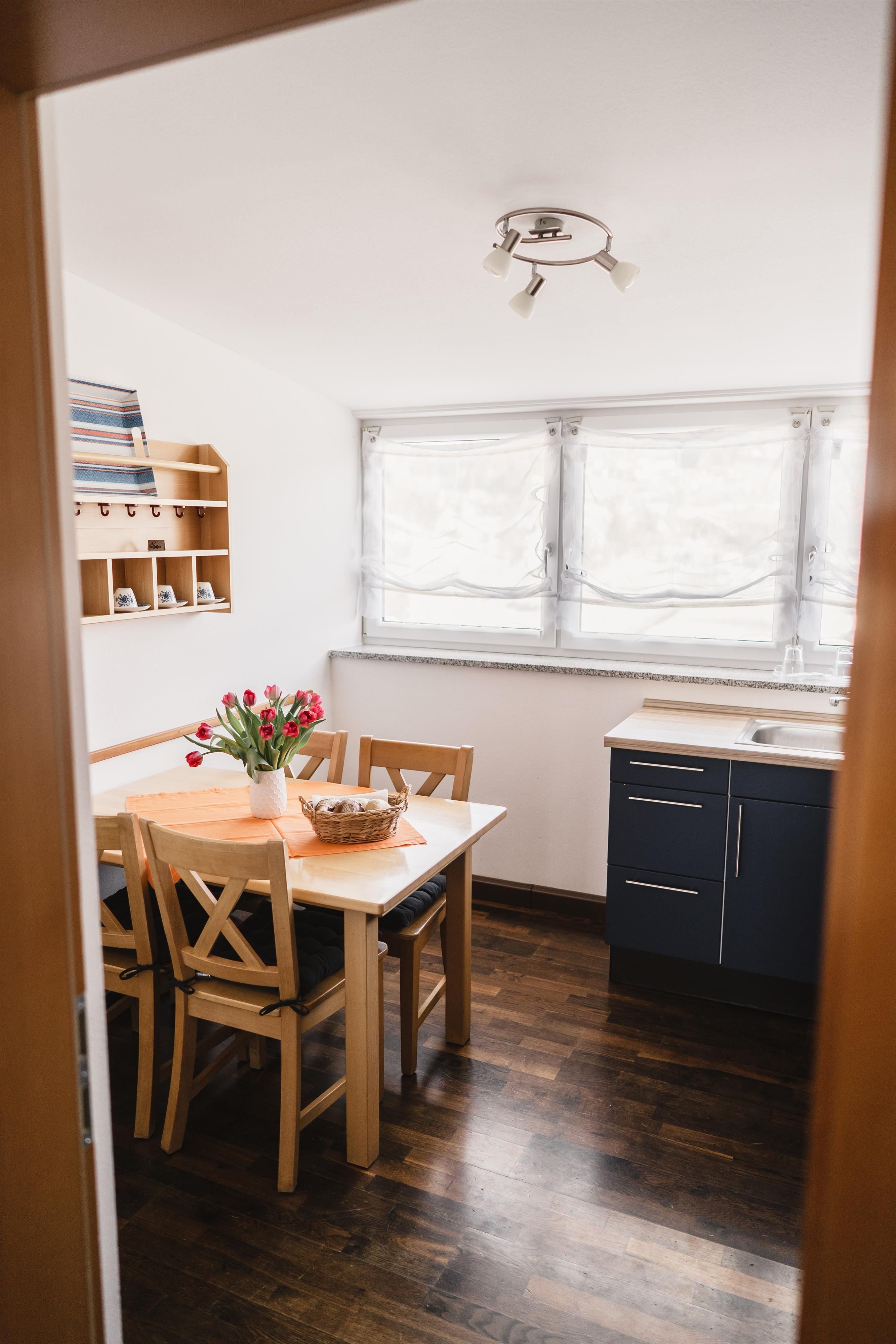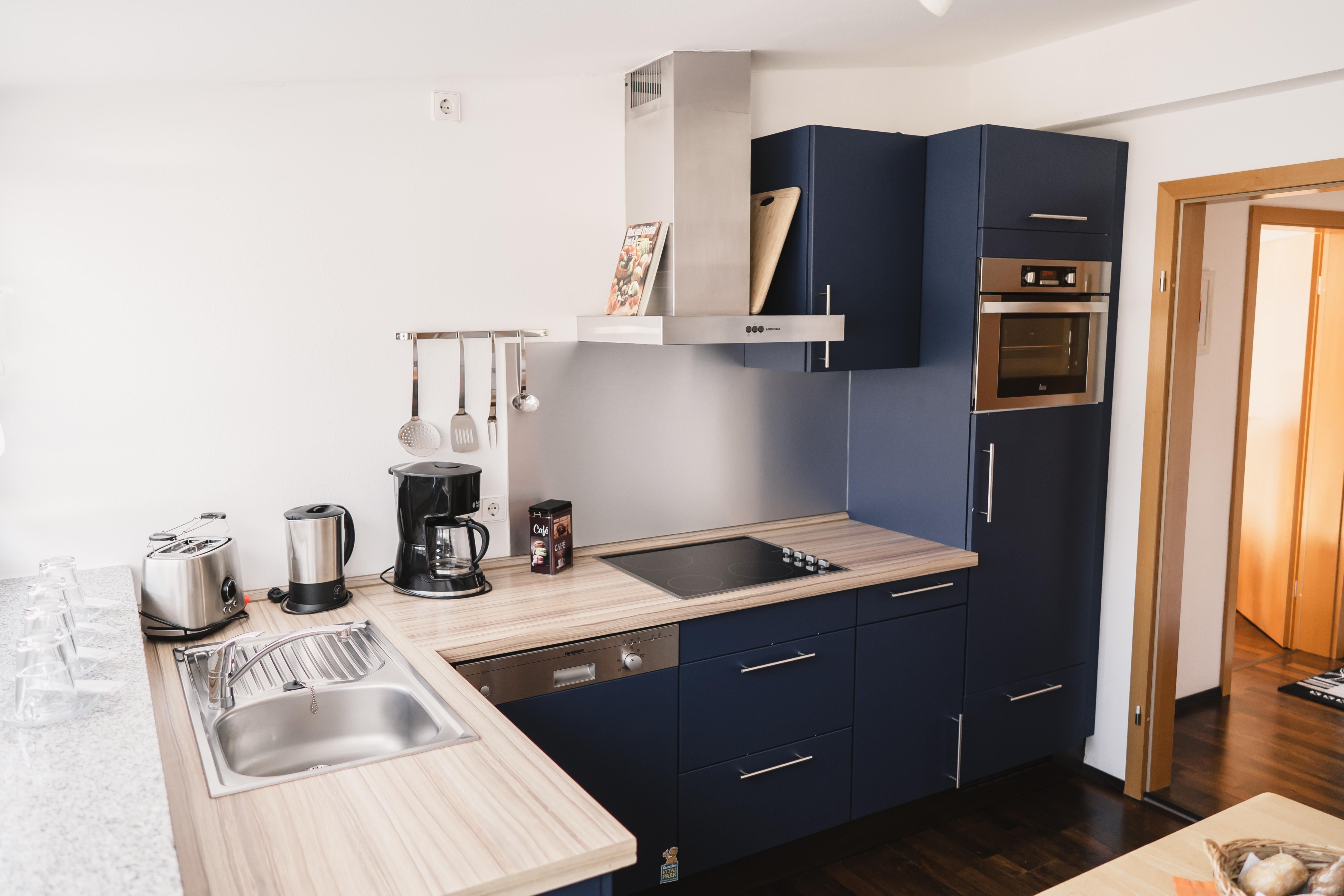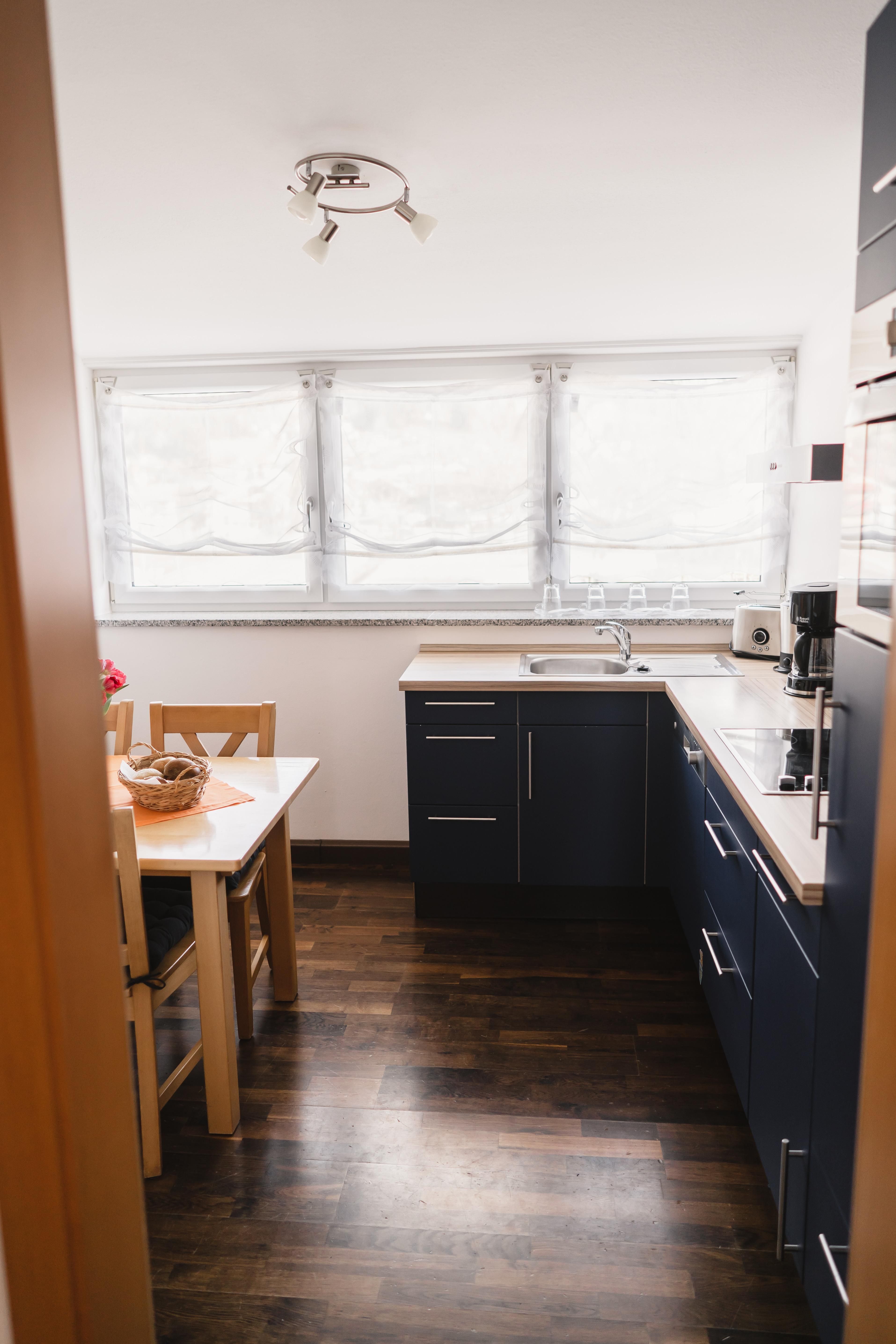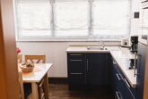 Die große Wohnküche mit Esstisch ist mit allem ausgestattet was man braucht: u.a. Cerankochfeld, Kühlschrank, Backofen, Spülmaschine, Wasserkocher, Kaffeemaschine, Geschirr und Reinigungszubehör.