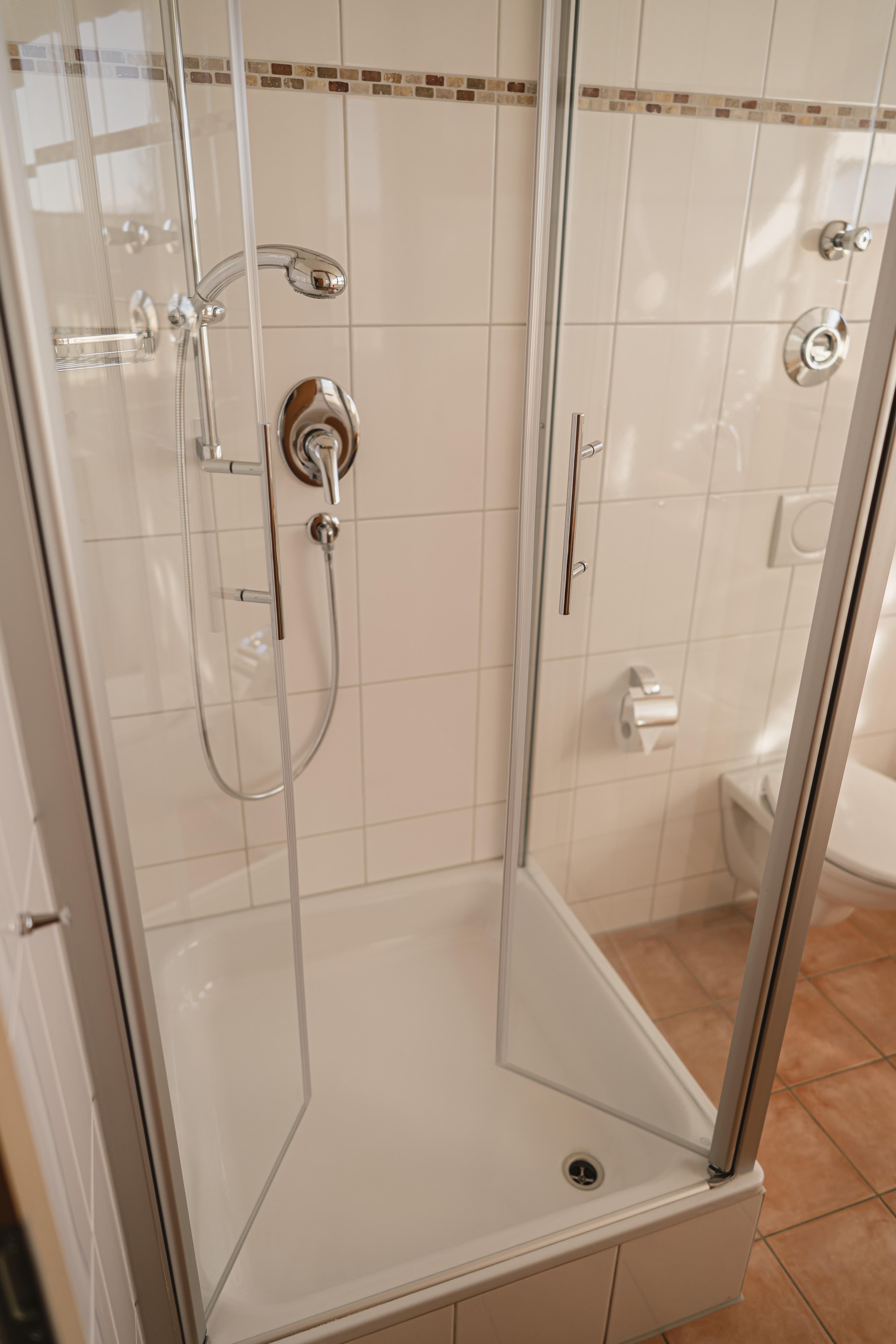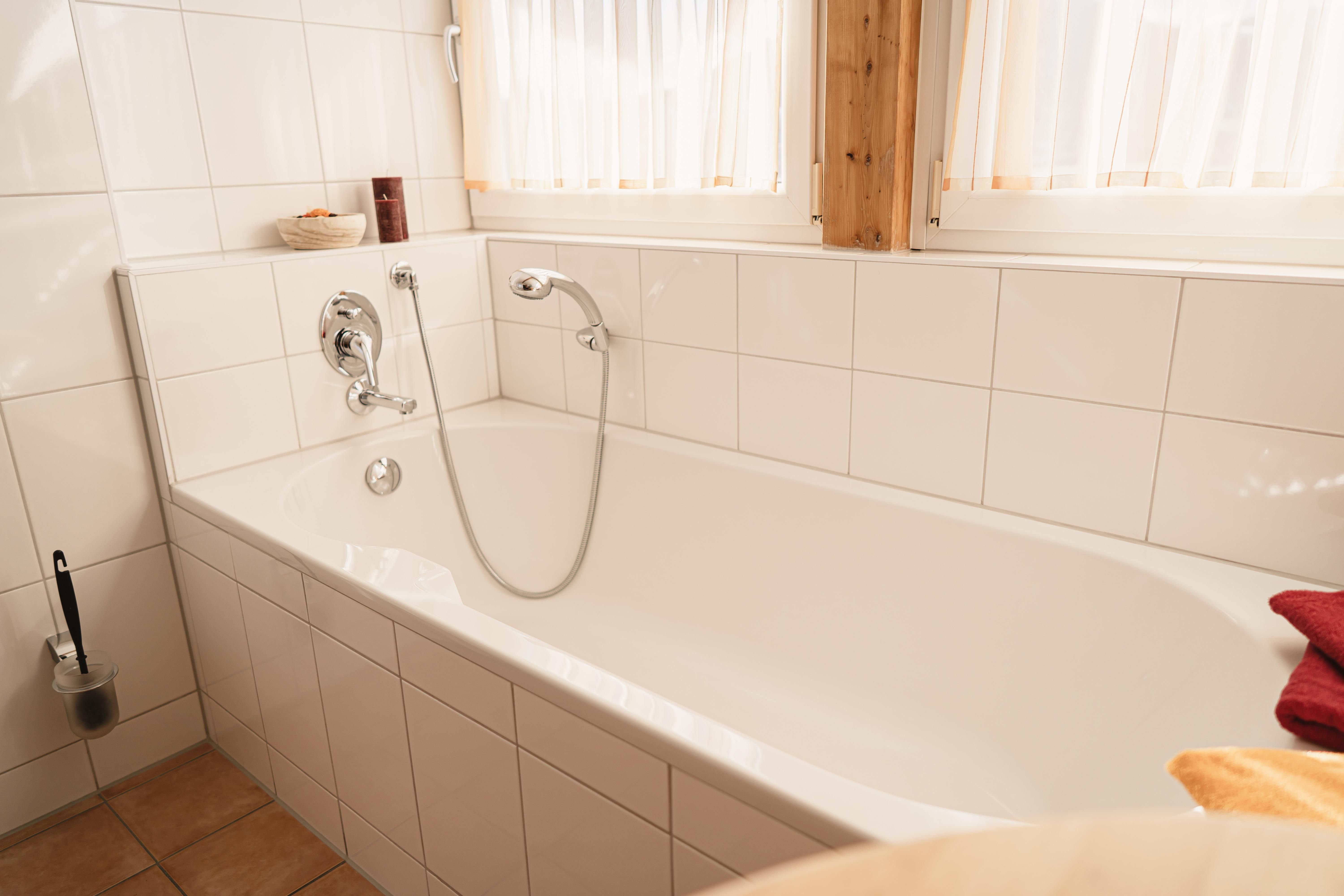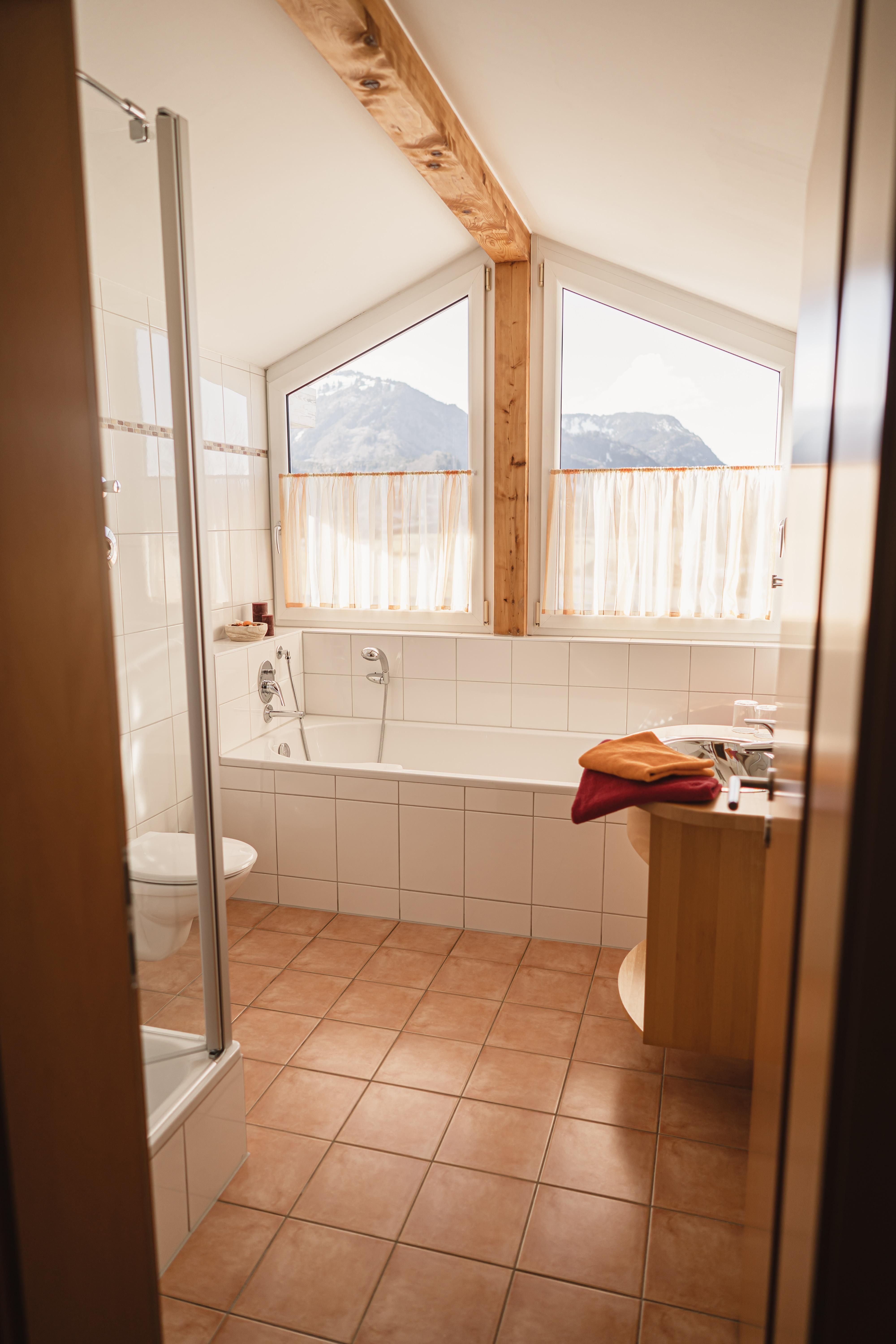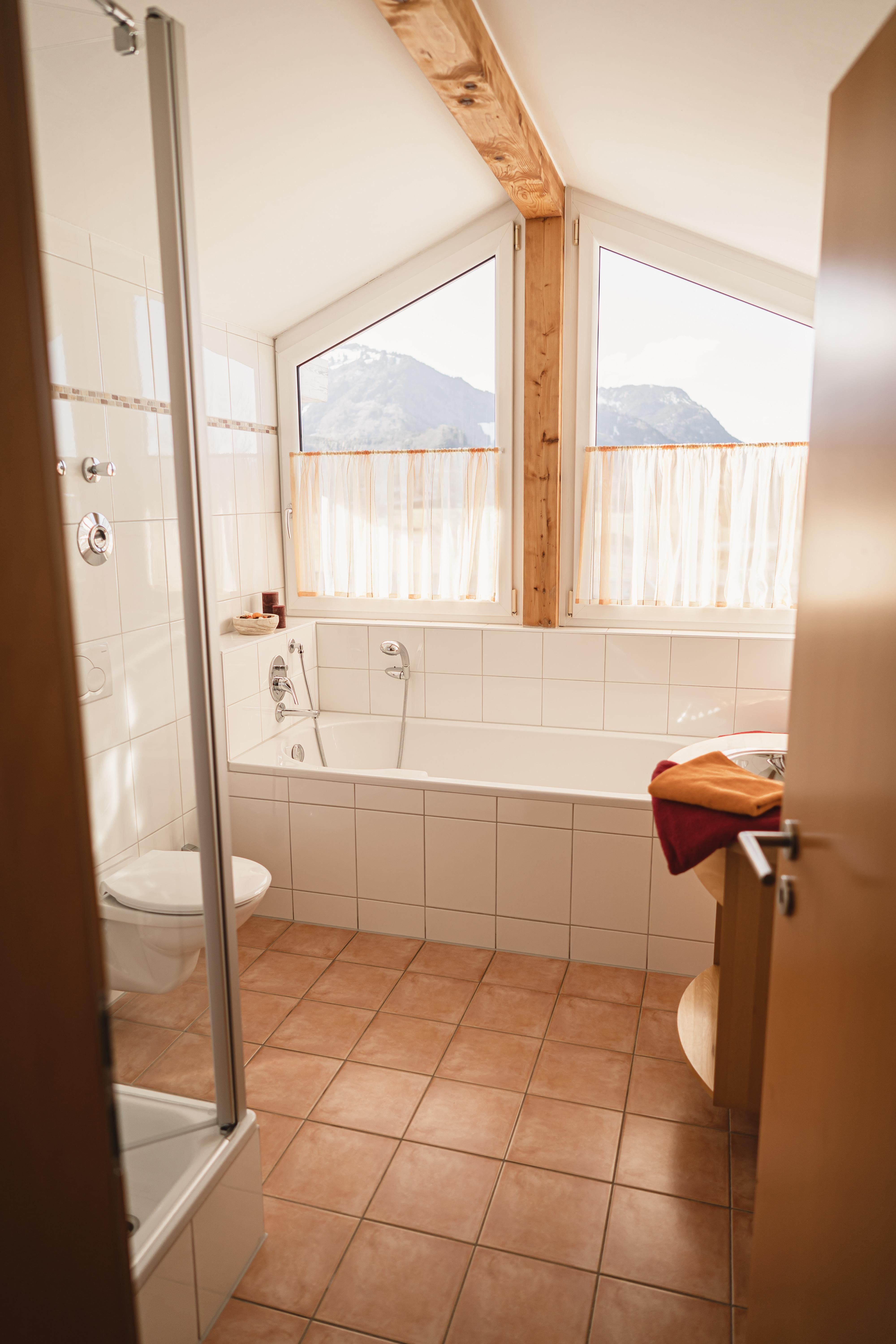 Ein helles Tageslichtzimmerbadezimmer mit Badewanne, Dusche und WC. Der eigene Zugang zum Vital-Park Gelände erfolgt über einen privaten Eingang.