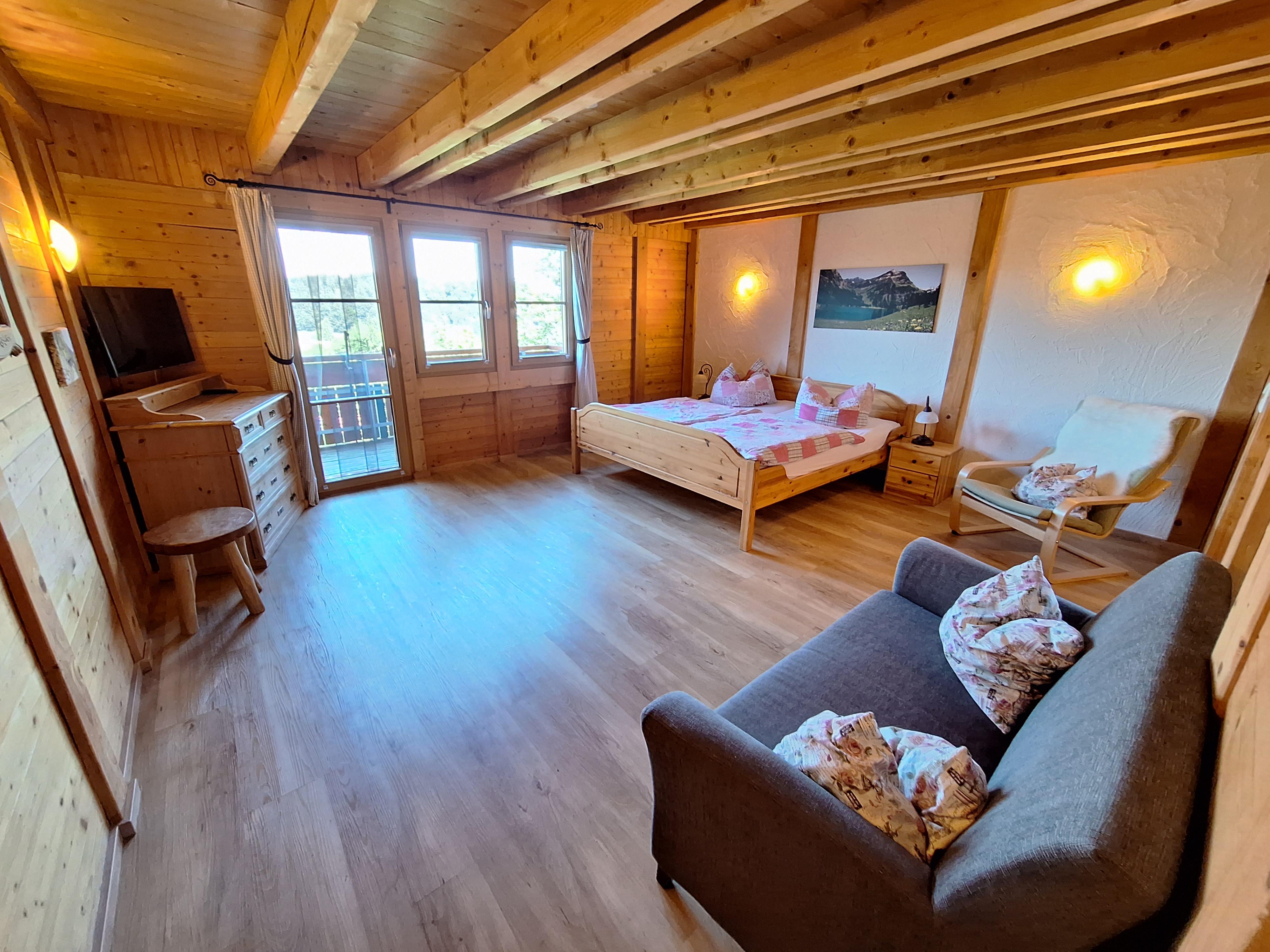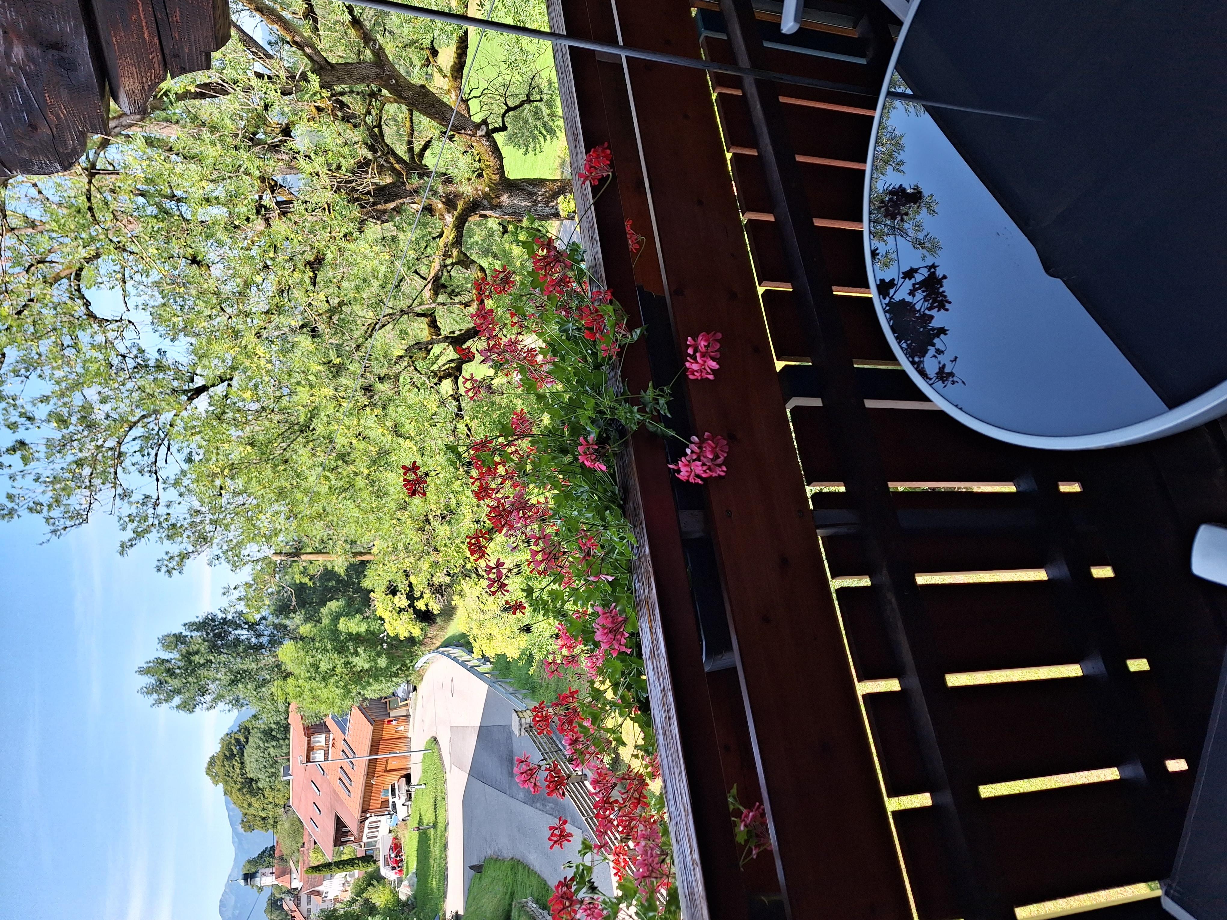 • Balkon mit Sitzmöglichkeit und Blick in Richtung Berge