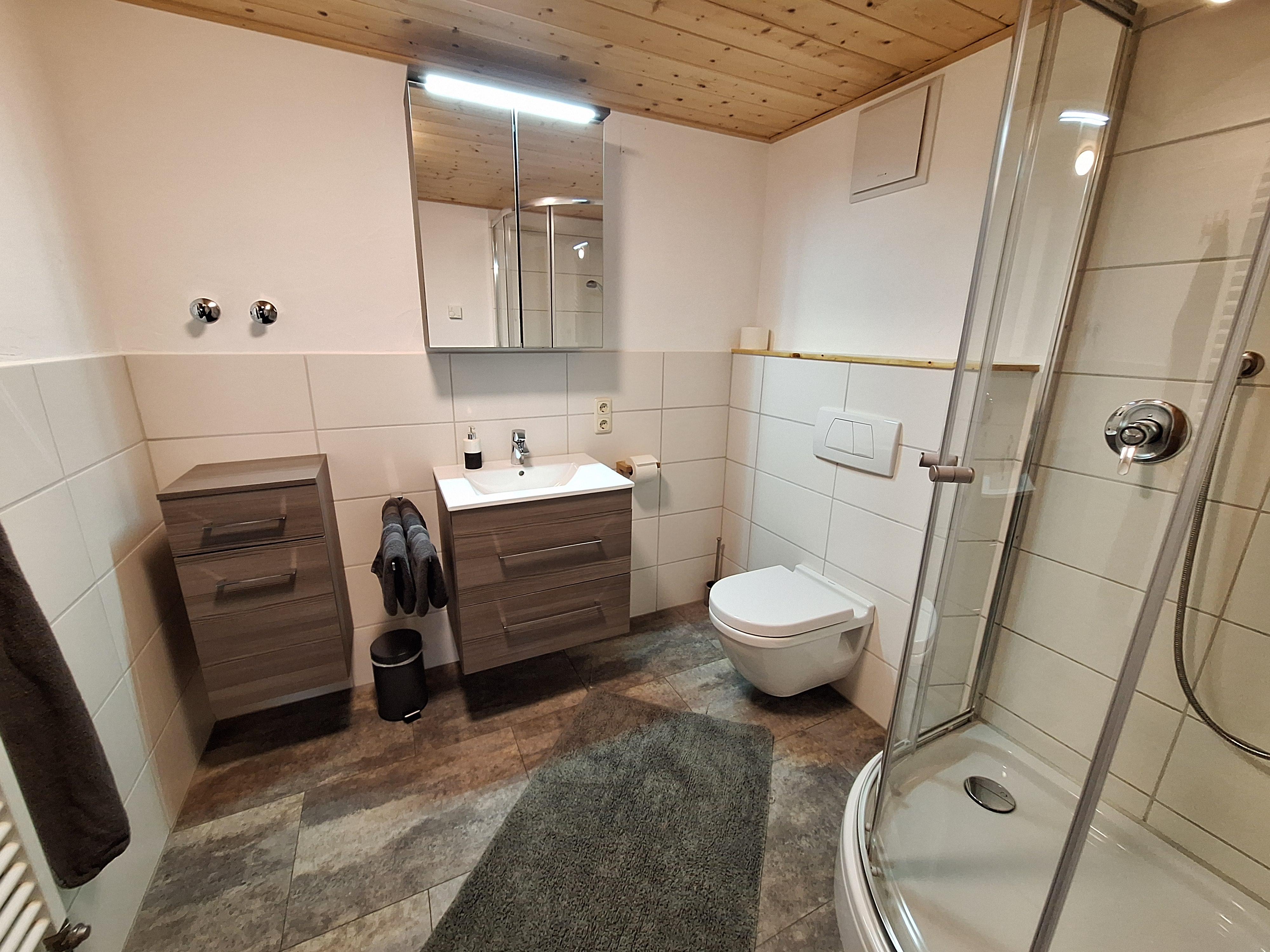 • geräumiges Badezimmer (Dusche, Waschtisch, WC)