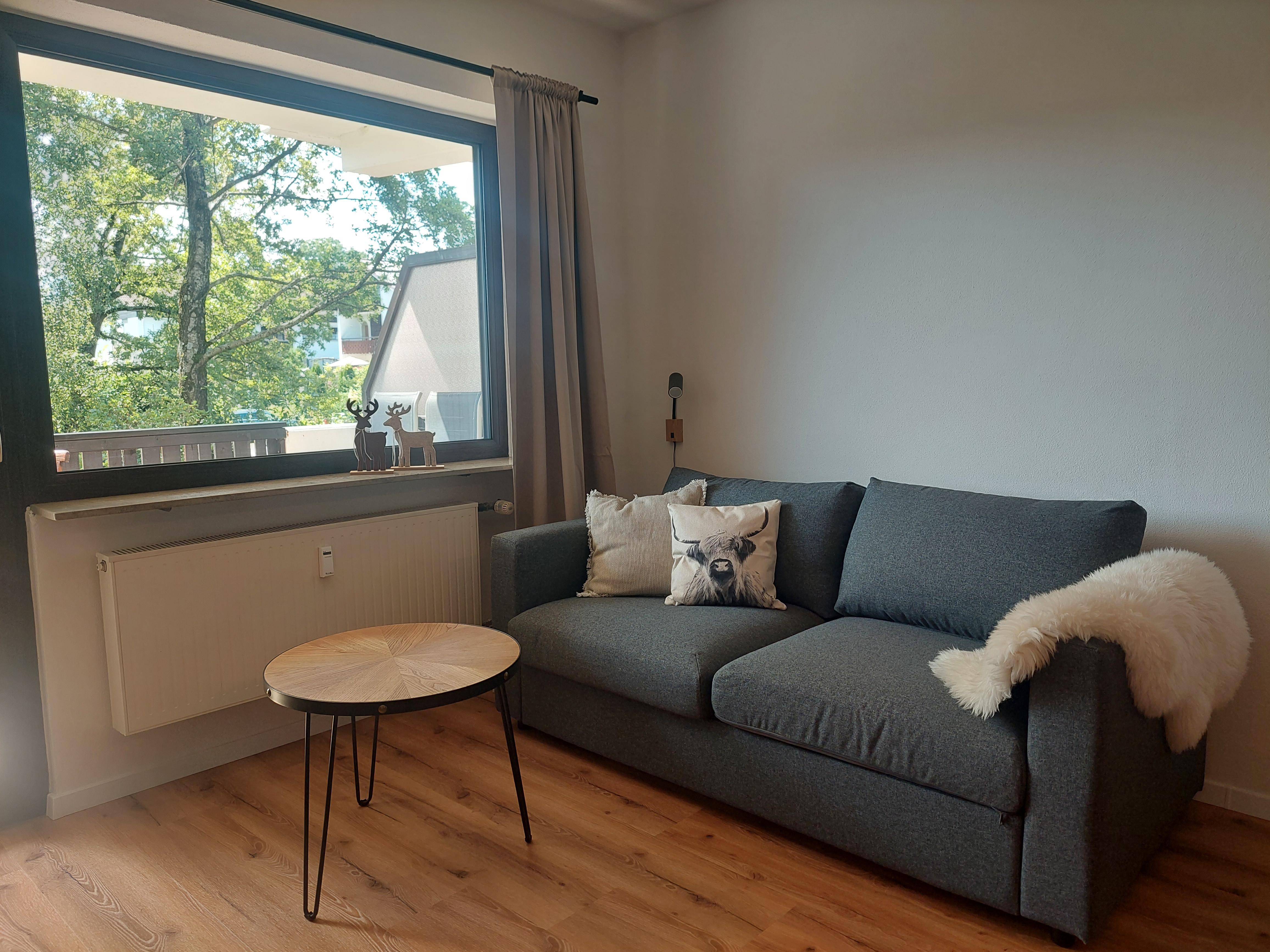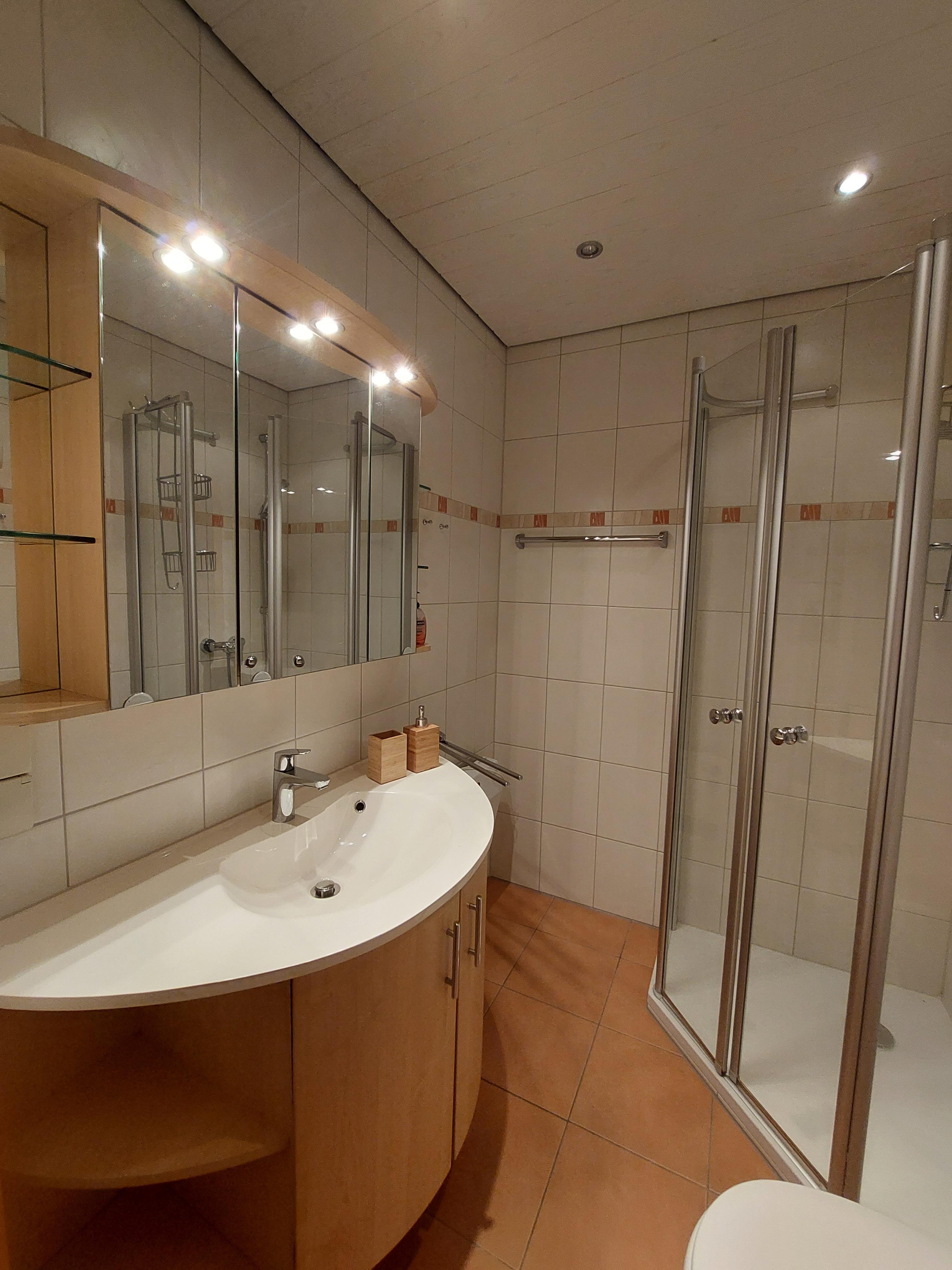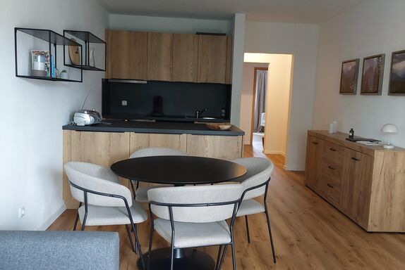 Die Wohnung ist ca. 58qm groß und bietet Platz für bis zu vier Personen. Sie verfügt über ein Schlafzimmer mit Doppelbett und ein Zimmer mit Wohn-/Ess- und Küchenbereich sowie zwei Bäder. Im Wohnzimmer befindet sich eine bequeme und schnell ein- und ausklappbare Doppel-Schlafcouch sowie ein internetfähiger Fernseher. Optional steht ein Baby-Reisebett zur Verfügung. Die neu eingerichtete Küche verfügt über einen Herd mit Backofen, Spülmaschine, Kaffeemaschine, Toaster etc. Vom Wohnzimmer erreicht man den Balkon mit Bergblick.