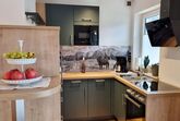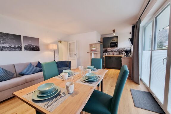 • Wohnküche: Offenes Wohn-Esszimmer mit gemütlicher Sitzecke und einem zusätzlichen Sofabett (180x200), das Platz für 3. und 4. Person bietet. Die voll ausgestattete Küchenzeile lässt keine Wünsche offen, mit Herd, Backofen, Mikrowelle, Kaffeemaschine, Toaster, Wasserkocher, Kühlschrank mit Tiefkühlfach und Geschirrspüler.