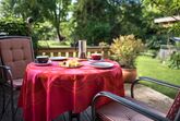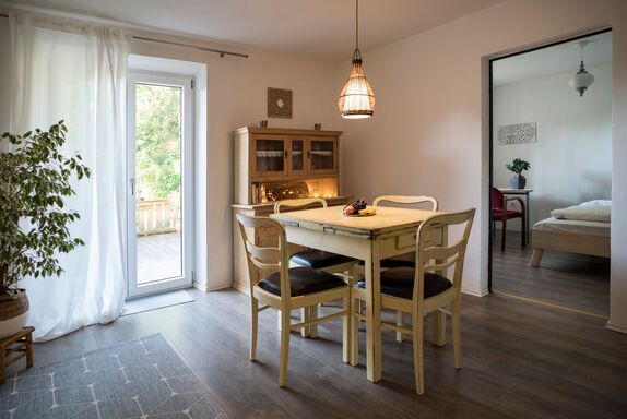1 Wohn-Esszimmer mit Zugang zur Terrasse (Tisch, 4 Gartenstühle, Rattanliege, Sonnenschirm),