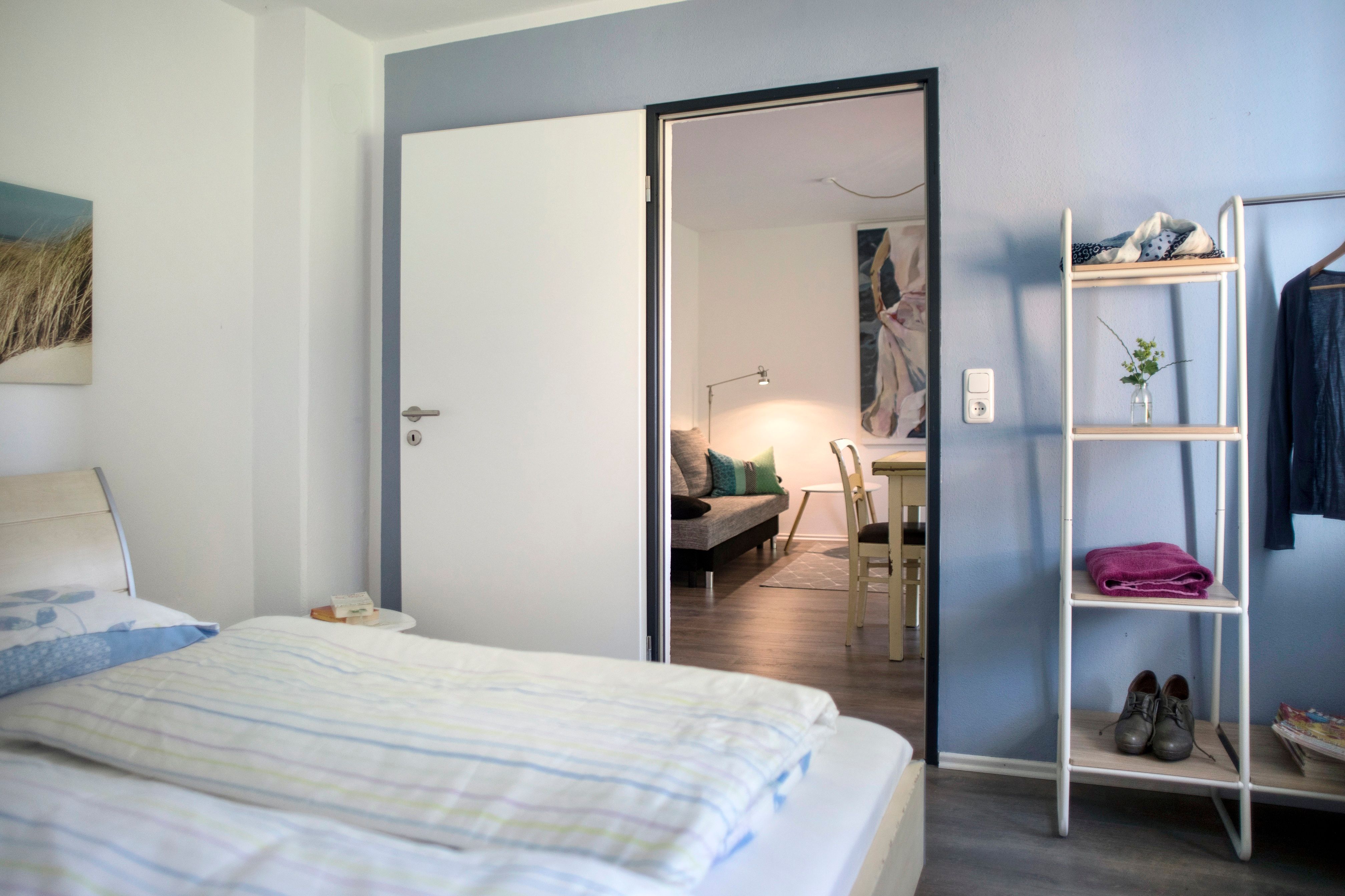 Zusätzlich zum Doppelbett (bequeme Matratze) im Schlafzimmer gibt es bspw. für Kinder oder Freunde ein Schlafsofa im WZ (für 2 Personen)