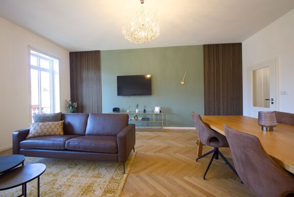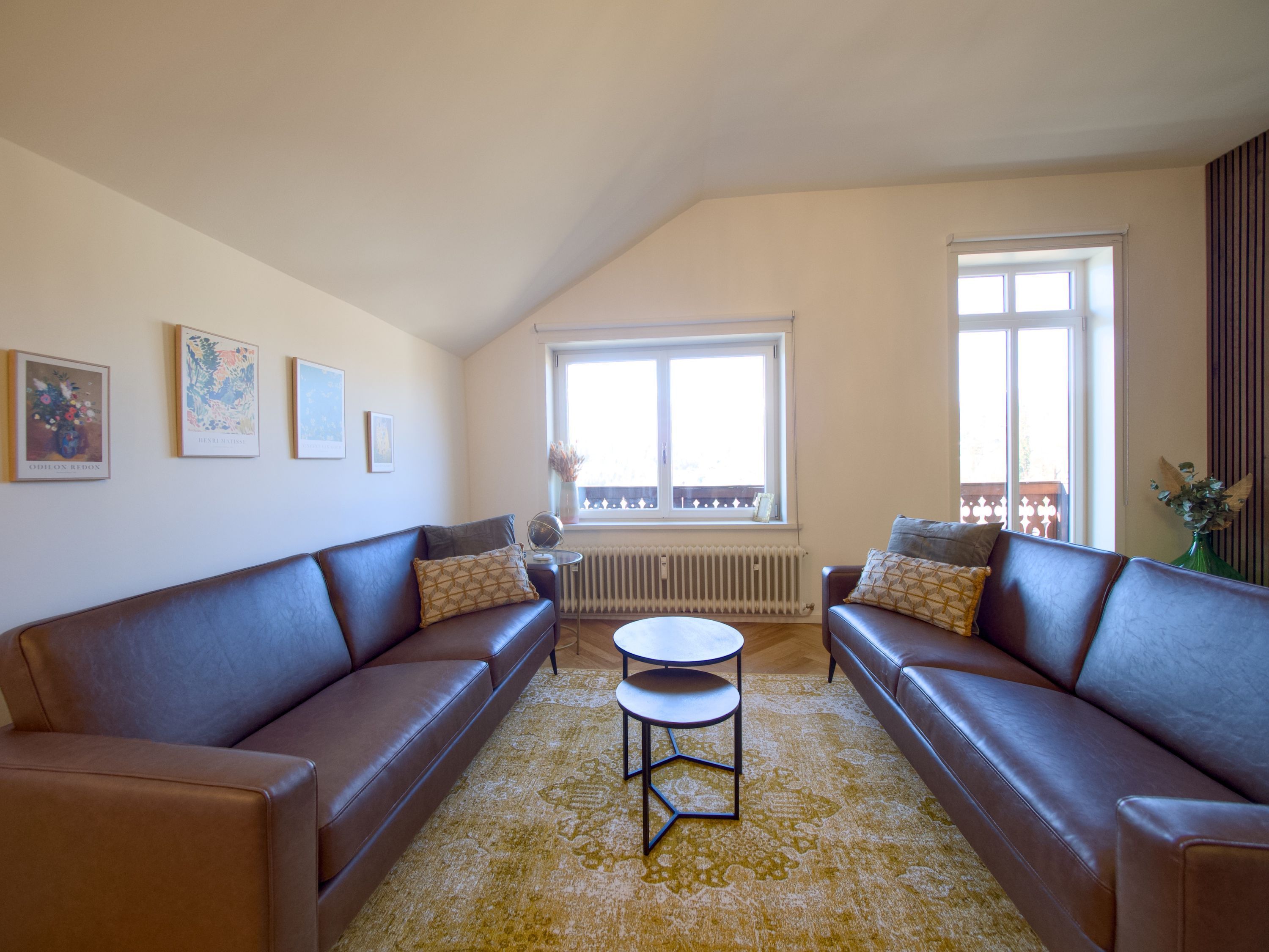 • Großzügiges Wohnzimmer mit stilvollem Interieur, gemütlicher Sitzecke und direktem Zugang zum Balkon.
