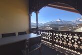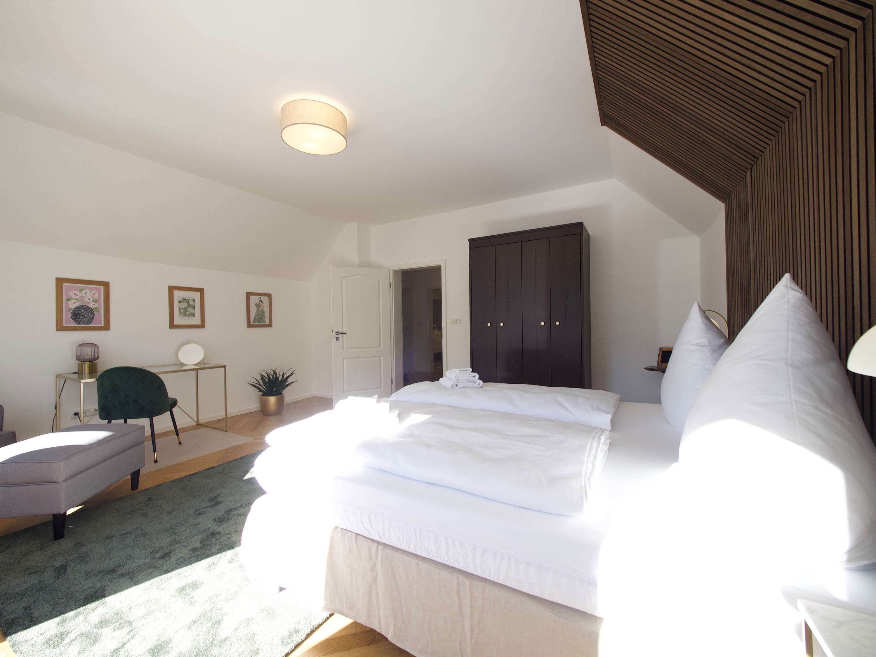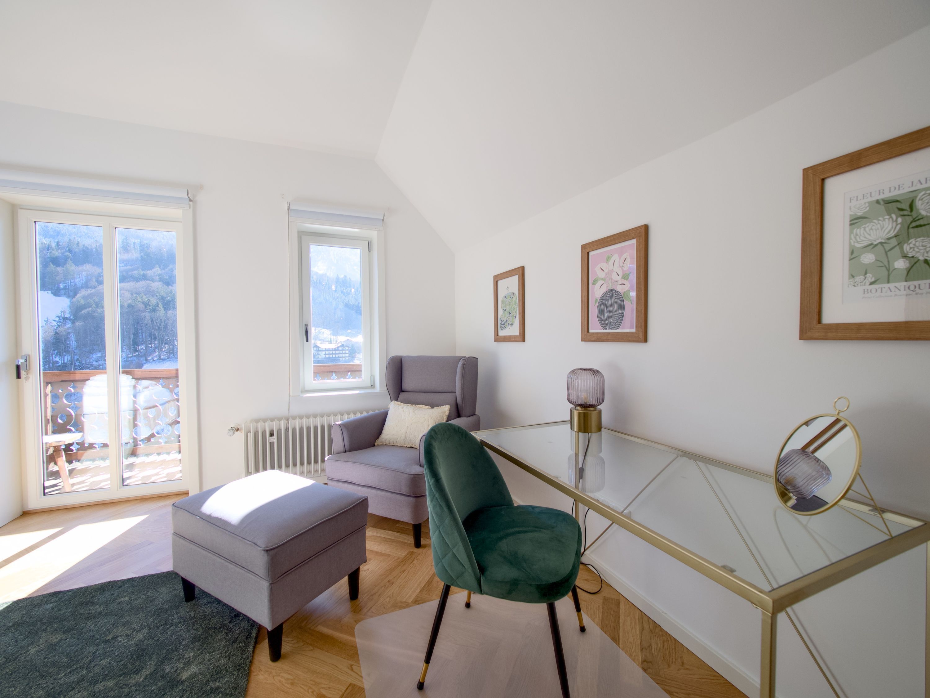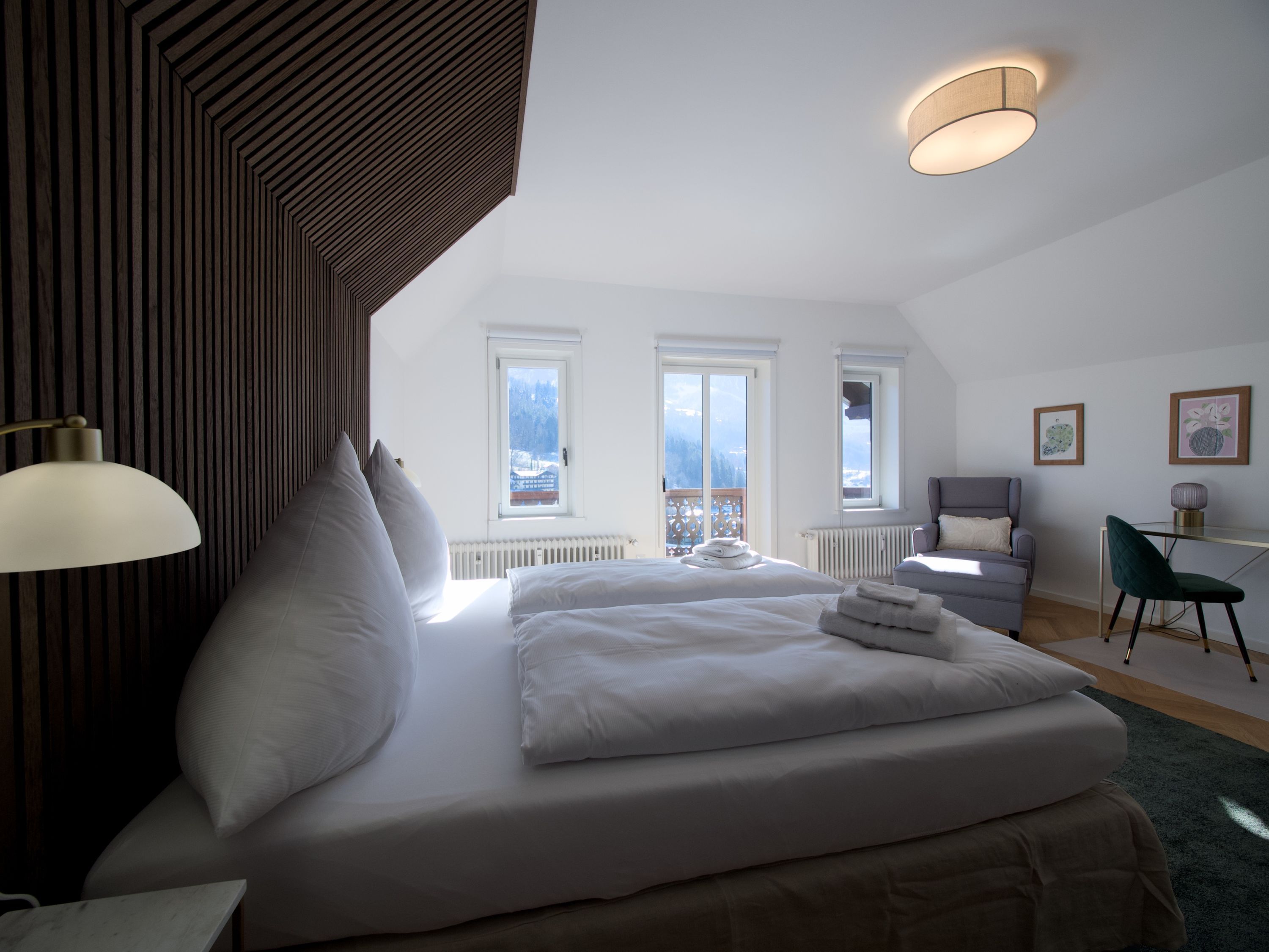• Hauptschlafzimmer mit Doppelbett, Schreibtisch und eigenem Balkon mit beeindruckender Aussicht auf die Berge.