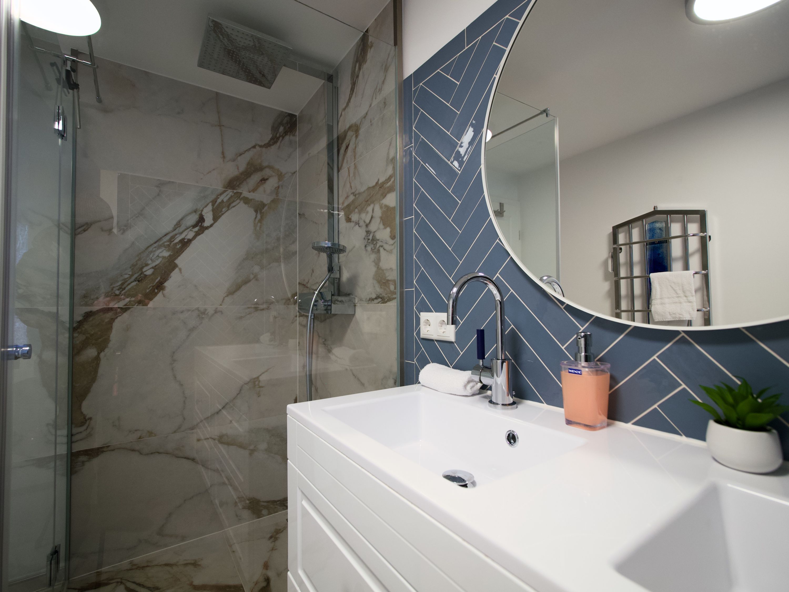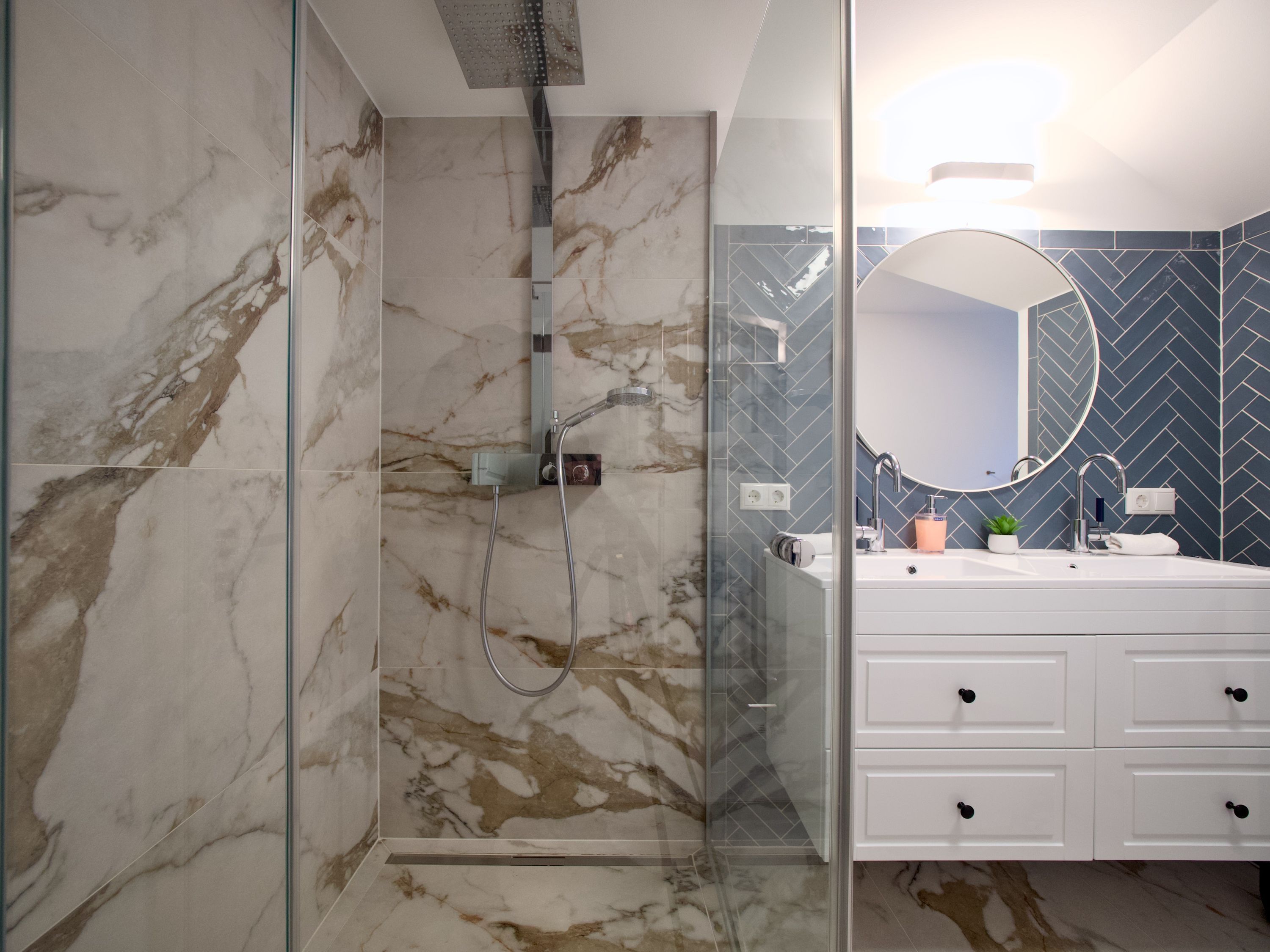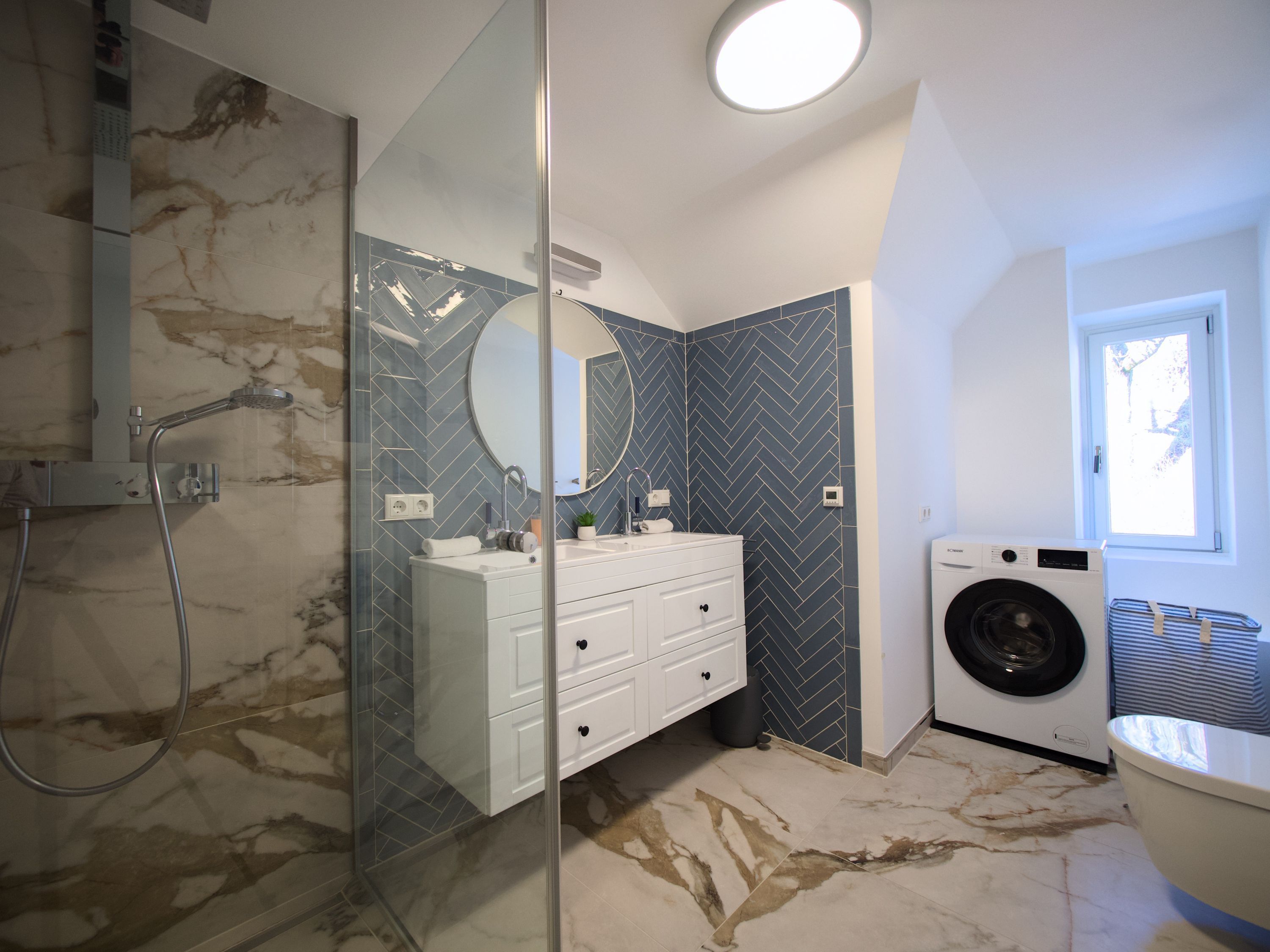 • Stilvolles Badezimmer mit großer Dusche, Waschbecken, WC und Waschmaschine.