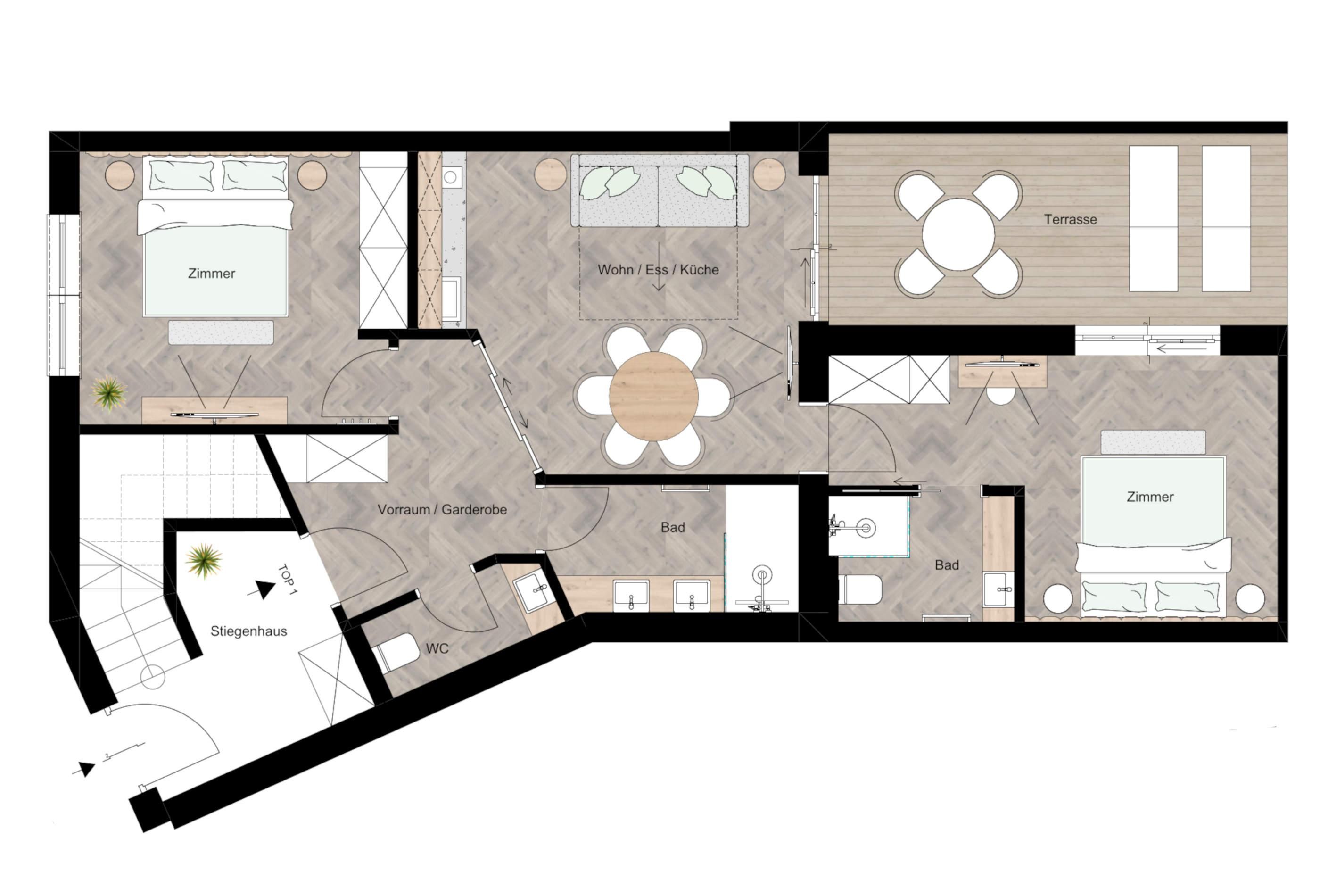 Chalet Apartment Grieskogl mit ca. 60 m² und Ostterrasse mit eingeschränkter Aussicht: 2 Doppelzimmer, 1 Bedzimmer mit Dusche, 1 Badezimmer mit Dusche/WC, 1 separates WC, vollausgestattete Wohnküche mit Schlafsofa für 2 weitere Personen, Nespresso Business Kaffeemaschine, Geschirrspüler, Mikrowelle, 2-Platten-Herd, Kühlschrank uvm.