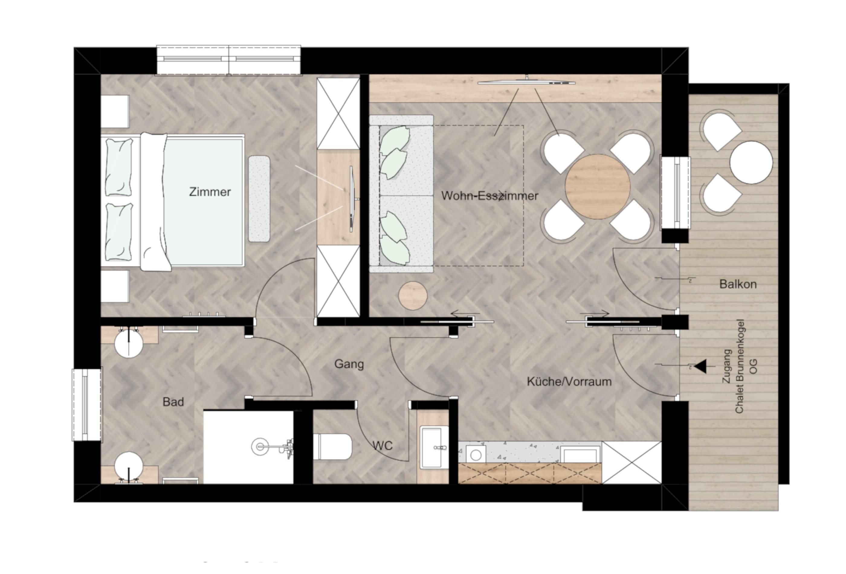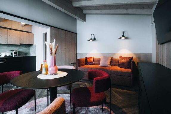 Chalet Suite Brunnenkogl mit ca. 45 m² und Südbalkon: 1 Doppelzimmer, 1 Bedzimmer mit Dusche, 1 separates WC, vollausgestattete Wohnküche mit Schlafsofa für 2 weitere Personen, Nespresso Business Kaffeemaschine, Geschirrspüler, Mikrowelle, 2-Platten-Herd, Kühlschrank uvm.