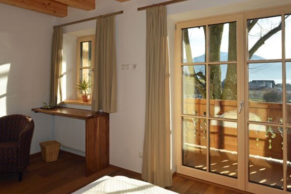 Unser neues Doppelzimmer ist mit Möbeln aus Nussholz ausgestattet. Vom großen Balkon aus sieht man den Attersee und das Gebirge.