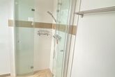 Zum Bad gehört: eine begehbare Dusche/Regendusche, Toilette, Waschbecken, Haartrockner, Handtücher und ein Wäscheständer.