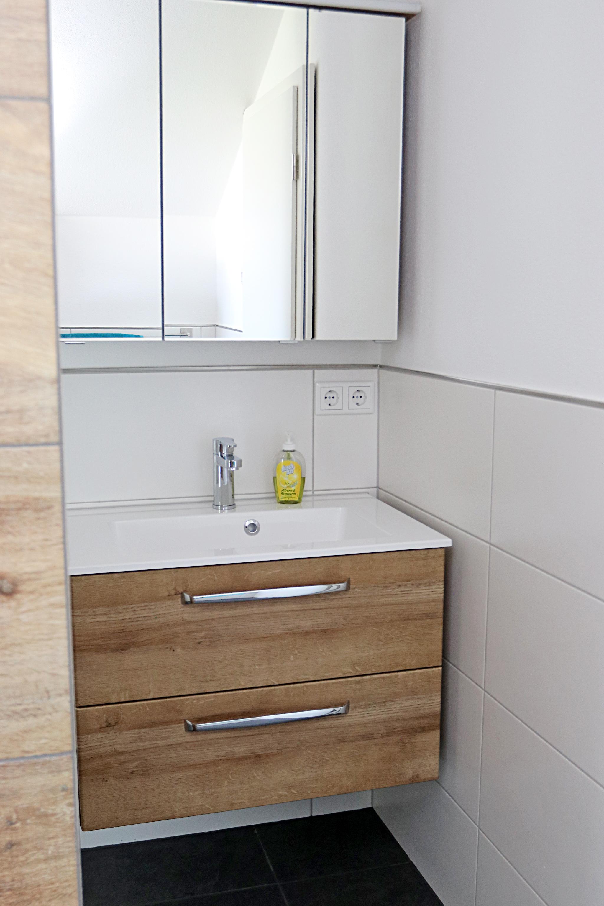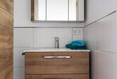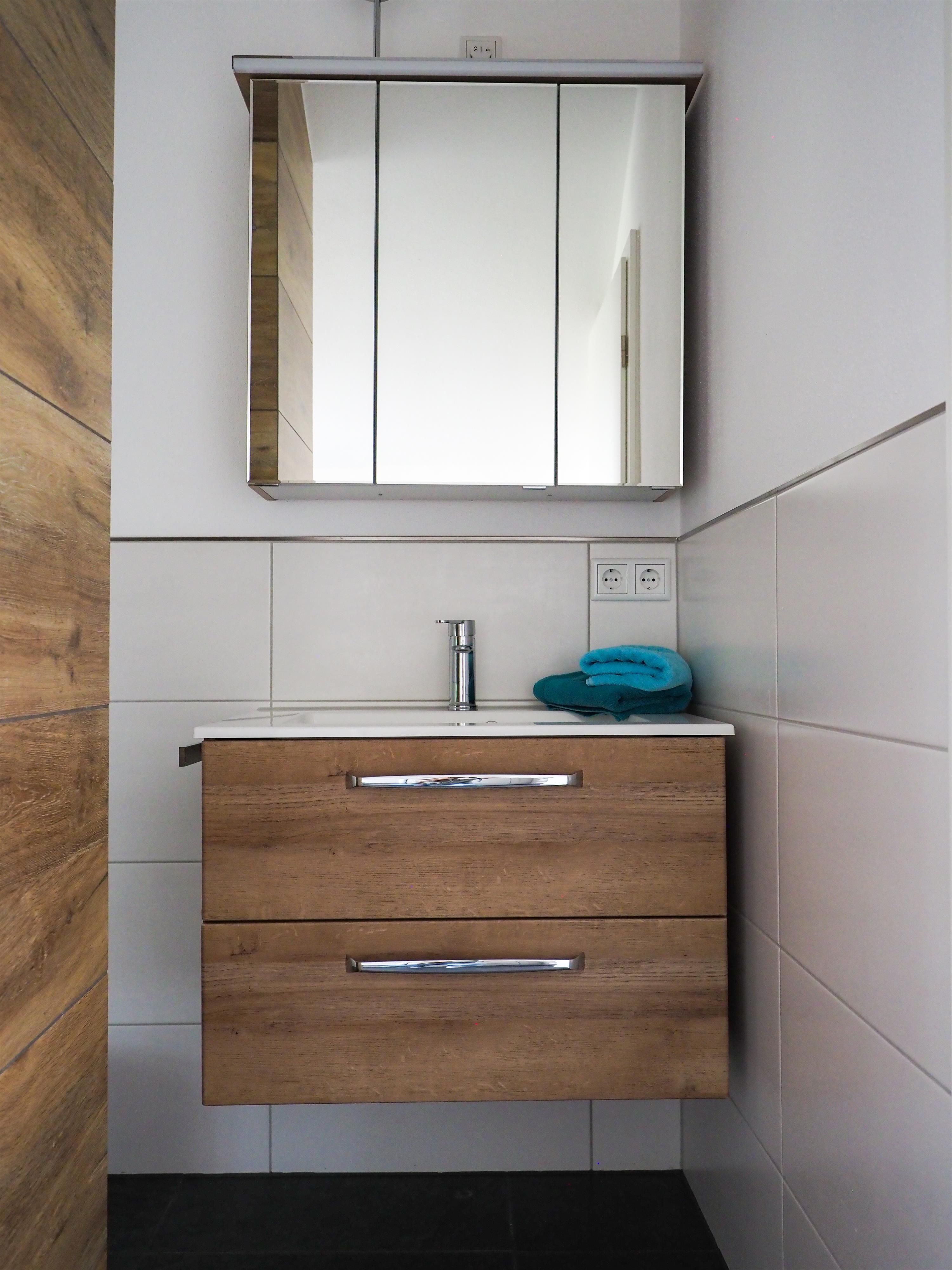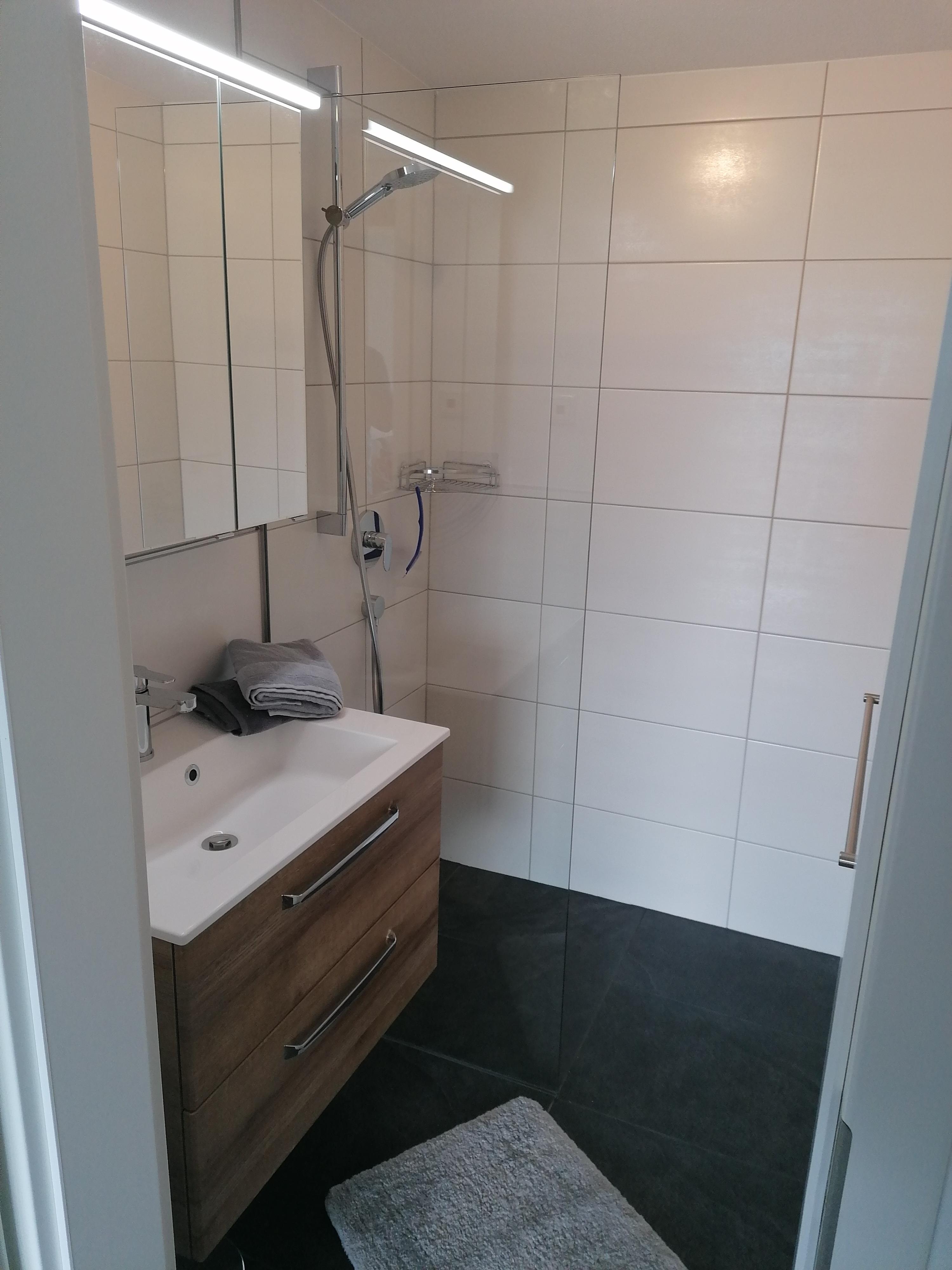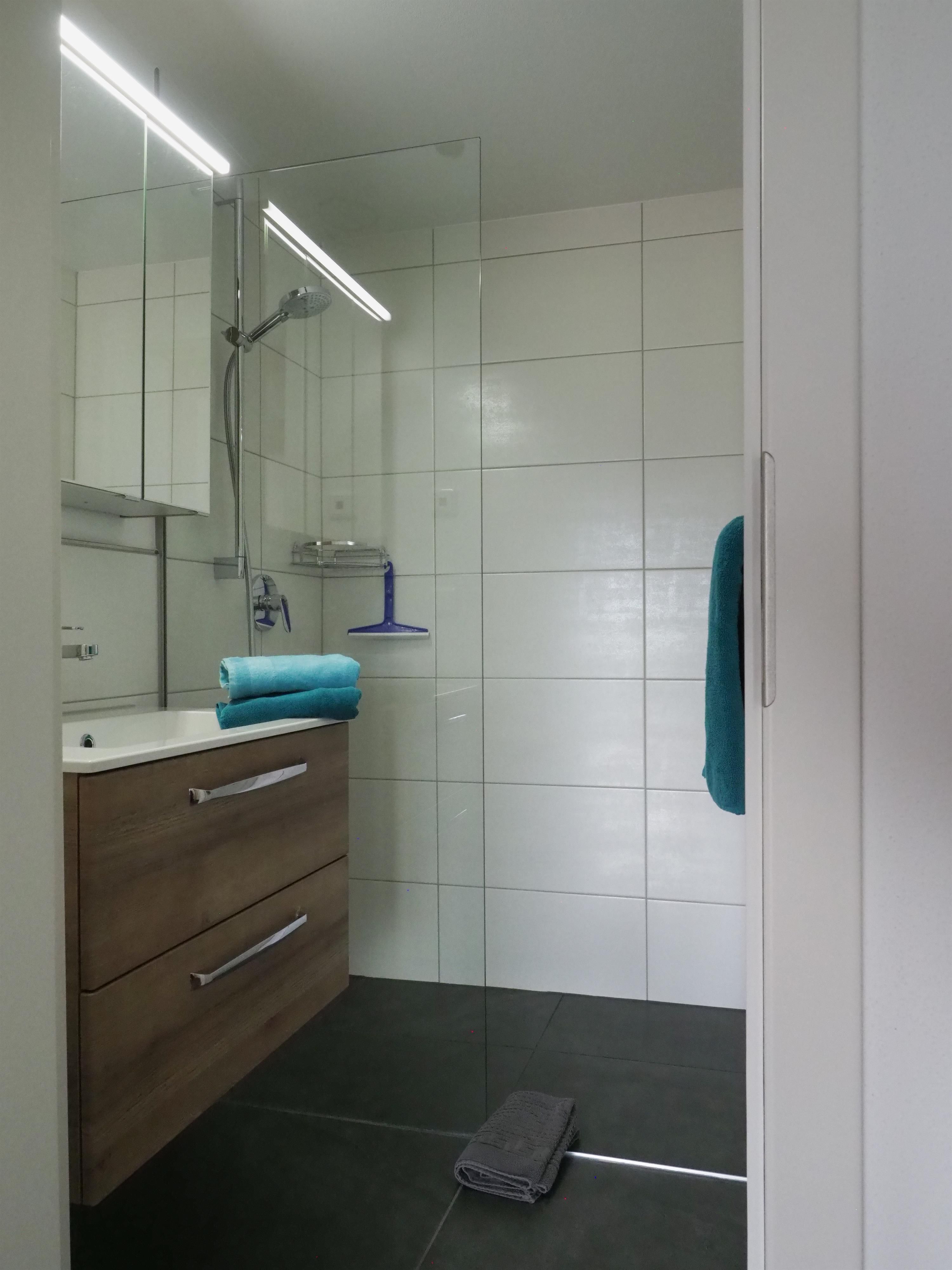 Das Bad ist mit einer begehbaren Dusche, Einbauwaschbecken mit Spiegelschrank und WC ausgestattet.