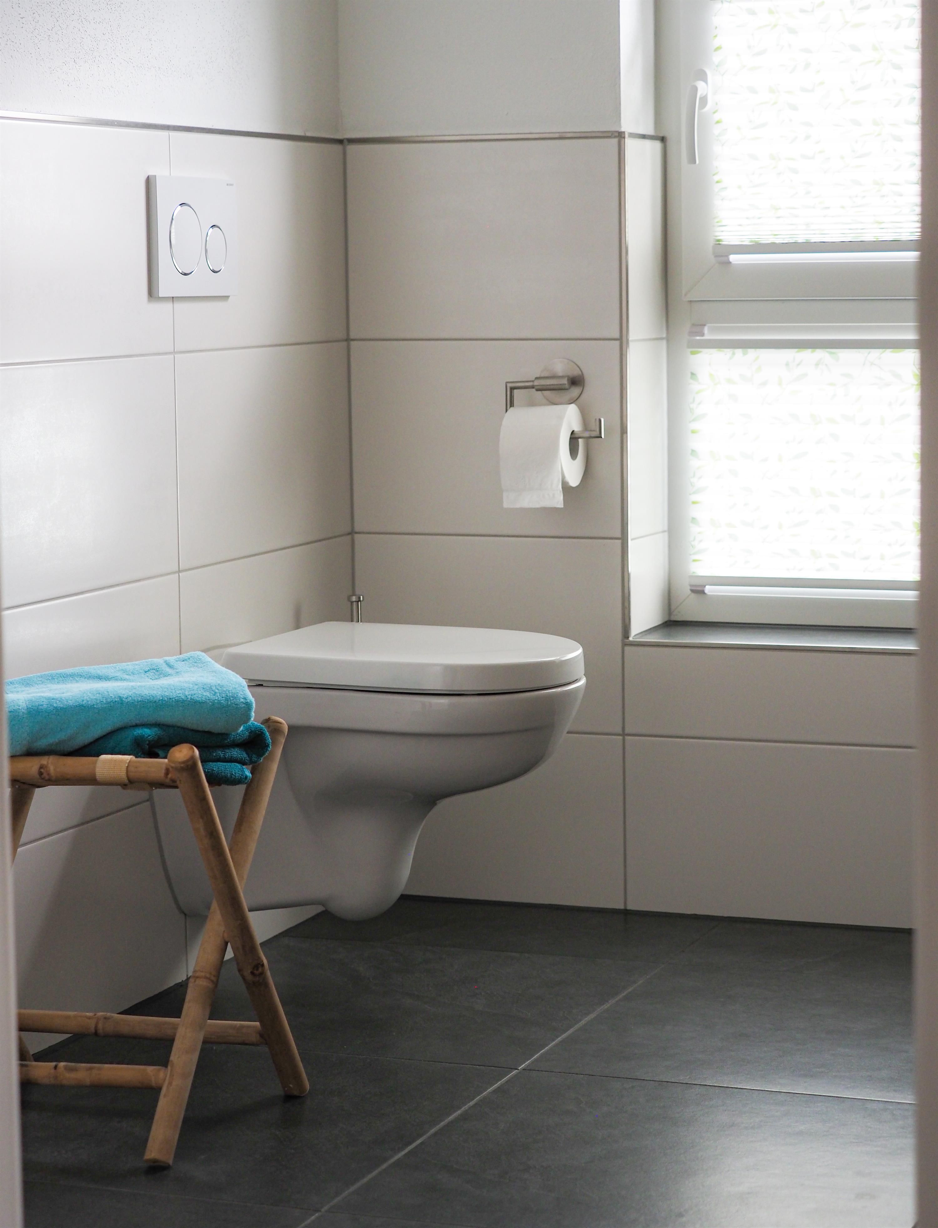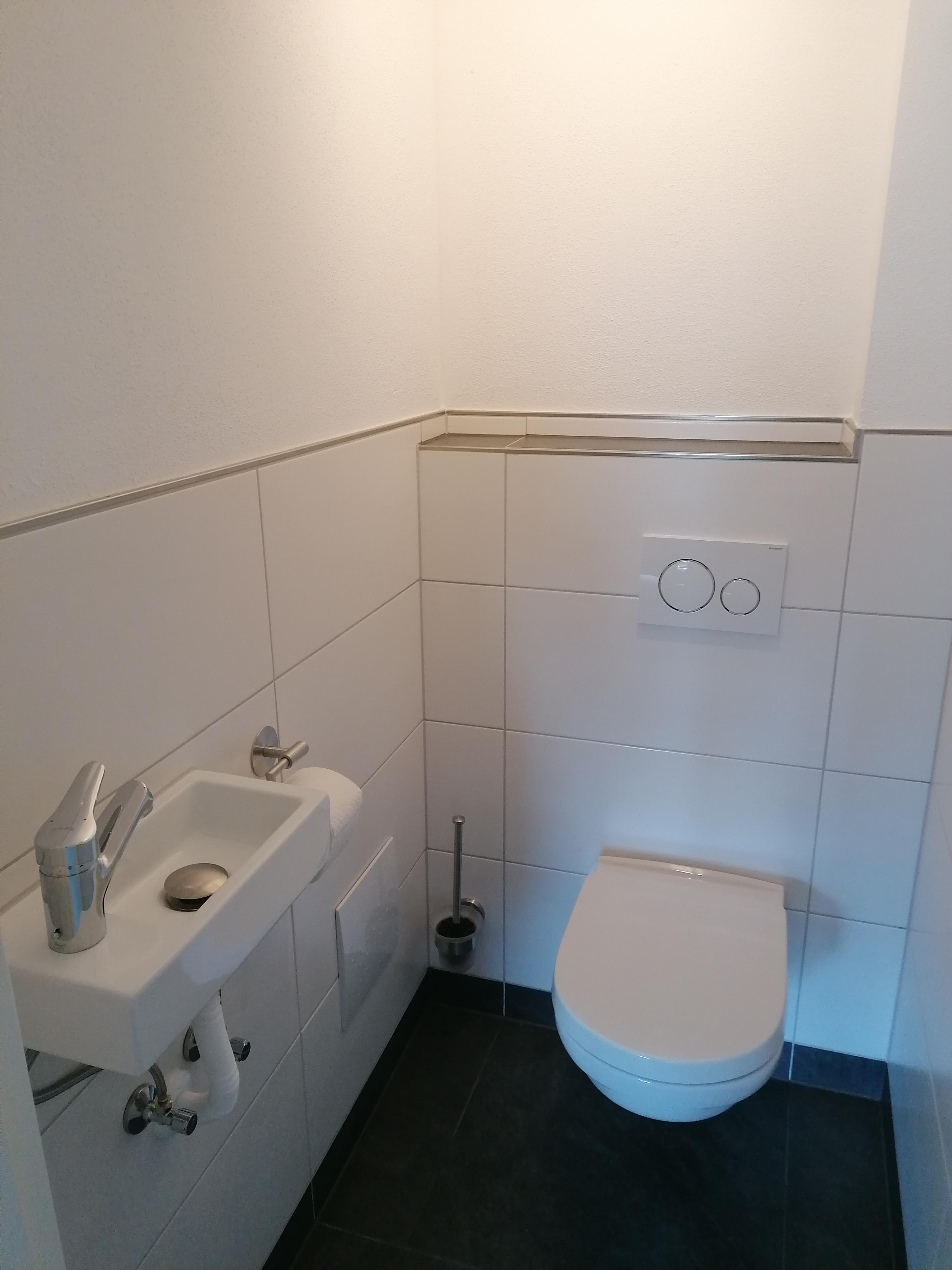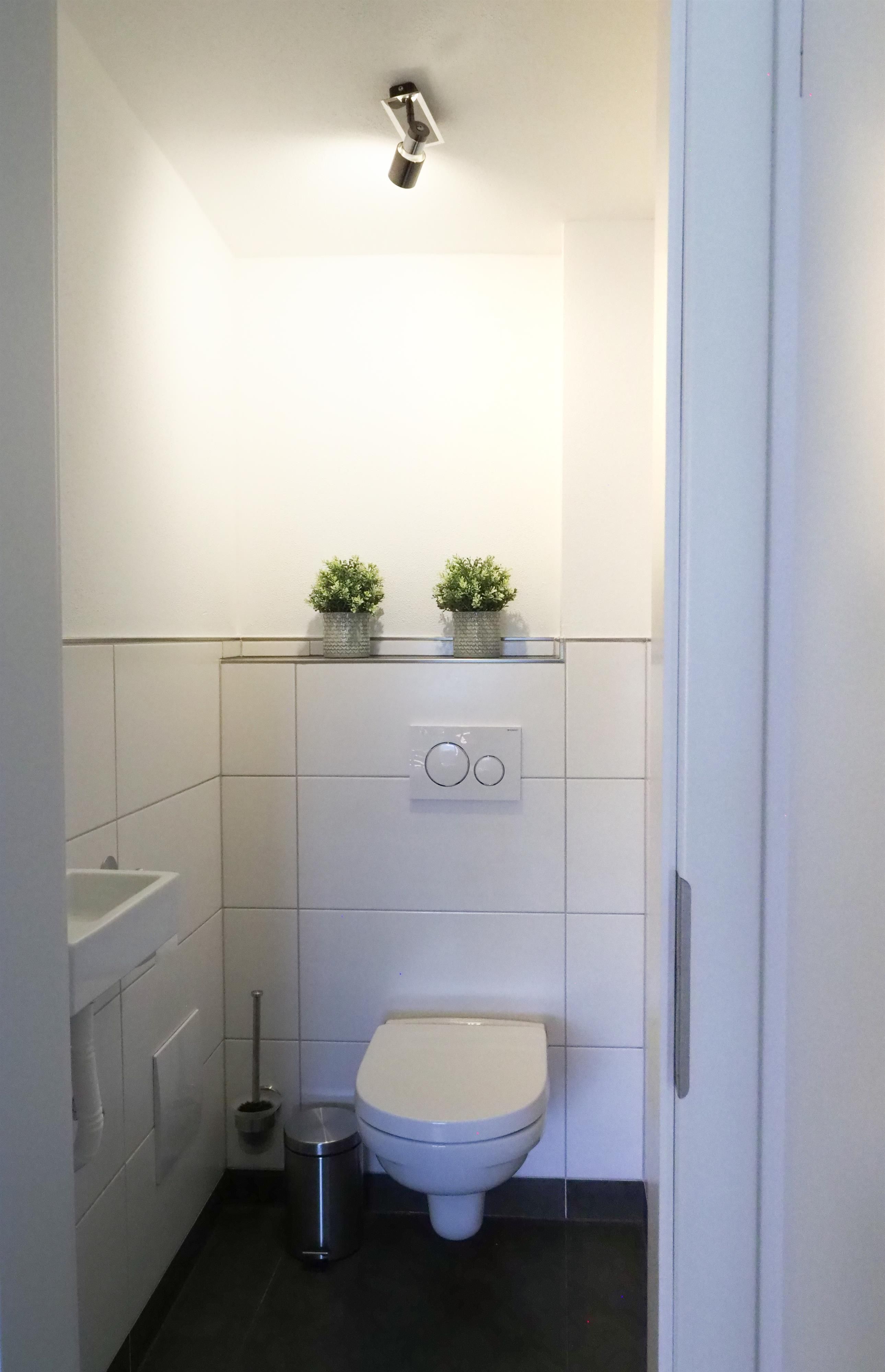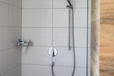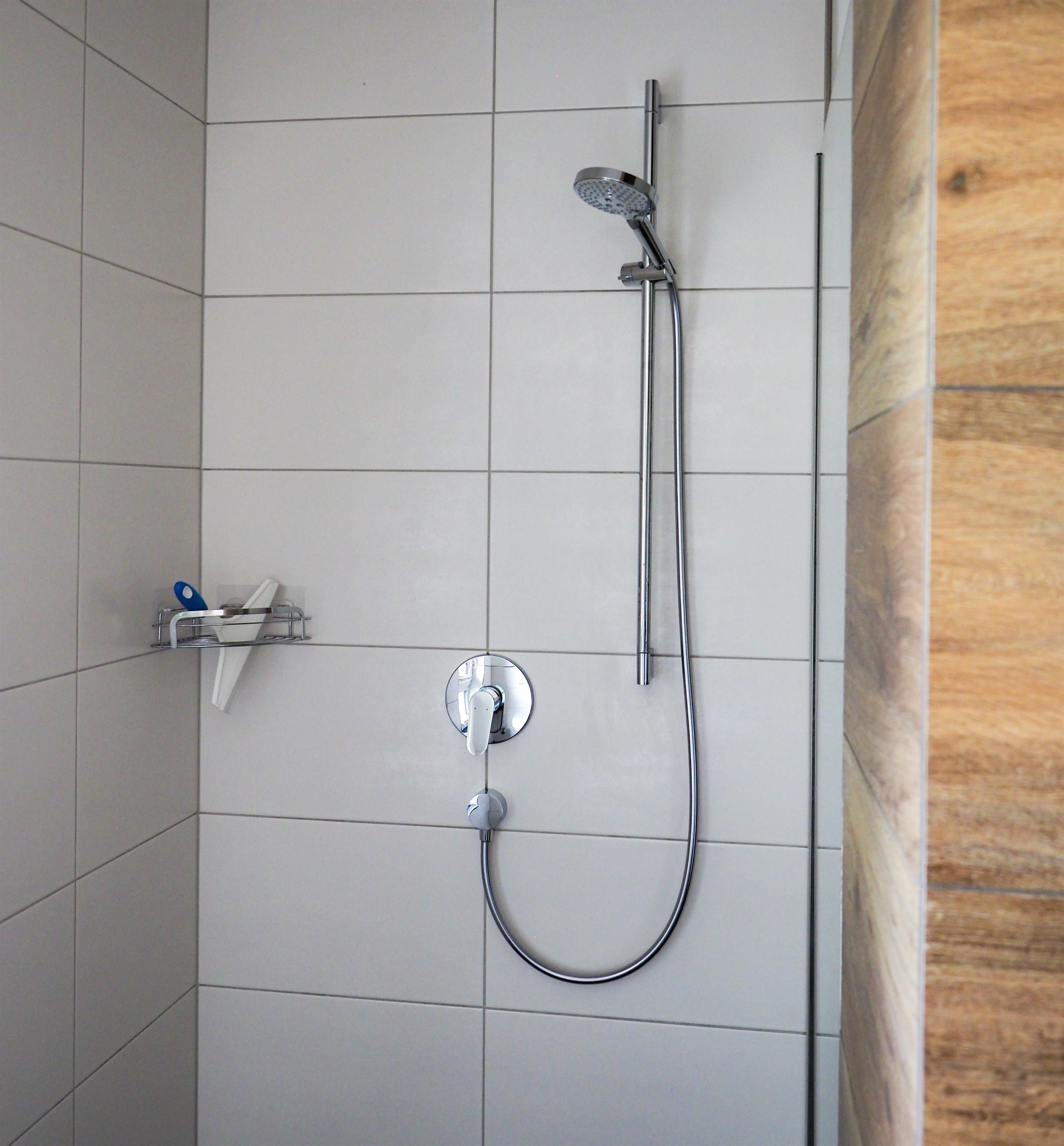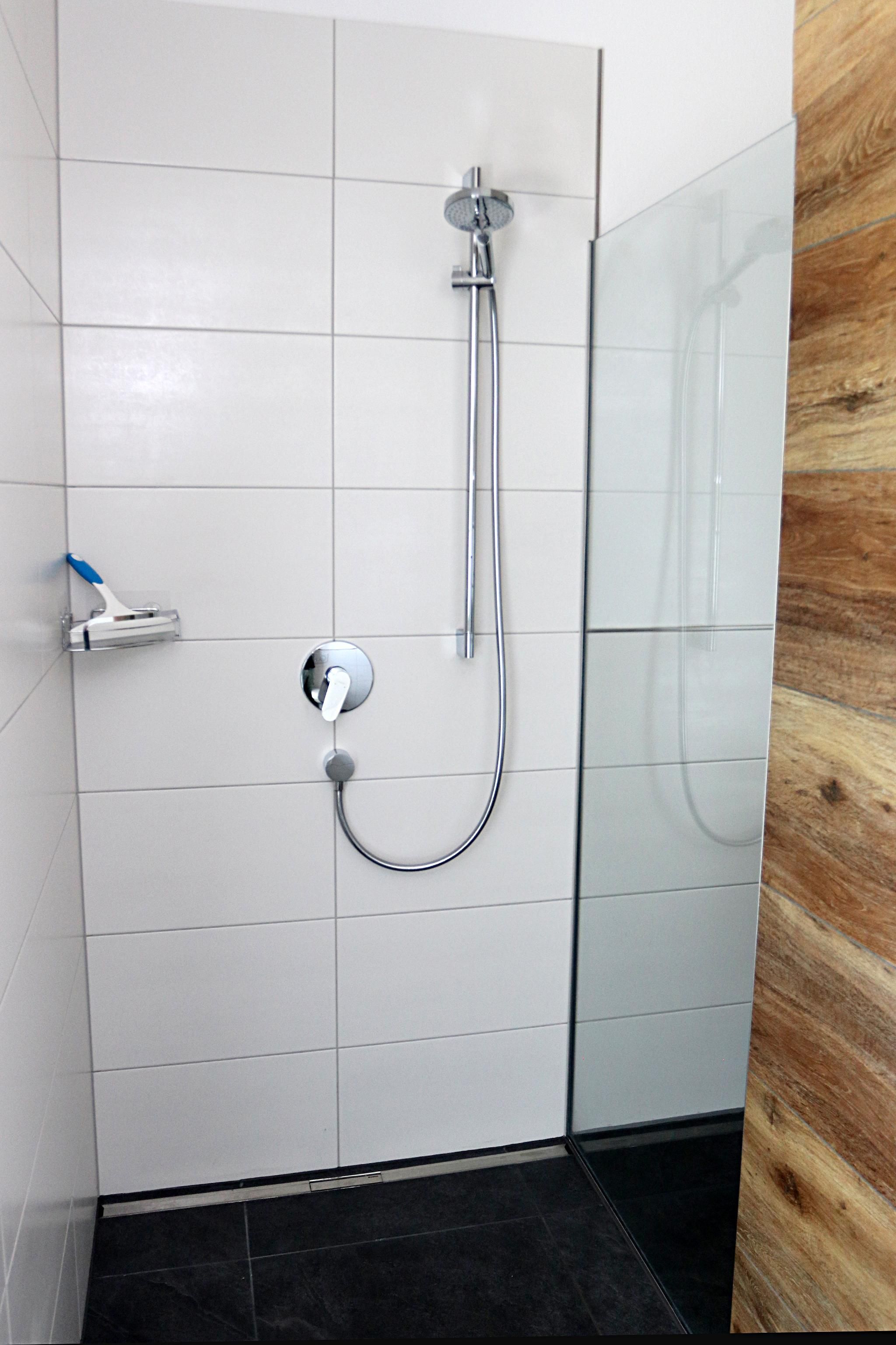 Das Bad ist mit einer begehbaren Dusche, Einbauwaschbecken mit Spiegelschrank und WC ausgestattet.