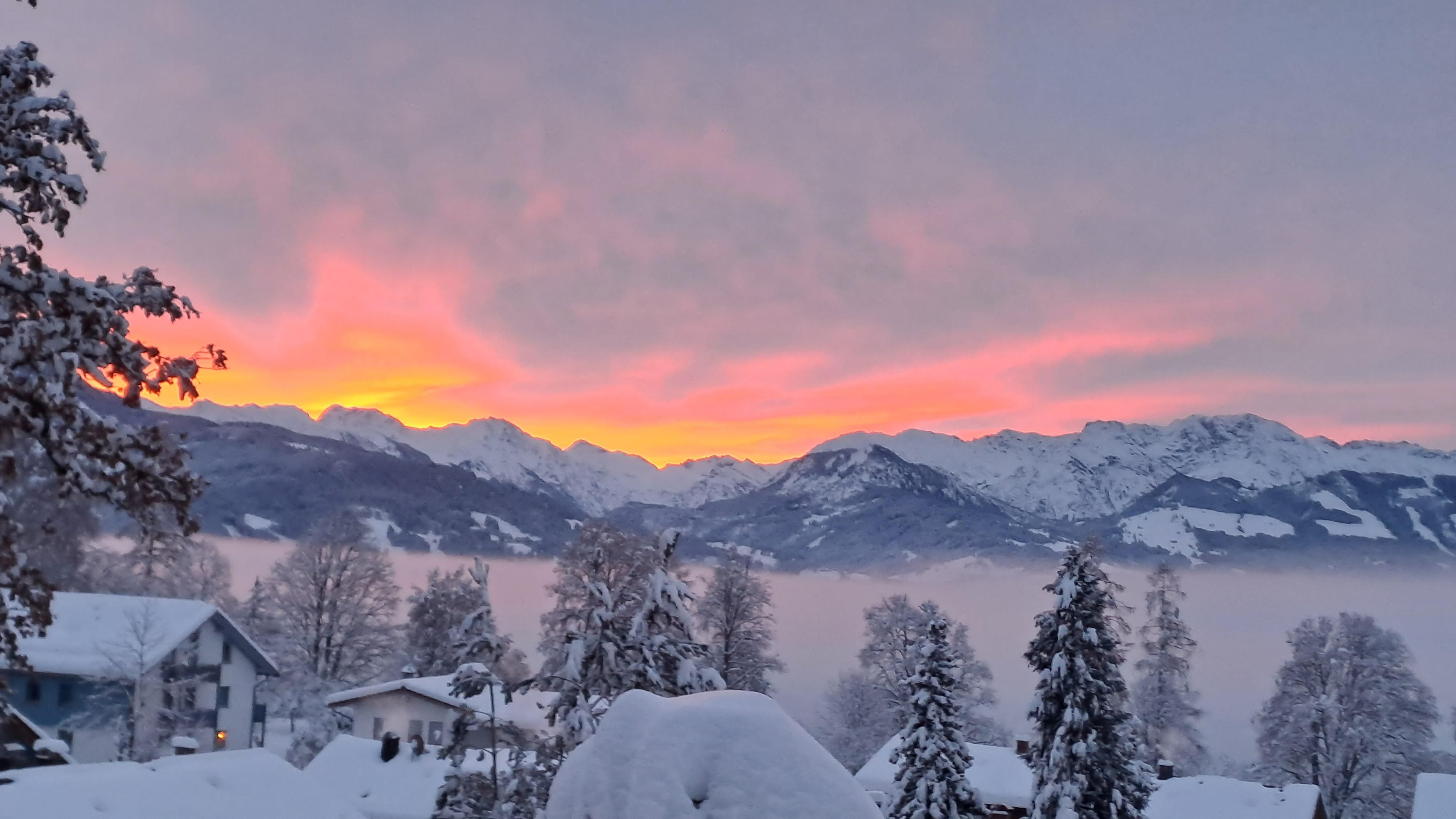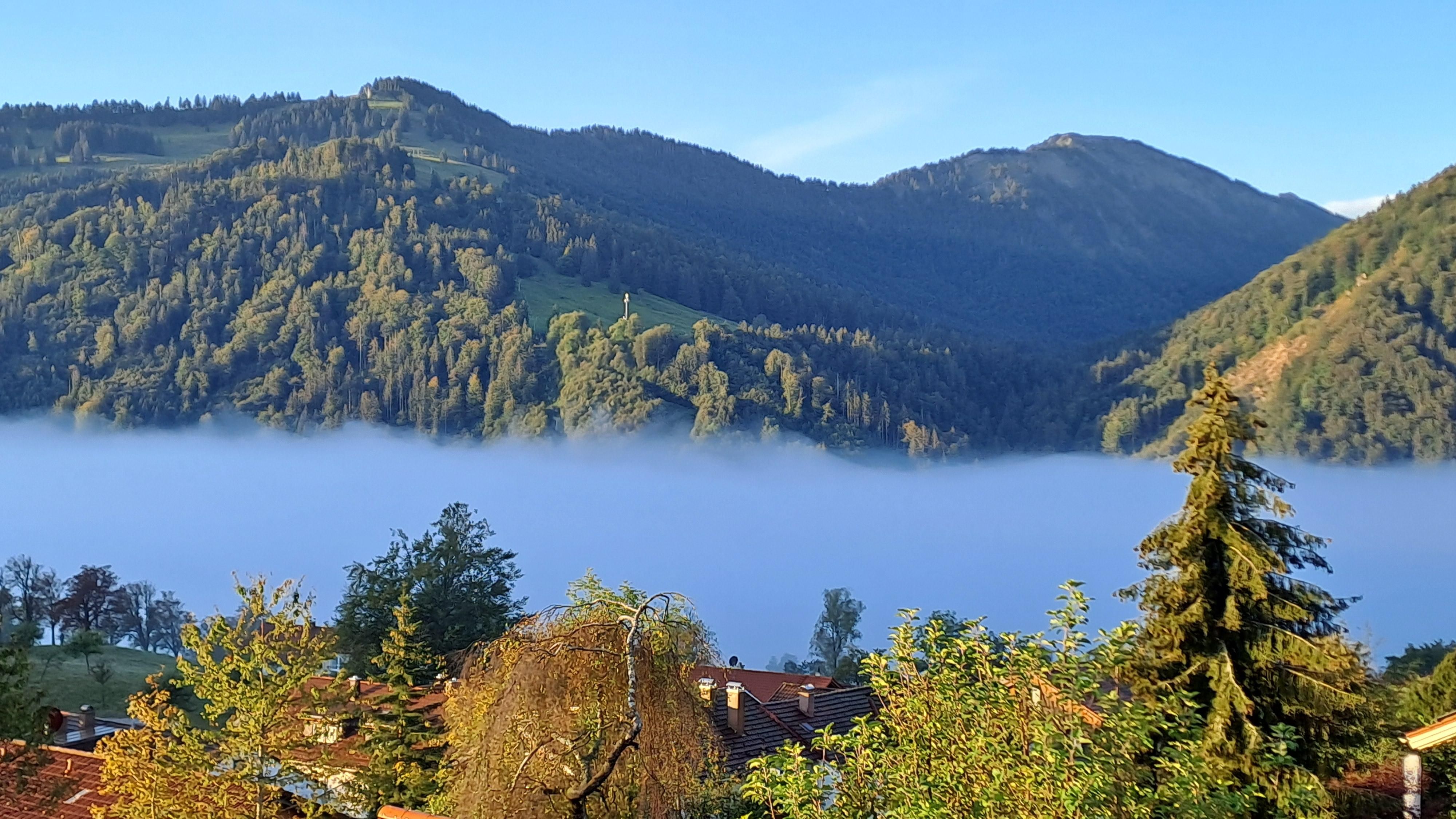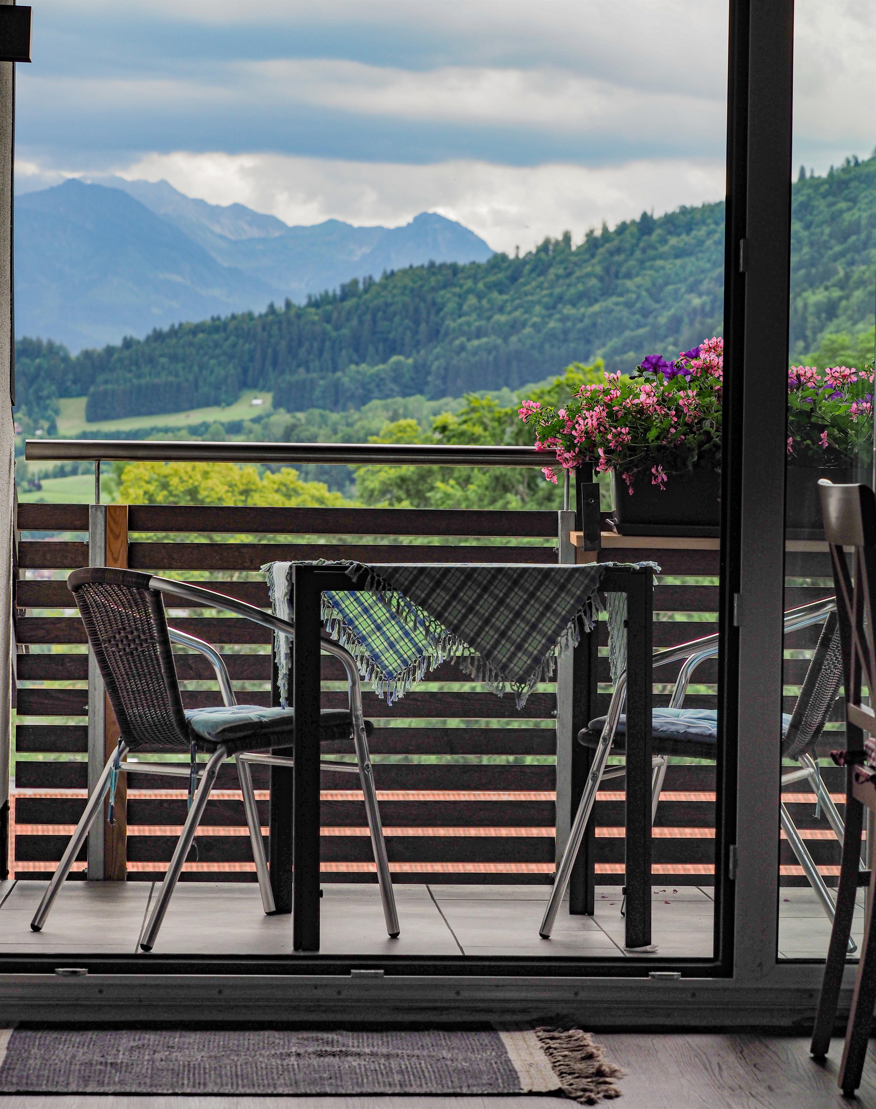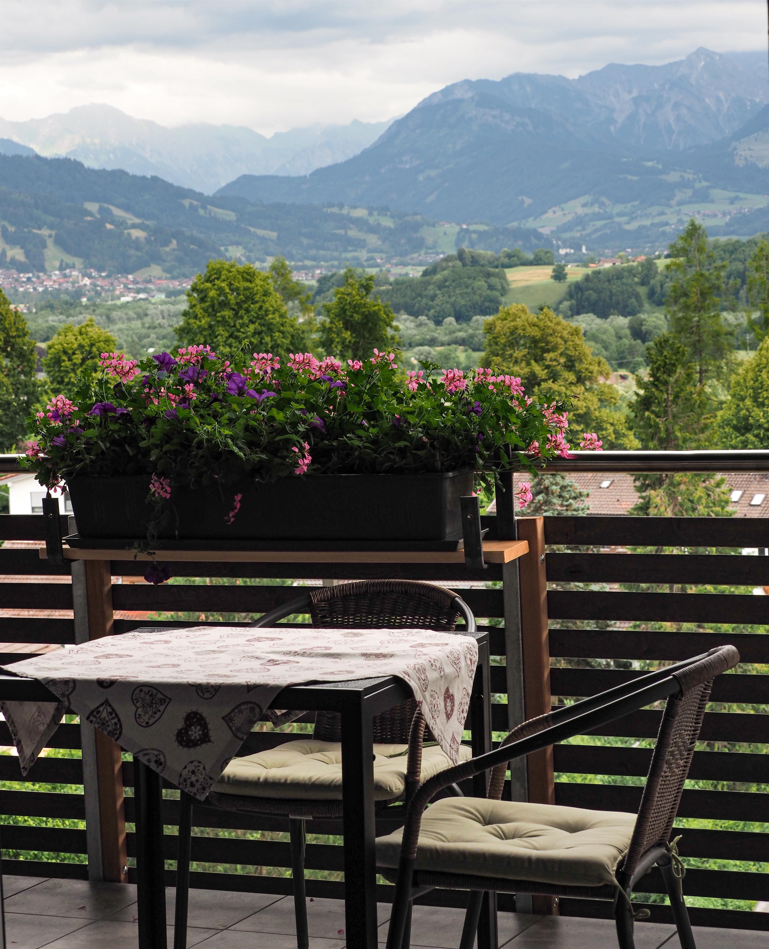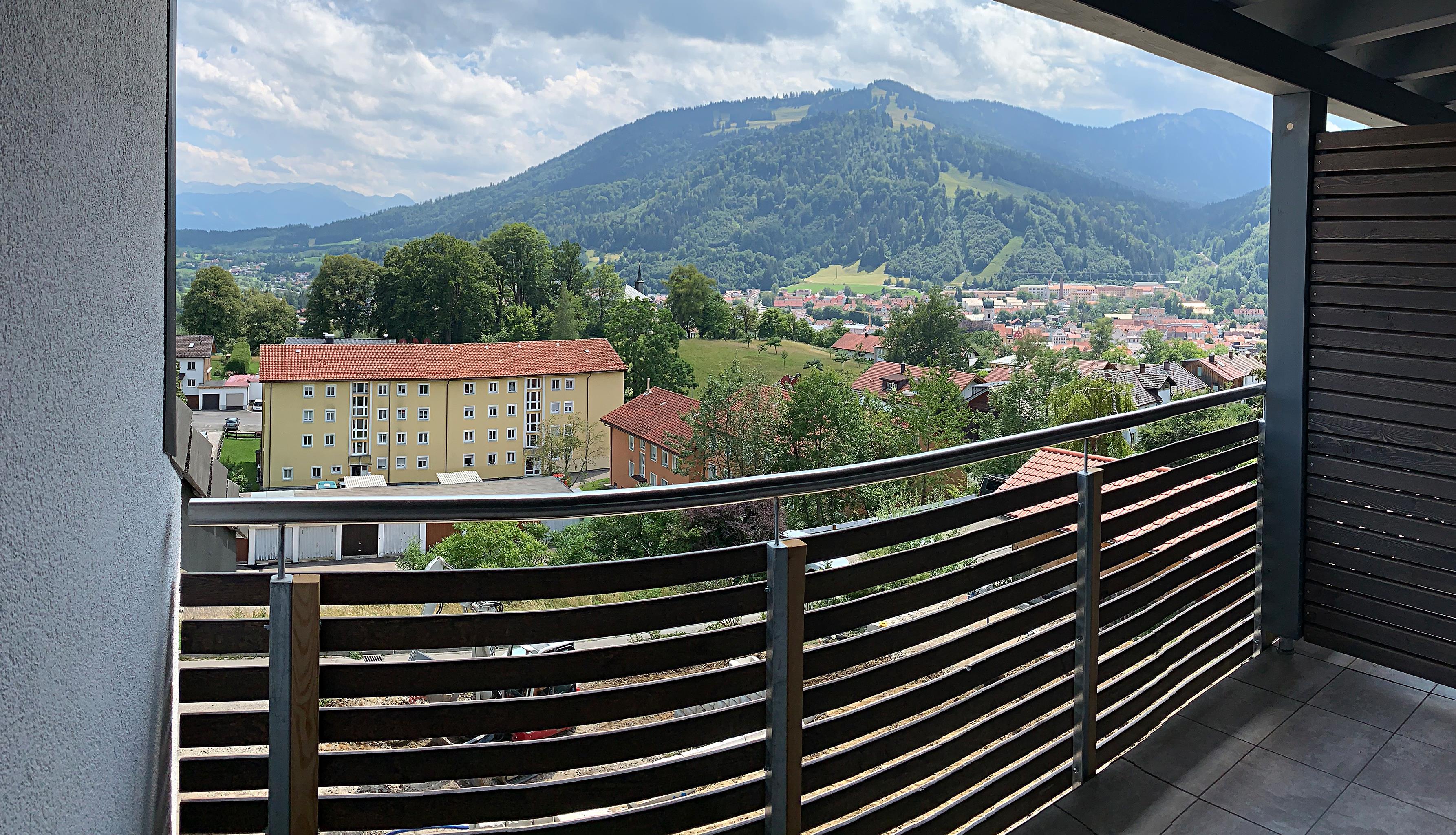 Vom Wohnzimmer gelangen Sie auf unsern Panorama Balkon, hier genießen Sie die großartige Aussicht über die Oberallgäuer Berge.