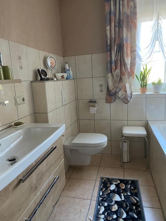 Das Badezimmer verfügt über eine Badewanne mit Duschmöglichkeit