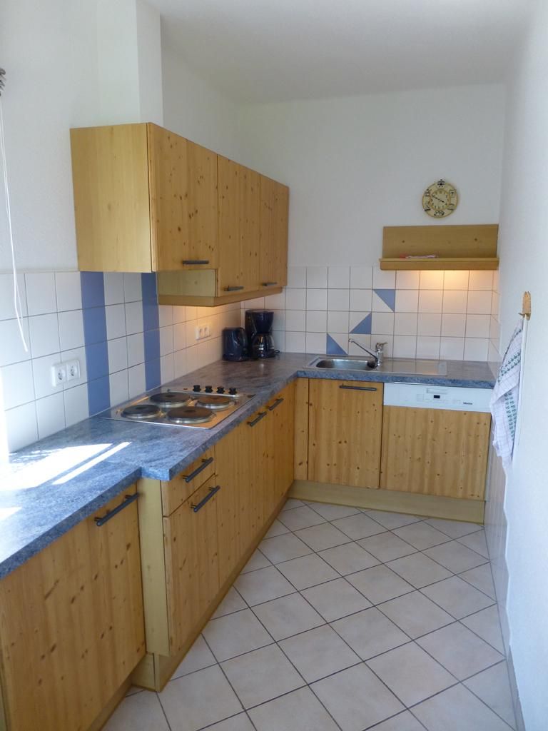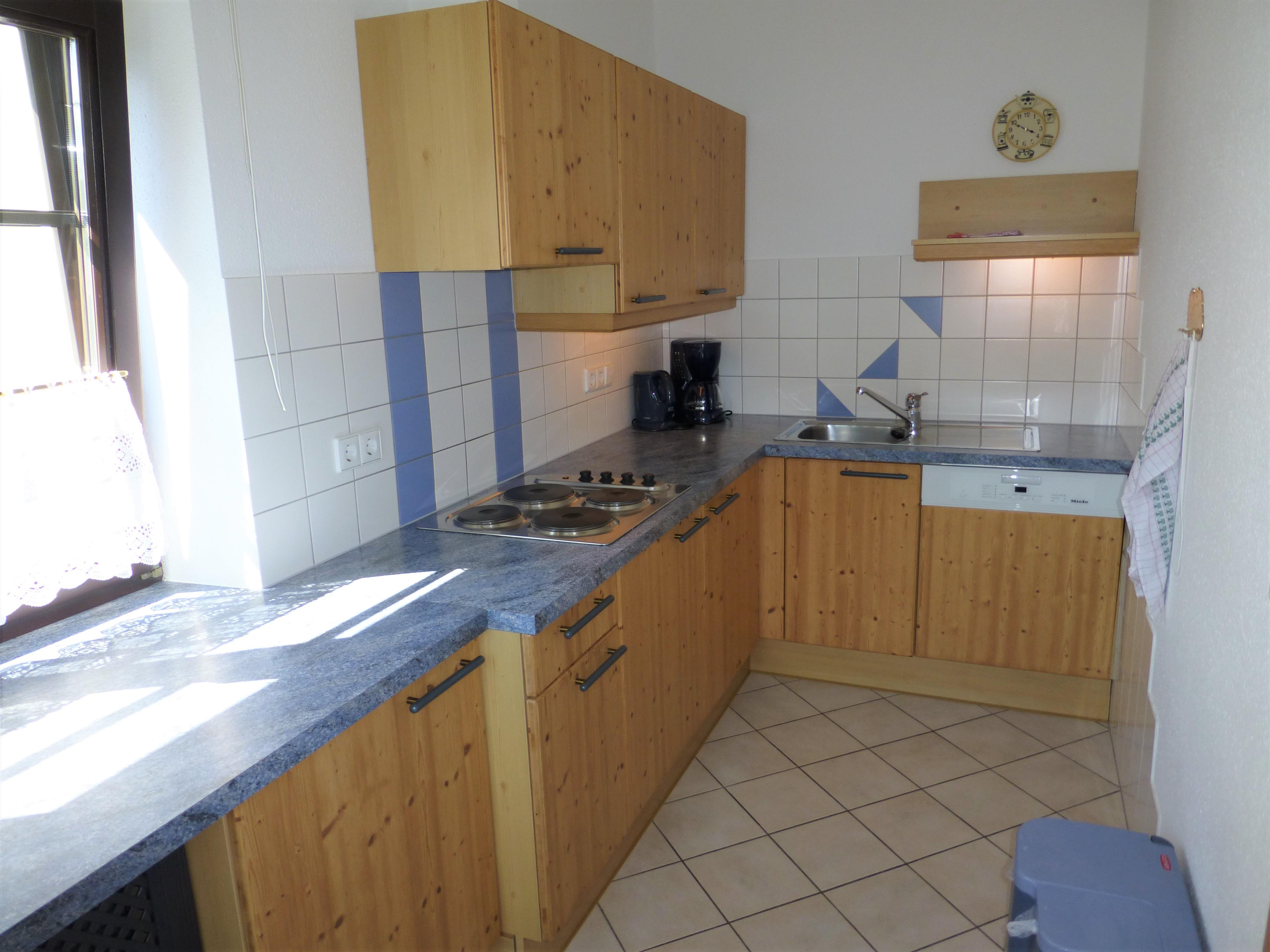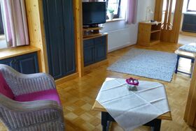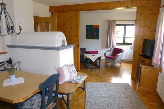 Ferienwohnung für 2 bis 3 Personen, große eigene Südterrasse (ca. 20m²) mit Seeblick, 1 Schlafzimmer; 1 Wohnschlafzimmer mit Schiebetrennwand aus Massivholz und 1 Wohn/Essraum mit Kachelofen(Bild), TV/SAT und WLAN, 1 Küche mit Geschirrspüler und kompletter Ausstattung,1 Dusche, 1 WC,1 Vorraum; Wohnungsgröße ca.55m².