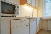 Voll ausgestatte Küche mit Geschirrspüler, Herd, Backrohr, Mikrowelle und Kühlschrank.
