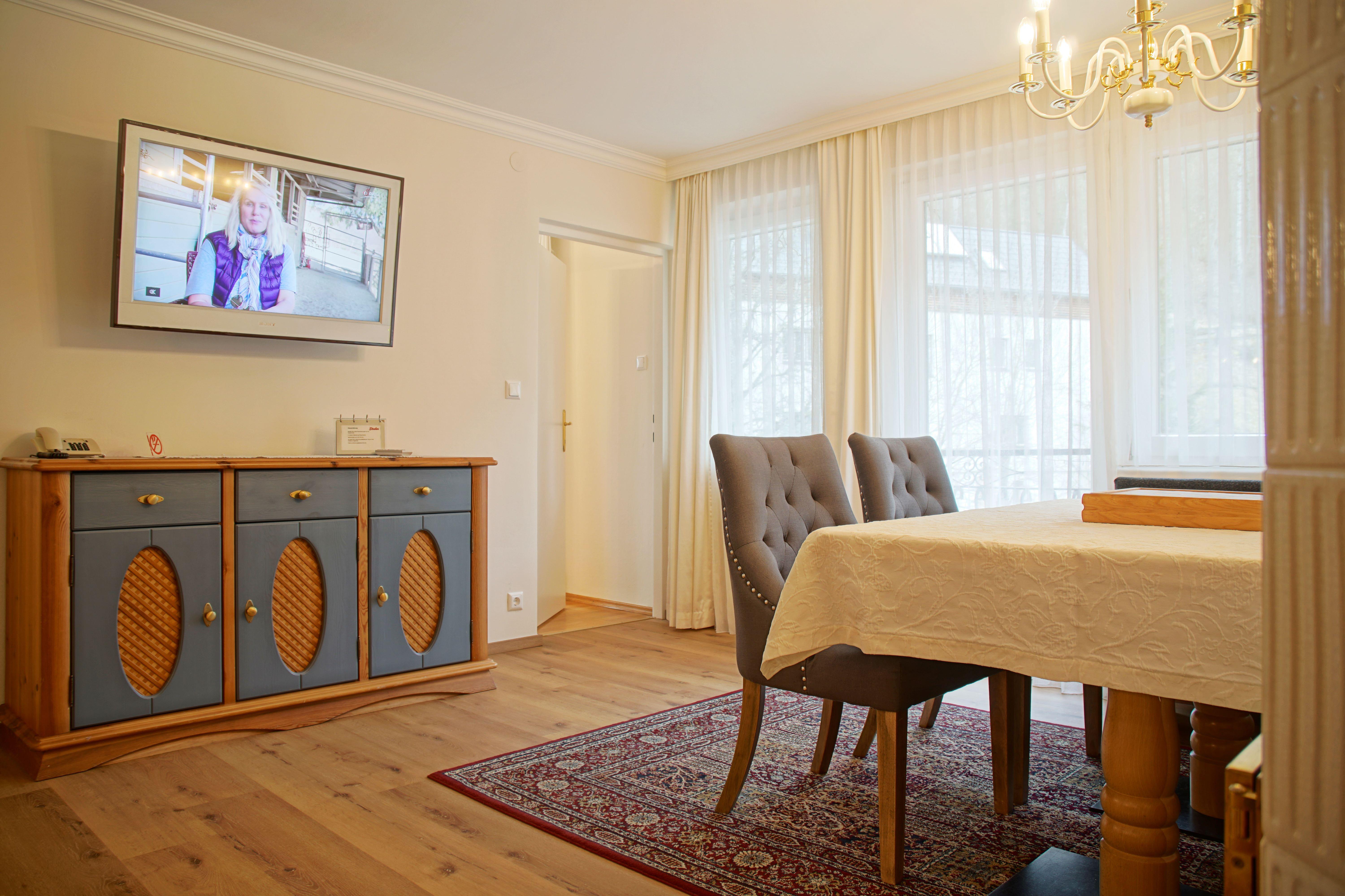 Großzügiges Wohn- und Esszimmer mit Schlafsofa und Kachelofen.