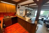 Offene Küche mit Dampfabzug, mit 4-Plattenherd, Kühlschrank mit Tiefgefrierfach,