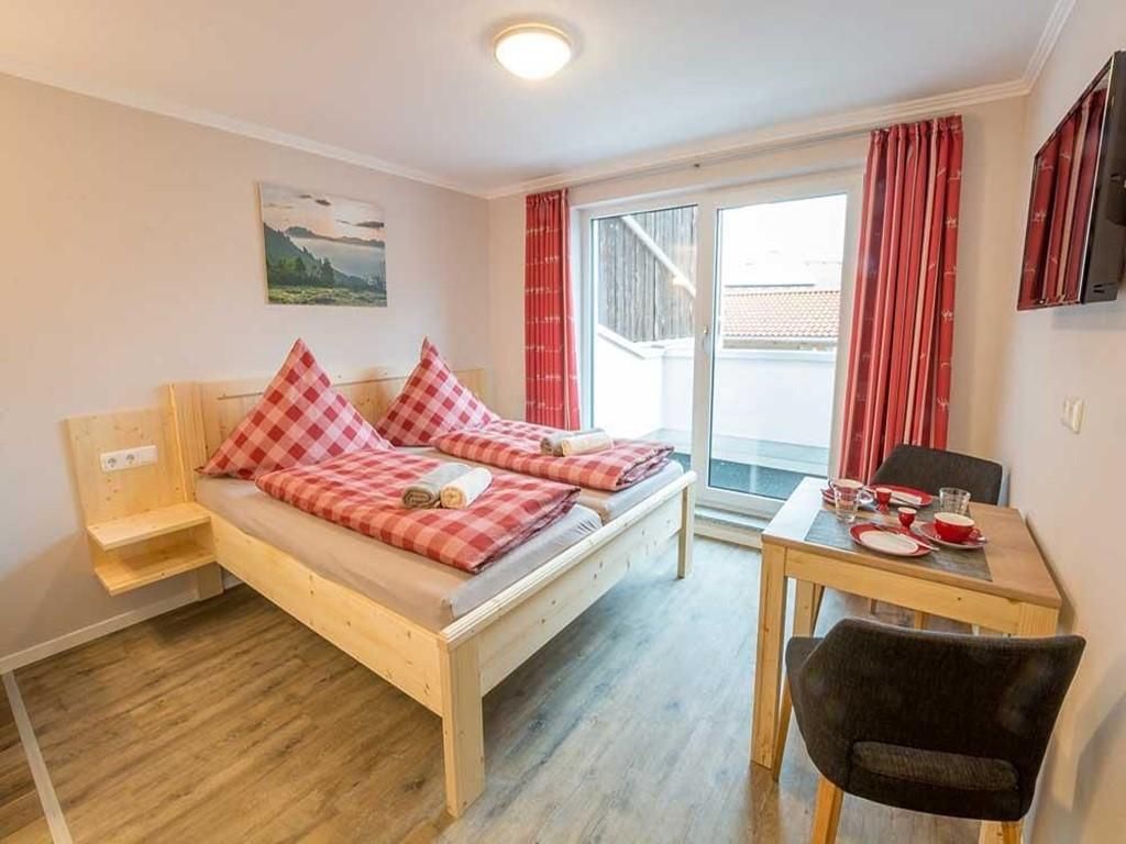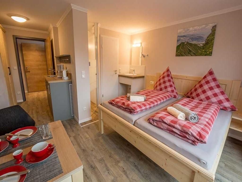Kuschliges, komfortables Zimmer für 1-2 Personen, ruhig und sonnig mit Blick auf den Wächter des Allgäus direkt aus dem Bett, neuem Dusch- und Sanitärbereich, kleine Pantry für einen Kaffee oder Tee zwischendurch. Etwa 19 qm großes Doppelzimmer mit etwa 2,5 qm großem Balkon.