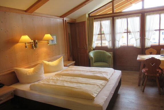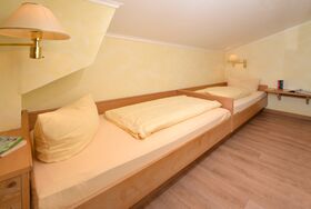 Wir bieten Ihnen gemütliche und ruhig gelegene Zimmer (WLAN, Kabel-TV, CD-Player, Fön, Mikrowelle). Die Familienzimmer verfügen über ein Schlafzimmer mit 2 Einzelbetten (hintereinander) und ein Schlafzimmer mit einem französischen Bett, eine Kochnische und ein Badezimmer mit Wanne. Im Preis inbegriffen sind Bettwäsche, Handtücher, Geschirrtücher sowie die Endreinigung. Auf Wunsch bieten wir auch Brötchenservice oder Frühstücksbuffet an. Die Familienzimmer befinden sich im 2. Stock mit Balkon.