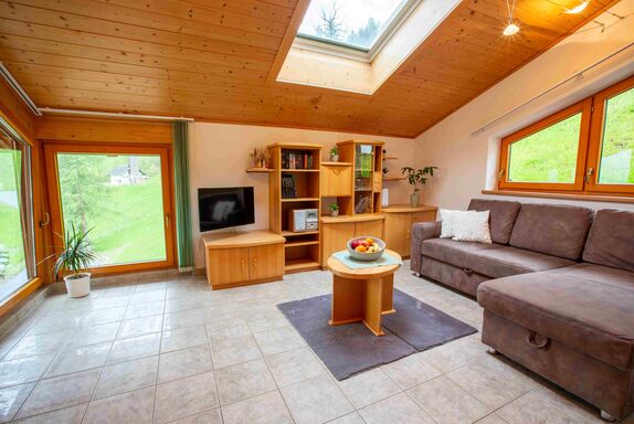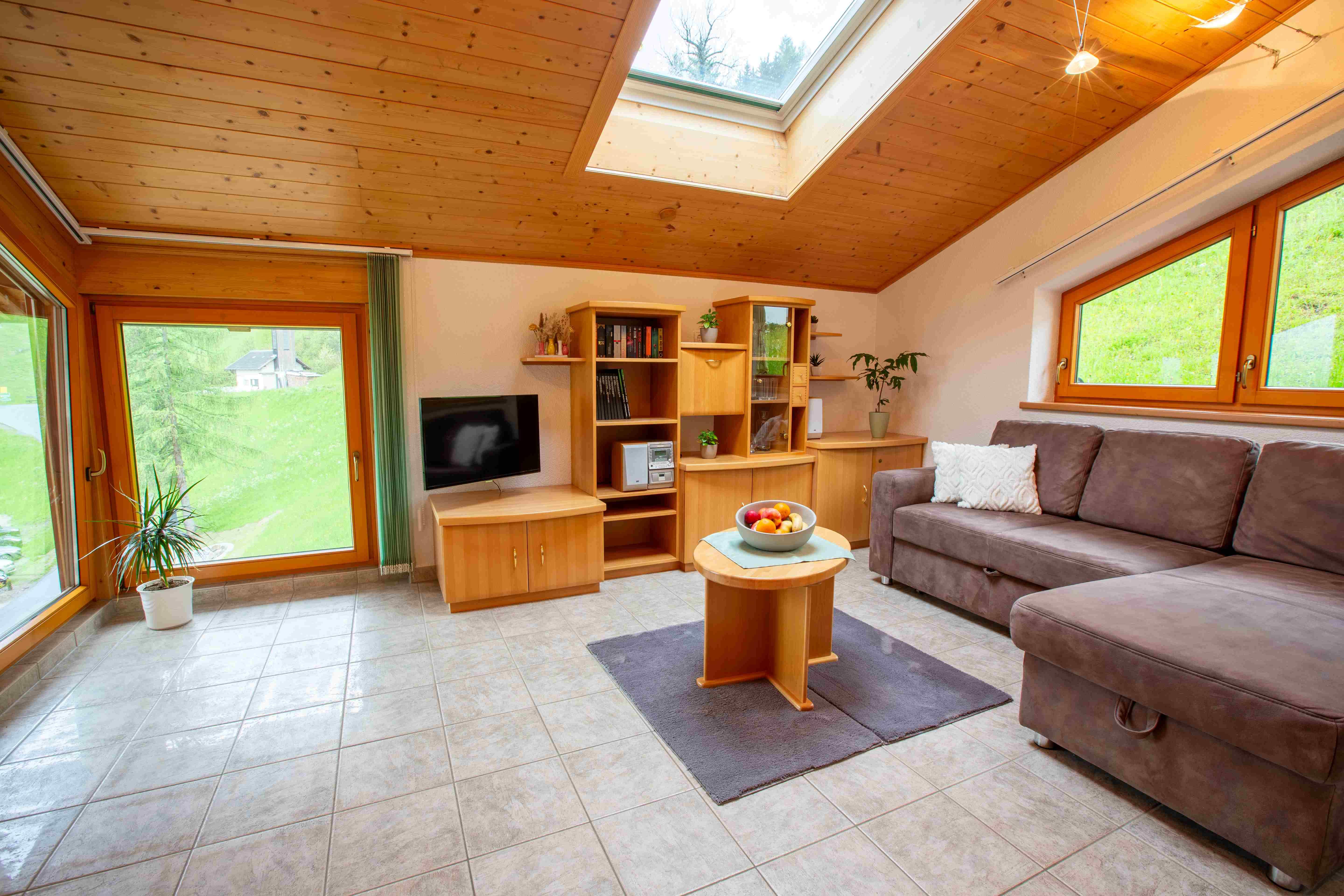 Komfortabel ausgestatte Ferienwohnung mit ca. 45 m². Geräumiges Wohn- und Esszimmer mit Kochgelegenheit, ein Doppelzimmer mit Blick durchs Lesachtal und ein Badezimmer mit Dusche und WC. Durch die Ausziehfunktion des Sofas im Wohnbereich bietet die Wohnung Platz für 2 - 4 Personen. Eigene Liegeterrasse zum Genießen von ruhigen Stunden. Frühstück, Brötchenservice oder Abendessen (im Rahmen der Halbpension oder á-la-carte) möglich. Produkte aus der eigenen biologischen Landwirtschaft erhältlich.