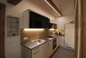 Eine Küchenzeile mit Ceranfeld, Backofen, Geschirrspüler, großem Kühlschrank mit Gefrierfach, Wasserkocher, Mikrowelle, Kaffeemaschine, Kapsel-Kaffeemaschine (Kapsel gegen eine geringe Gebühr bei uns zu erwerben), reichlich Besteck und Geschirr. Handtücher, Geschirrtücher und Bettwäsche inklusive.