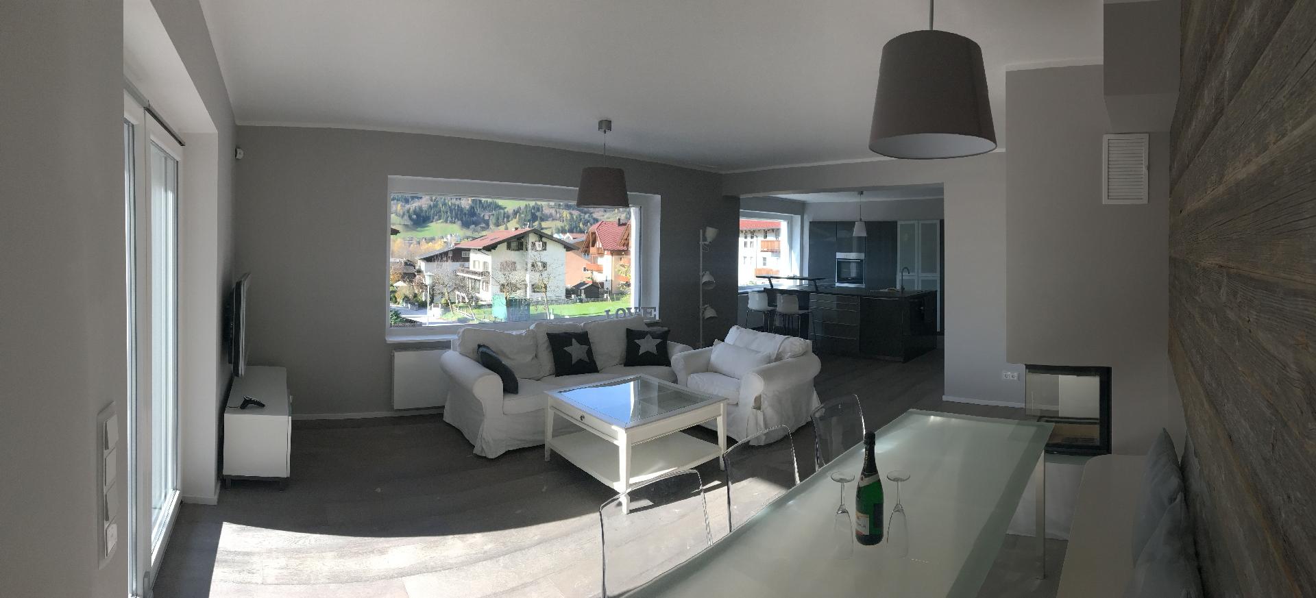• Couch- und Fernsehecke direkt am Panoramafenster mit Blick auf die Hausberge